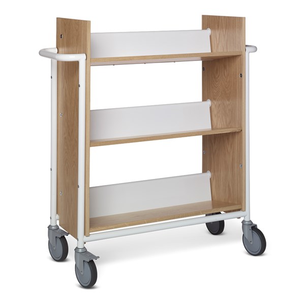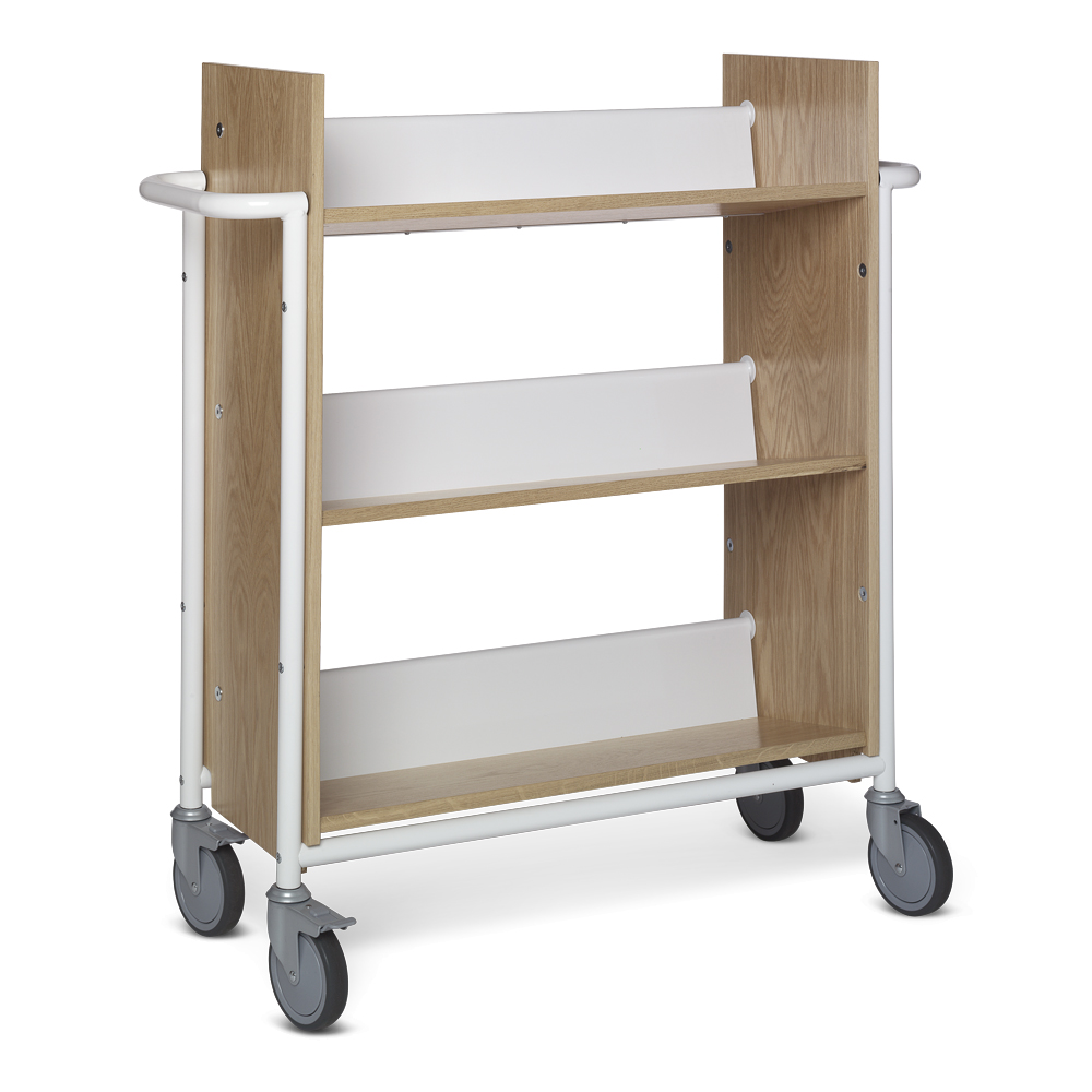 Vognen er rummelig, både hvad angår dybden og afstanden mellem hylderne og kan bruges både til alle størrelser bøger og ringbind.