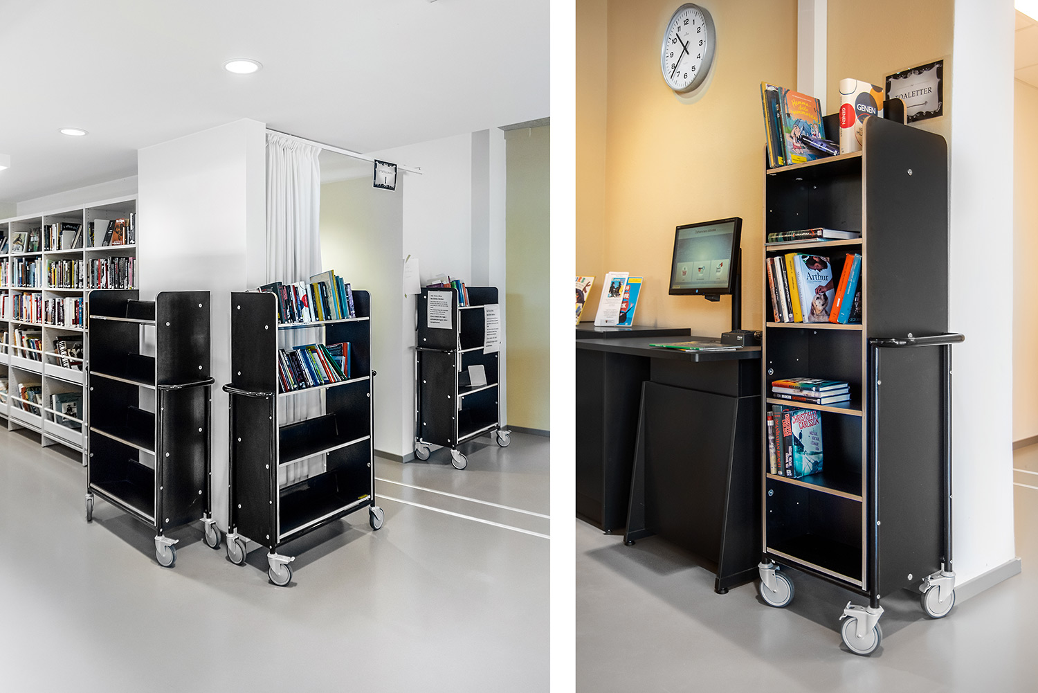 Denne bogvogn kan bruges som et mini reolsystem, der kan køres rundt i biblioteket efter behov.