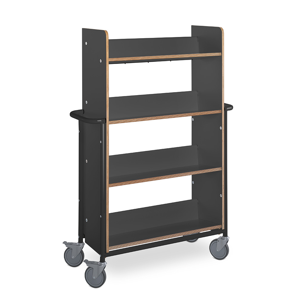 Funktionel, enkeltsidet vogn med 4 faste bagudvippede hylder, som sikrer stabil opbevaring. Vognen er rummelig, både hvad angår dybden og afstanden mellem hylderne og kan bruges både til alle størrelser bøger og ringbind.