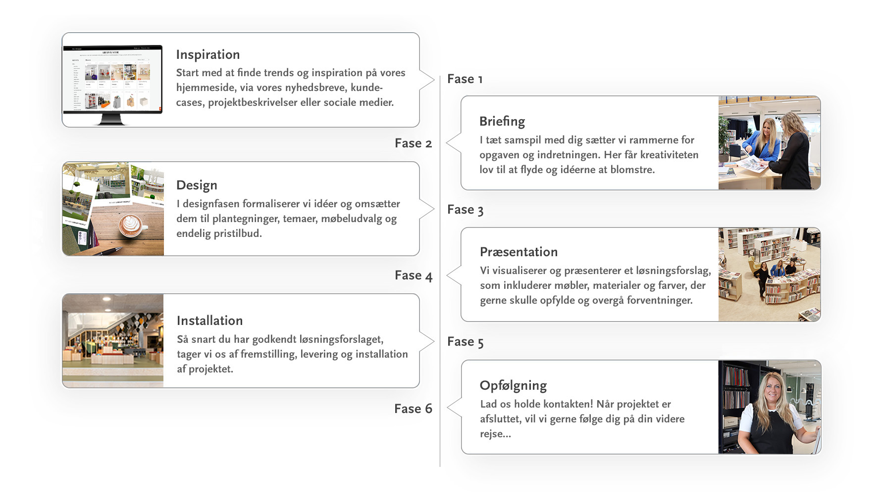 I løbet af en projektcyklus og vores 6-trins designproces kommer du blandt andet i kontakt med vores salgskonsulenter, indretningsarkitekter, produktudviklere, kundeservicemedarbejdere og installationspartnere.