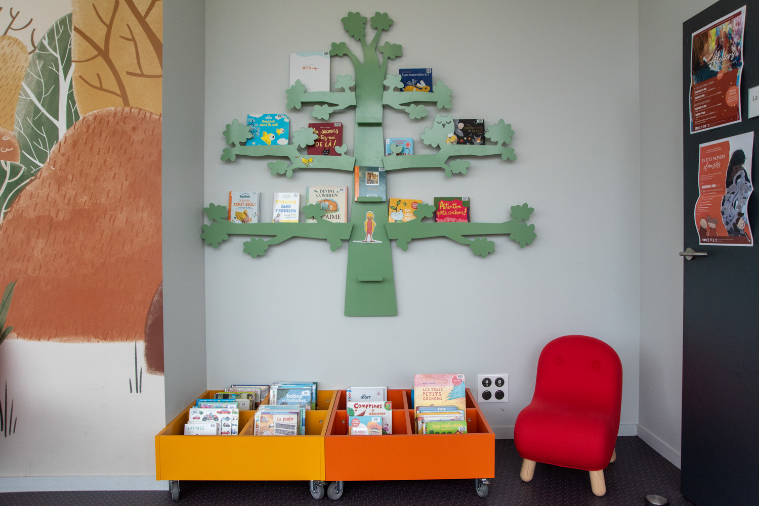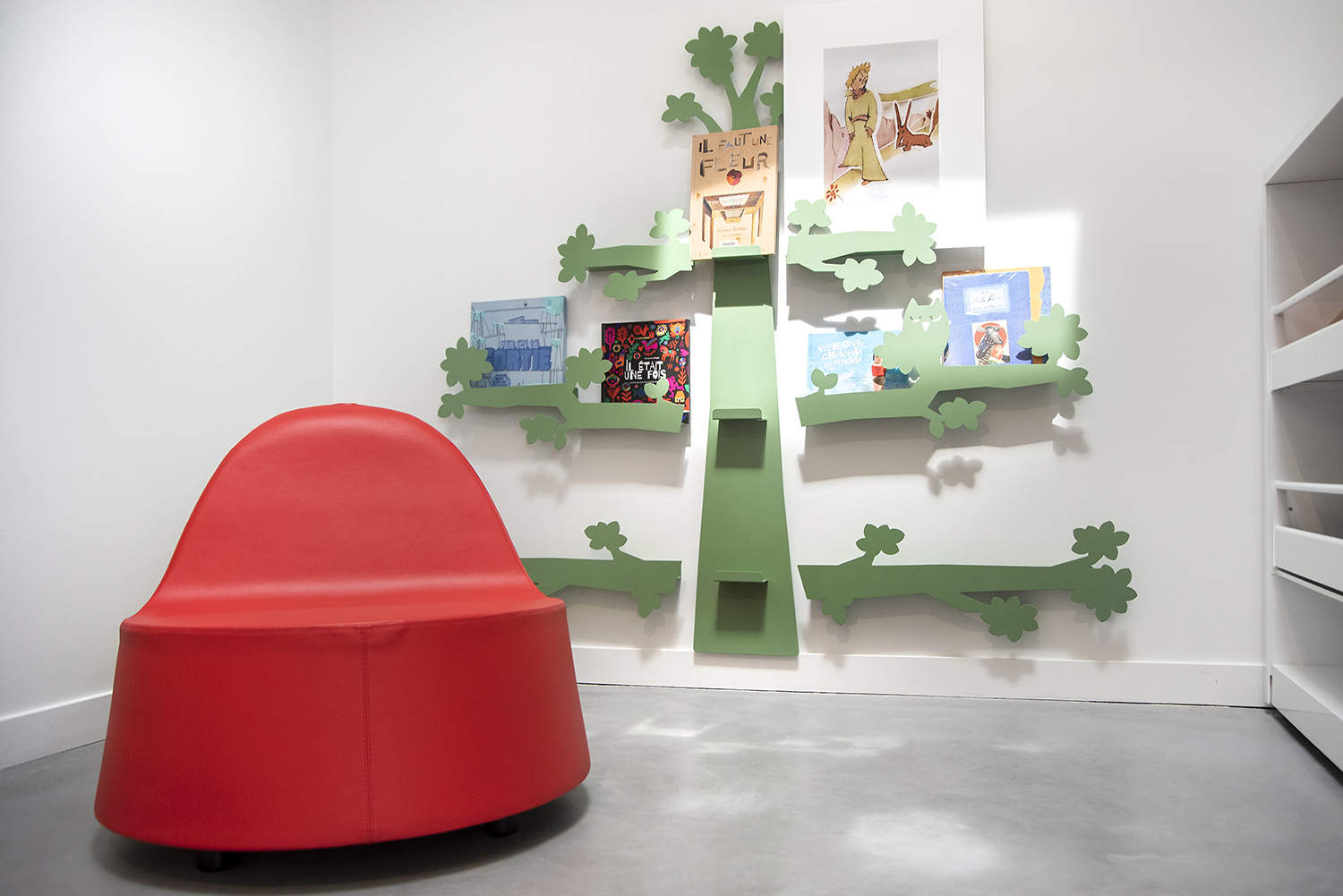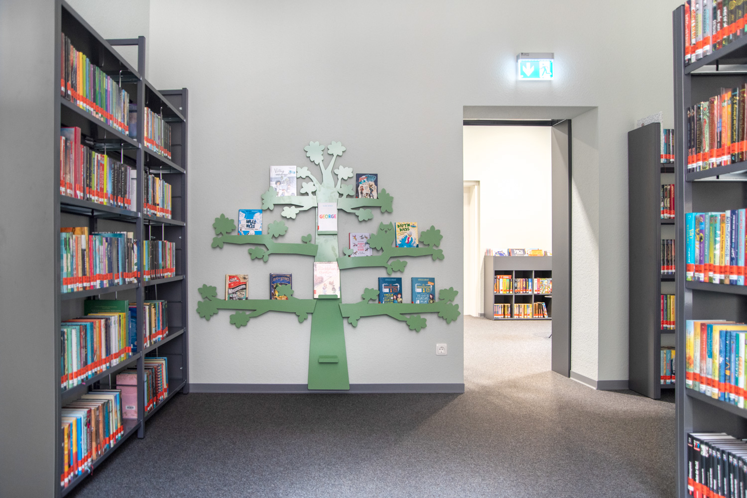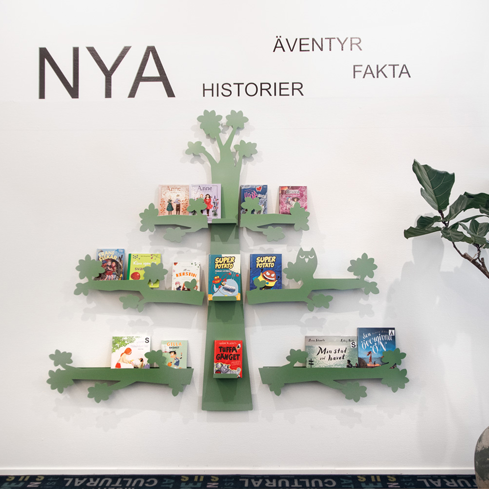 Fleksible og iøjnefaldende udstillingshylder til bøger og andre medier formet som et dekorativt træ.