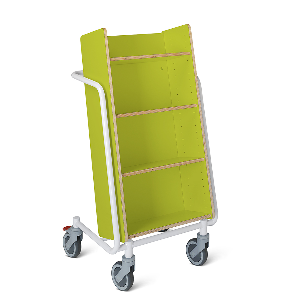 Enkeltsidet bogvogn med 4 hylder. 3 af hylderne er flytbare til forskellige mediestørrelser.