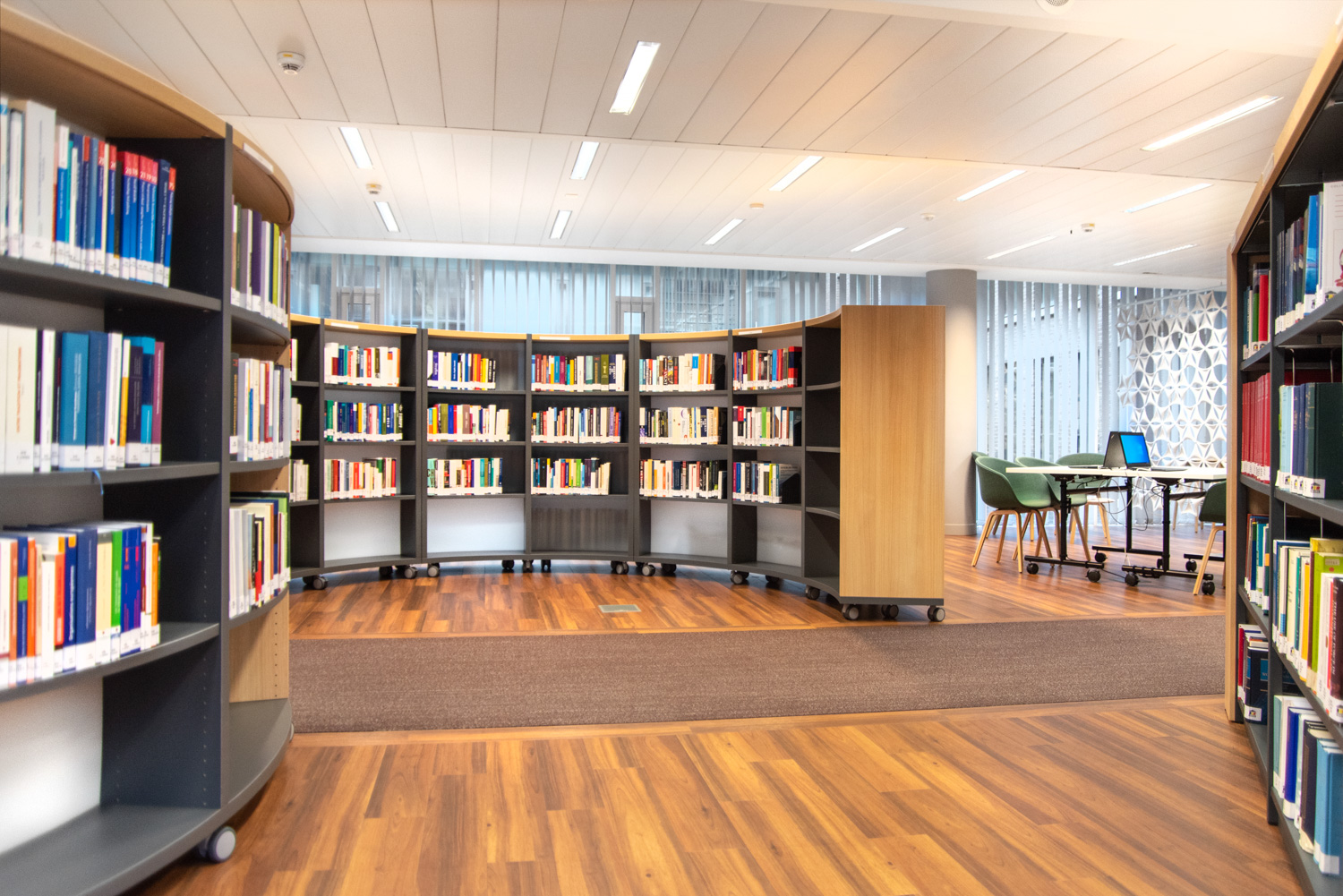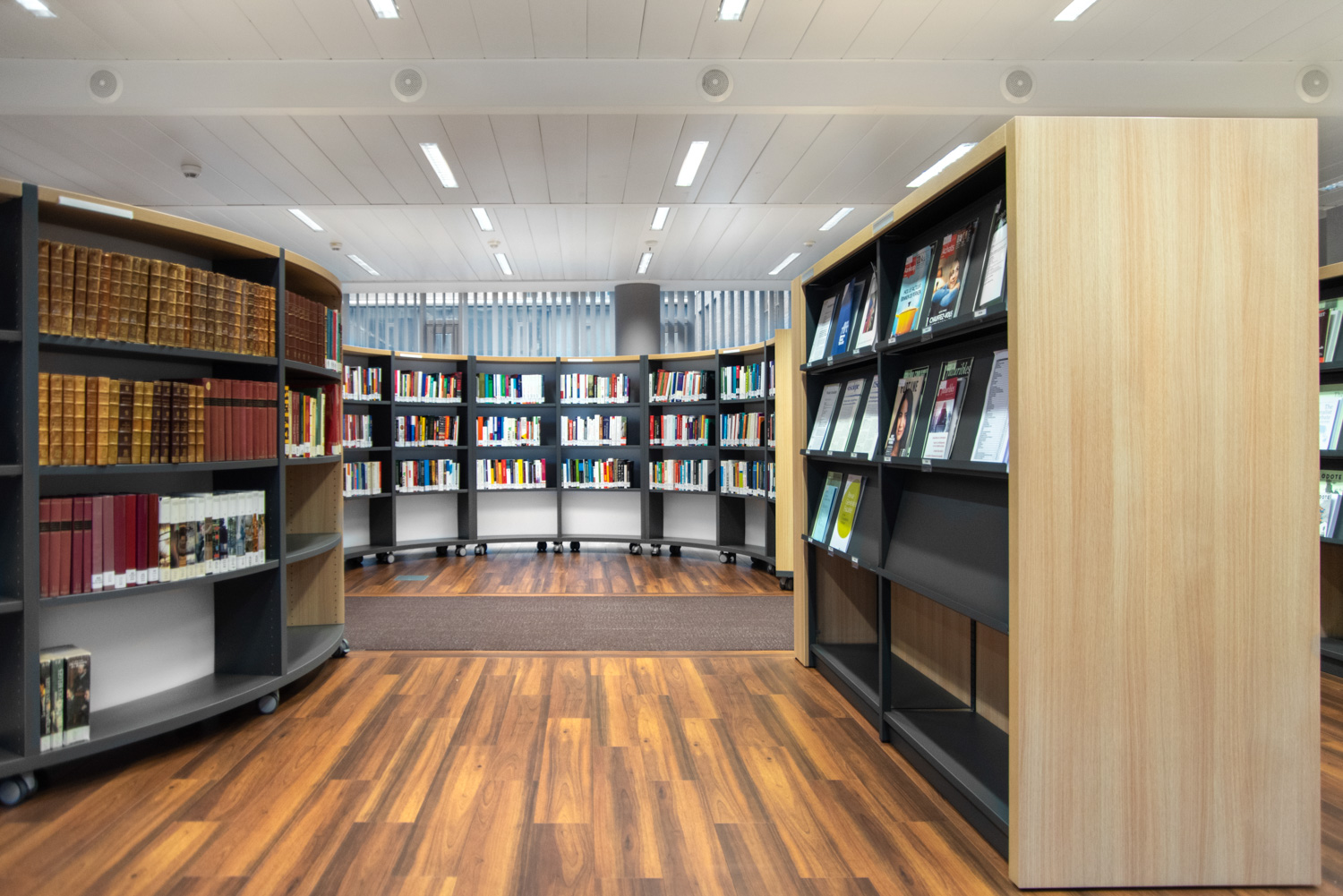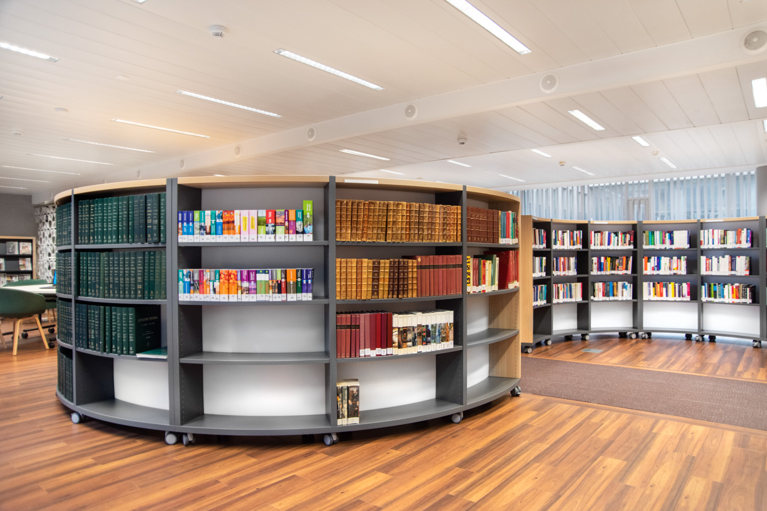 De runde reoler medvirker til, at indretningen føles behagelig og afslappende. De besøgende kan slå sig ned i en af de mange forskellige slags stole og lænestole. Farverne i biblioteket er varme og behagelige. Kombinationen mellem de udvalgte møbler og farver gør rummet til et behageligt hvileområde, hvor der kan tages en pause fra en travl hverdag.