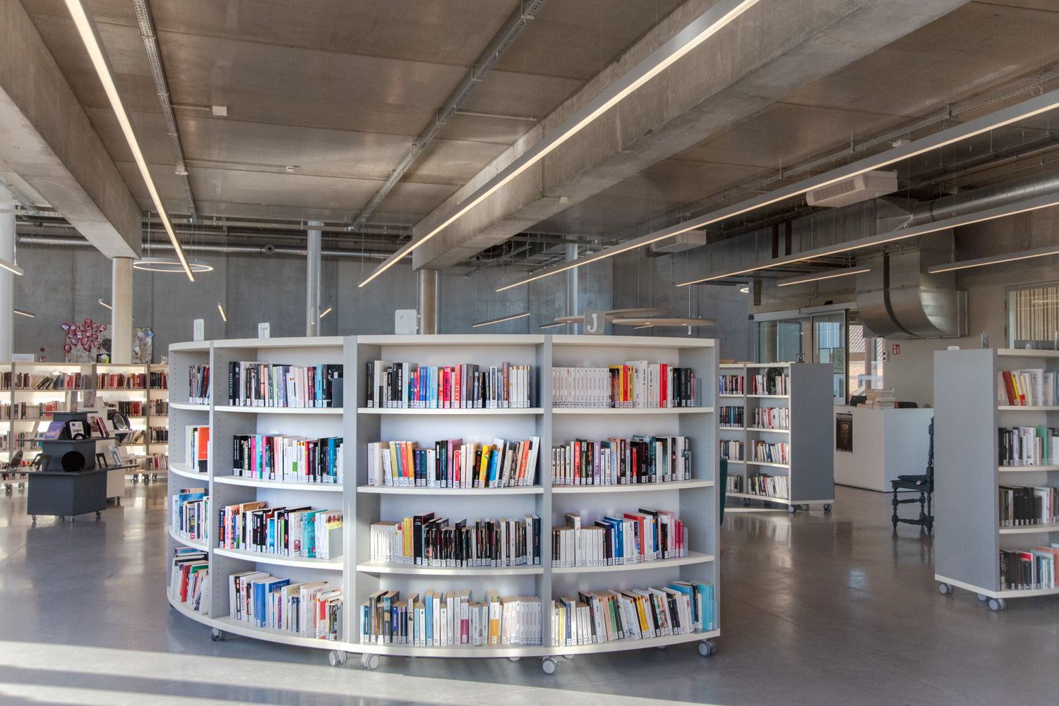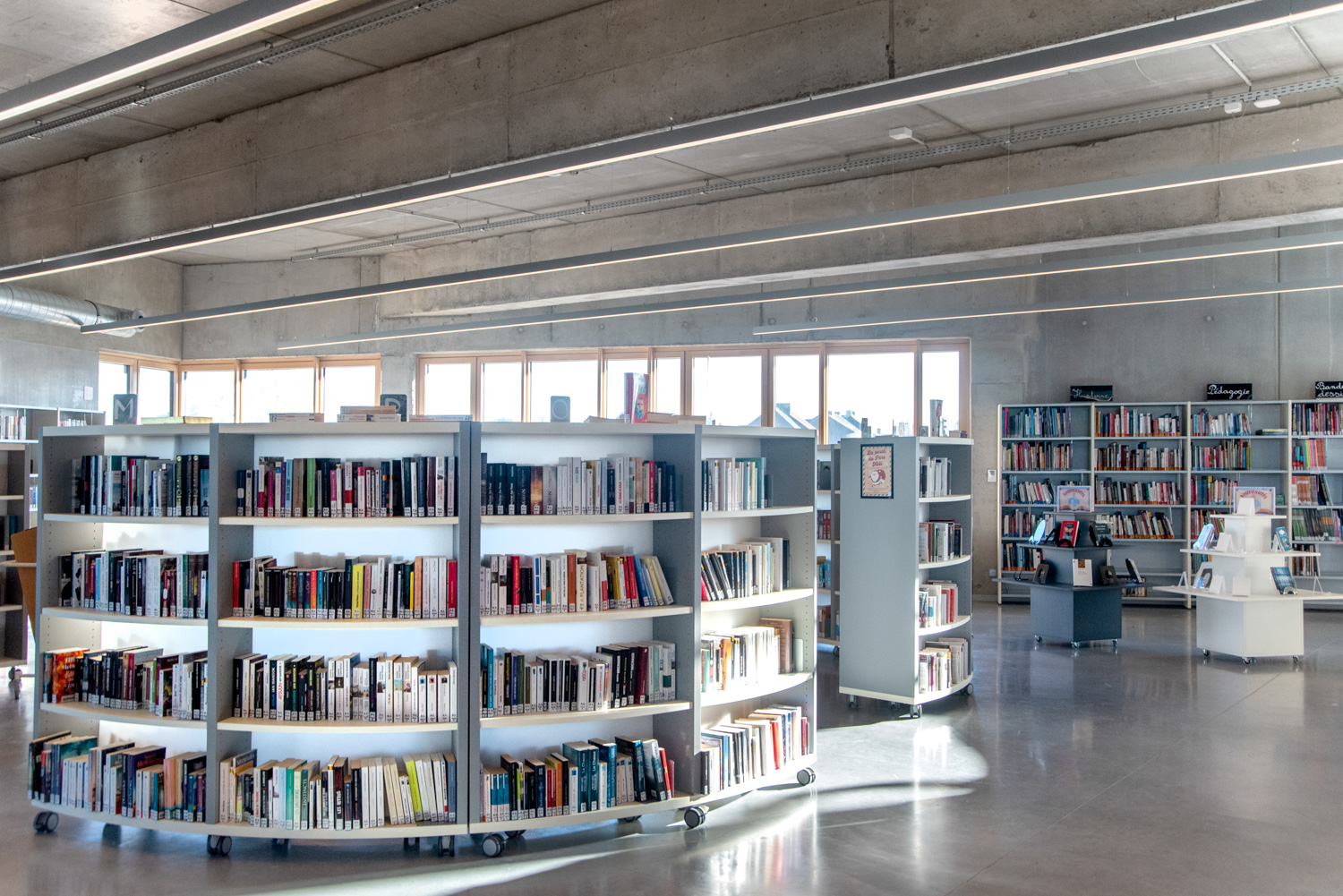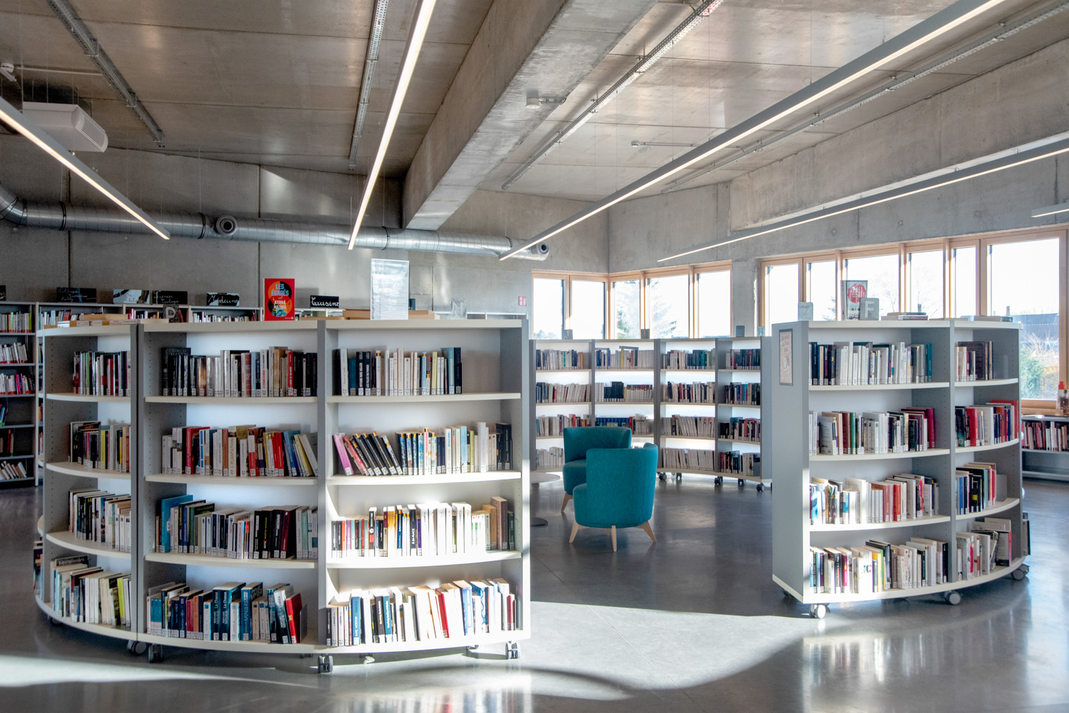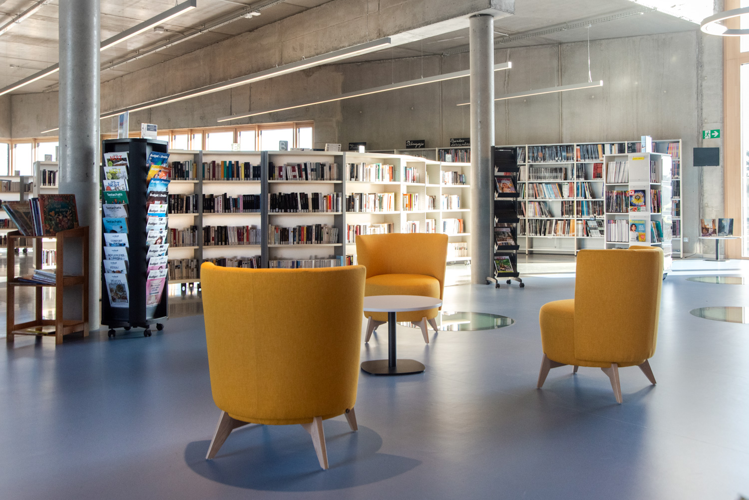 Bibliotekets rummelige og indbydende atmosfære opfordrer besøgende til at slappe af og finde inspiration. Med en blanding af lige og runde reolsystemer, specialdesignede møbler til både børn og voksne og en harmonisk farvepalette, der falder godt ind med bygningens træ- og betonelementer, fremstår bøger og andre medier på en flot måde.