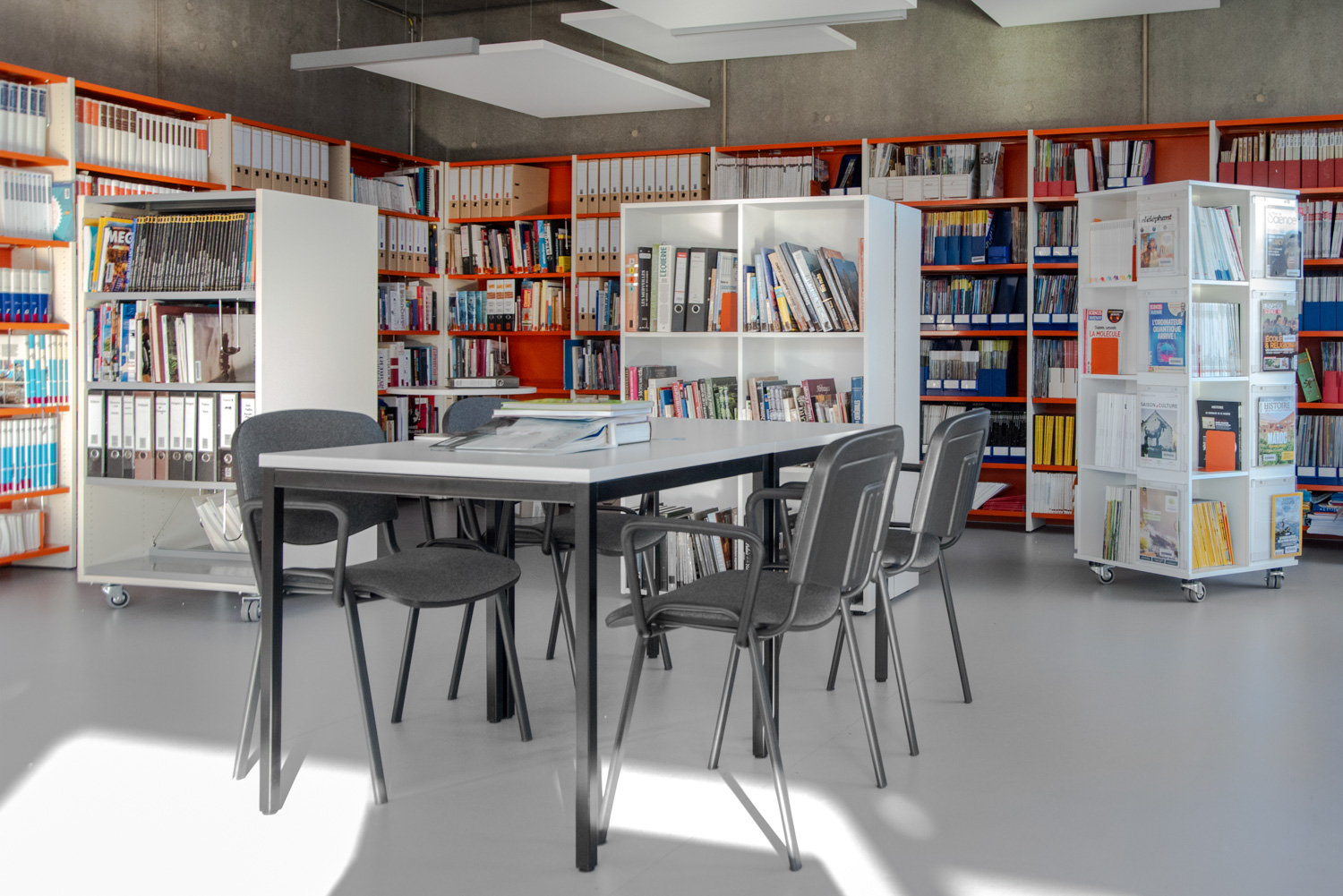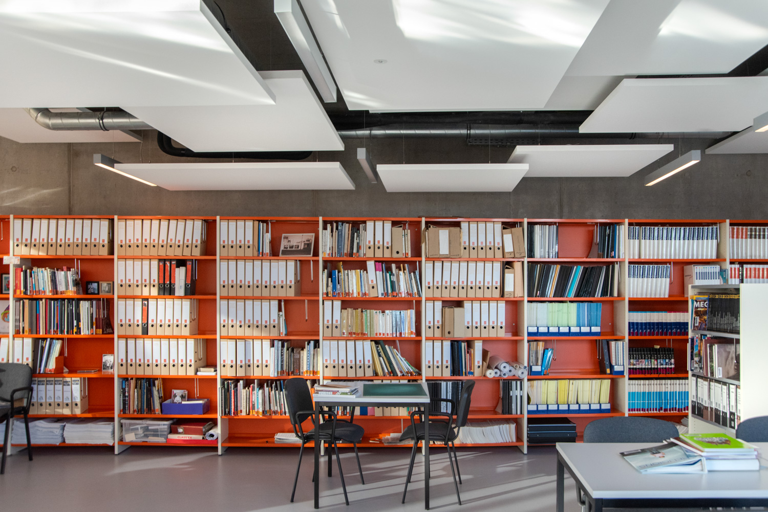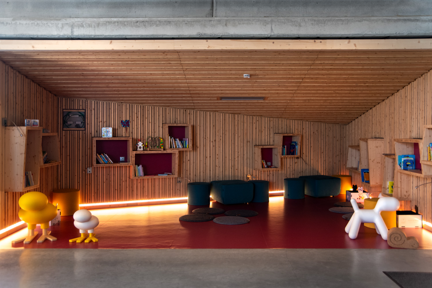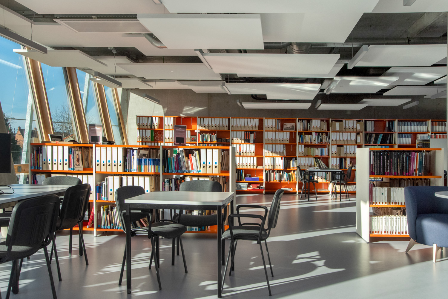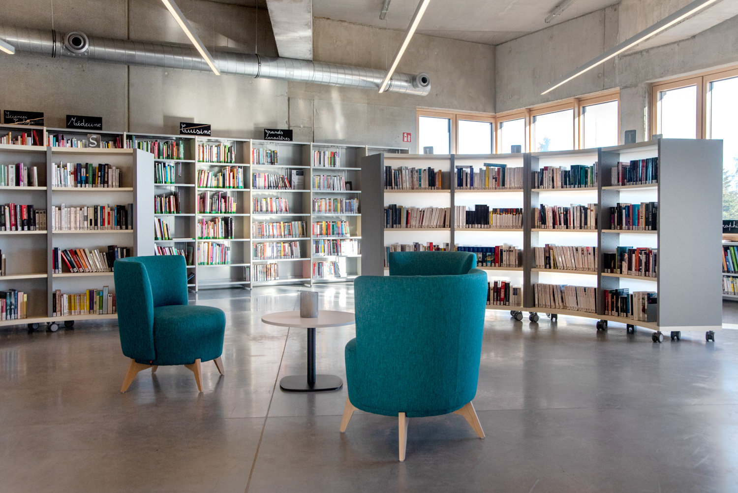 Bibliotekets rummelige og indbydende atmosfære opfordrer besøgende til at slappe af og finde inspiration. Med en blanding af lige og runde reolsystemer, specialdesignede møbler til både børn og voksne og en harmonisk farvepalette, der falder godt ind med bygningens træ- og betonelementer, fremstår bøger og andre medier på en flot måde.