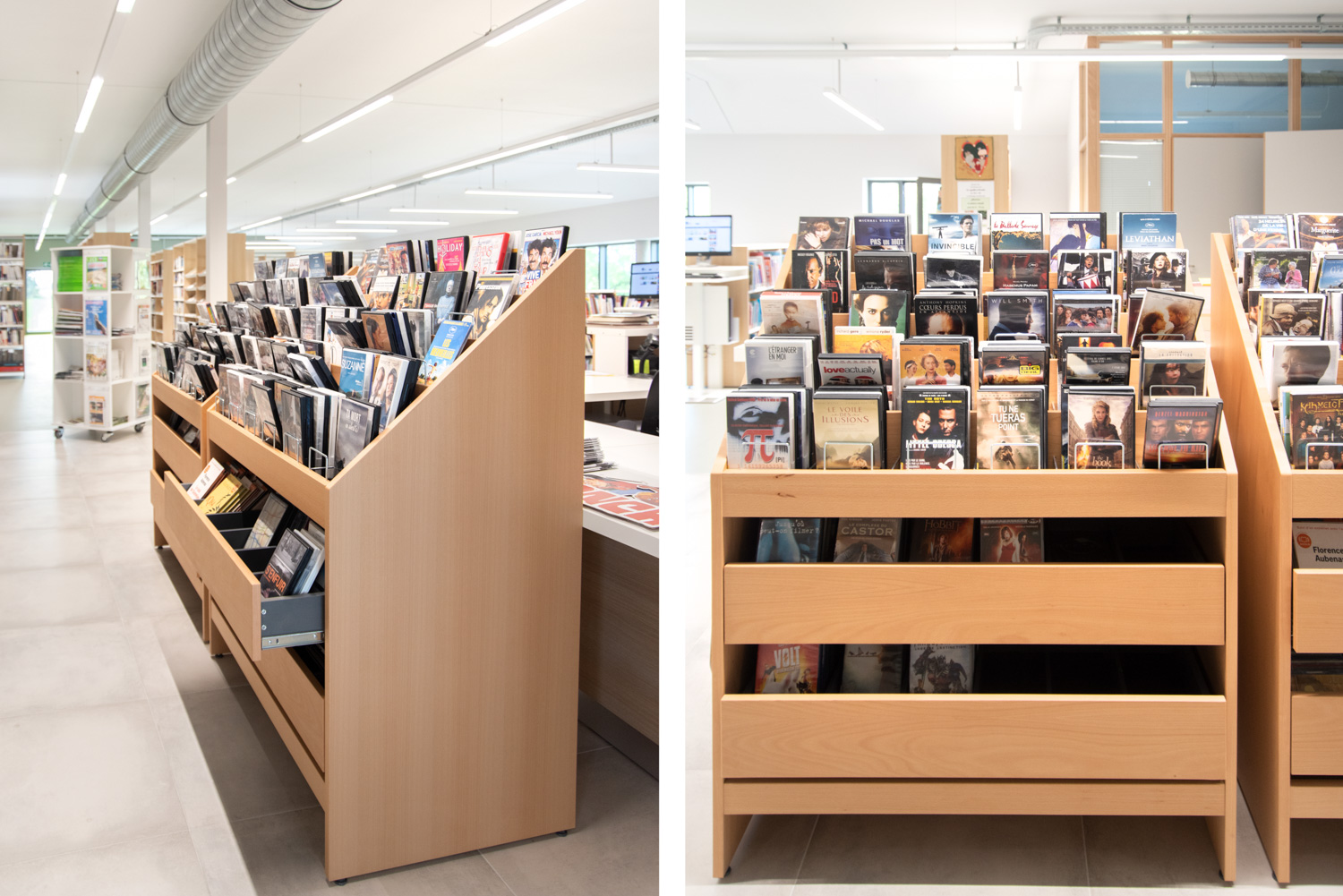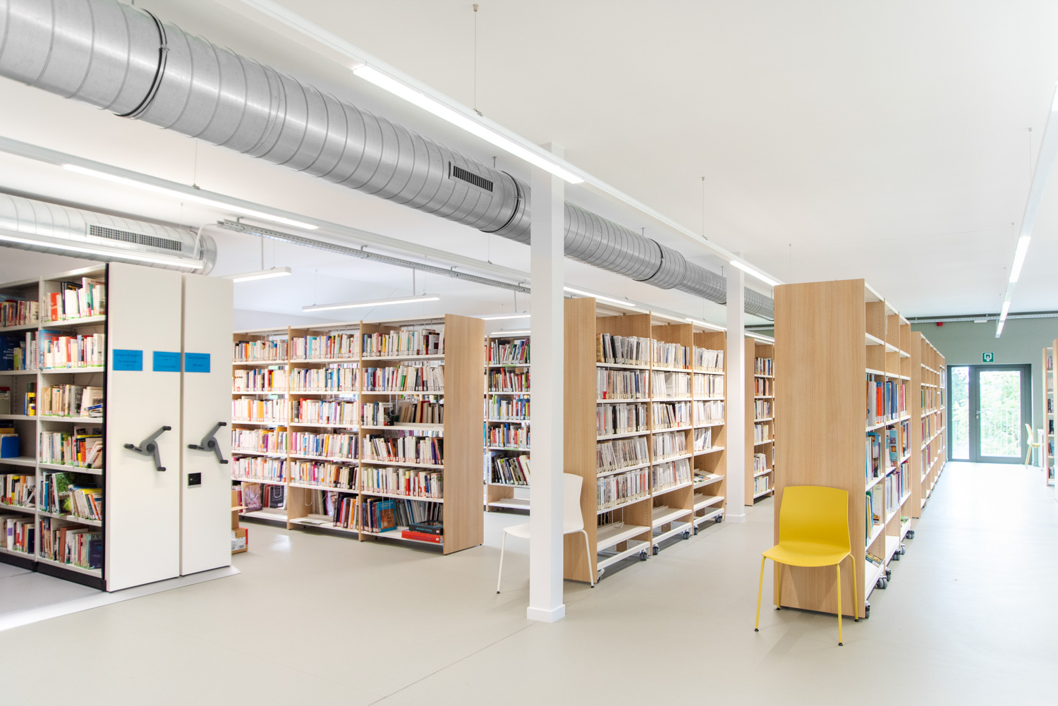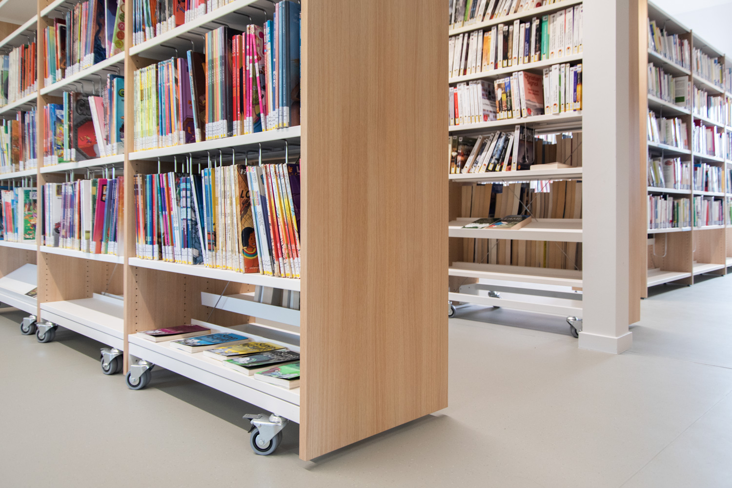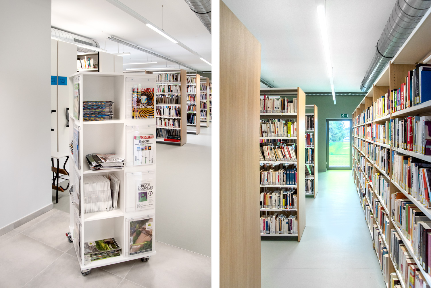 Florenville Bibliotek er en del af et kommunalt projekt, som har et mål om at bringe forskellige aktører sammen i den samme bygning. Ved indgangen står en stor skranke med nem adgang for folk med nedsat mobilitet. Reolsystemerne i træ fremstår i flot kombination med de farverige siddemøbler.