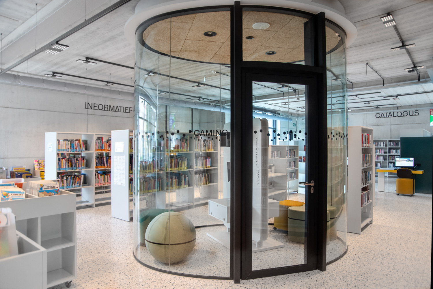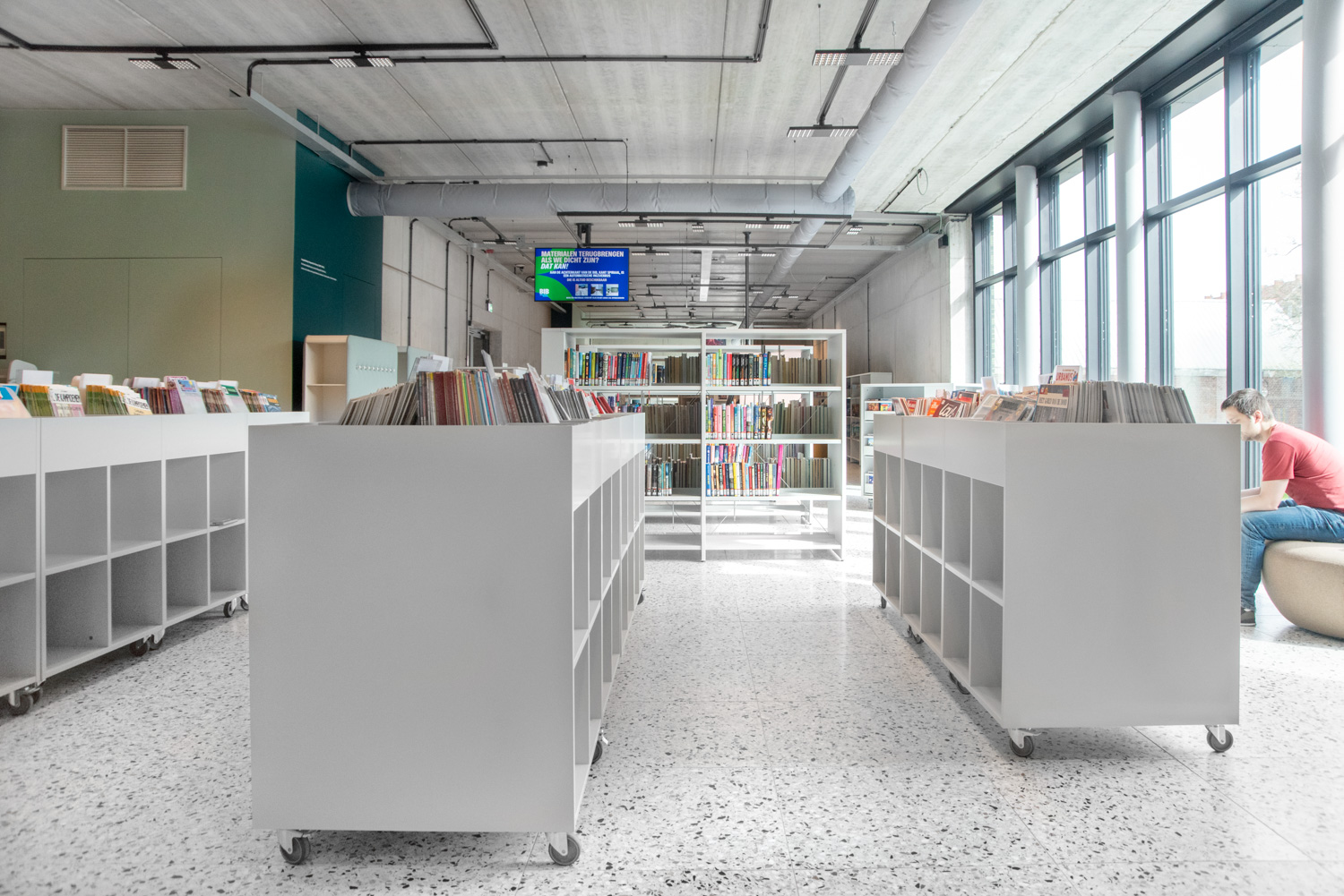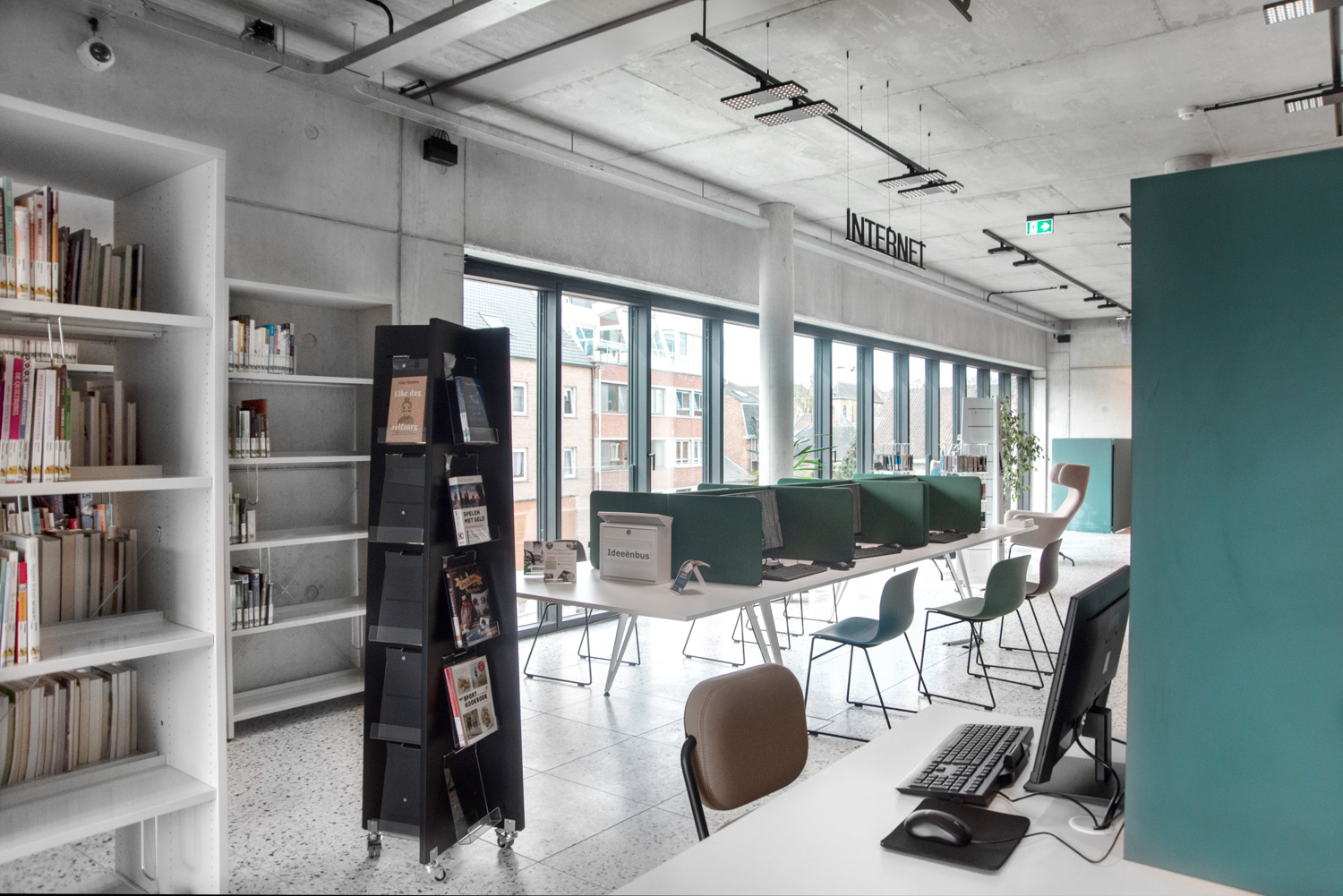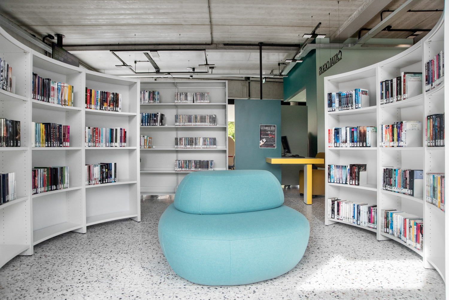 Lys og god plads er centrale elementer i det nye bibliotek i Geraardsbergen. Biblioteket er mere end blot et sted at låne bøger; det er et sted til læsning, studier, spil og meget mere. Der er mange siddemøbler at vælge imellem: borde og stole til arbejde eller studier, hyggelige og komfortable lænestole til afslapning og puffer, hvor man hurtigt kan slå sig ned med en god bog.