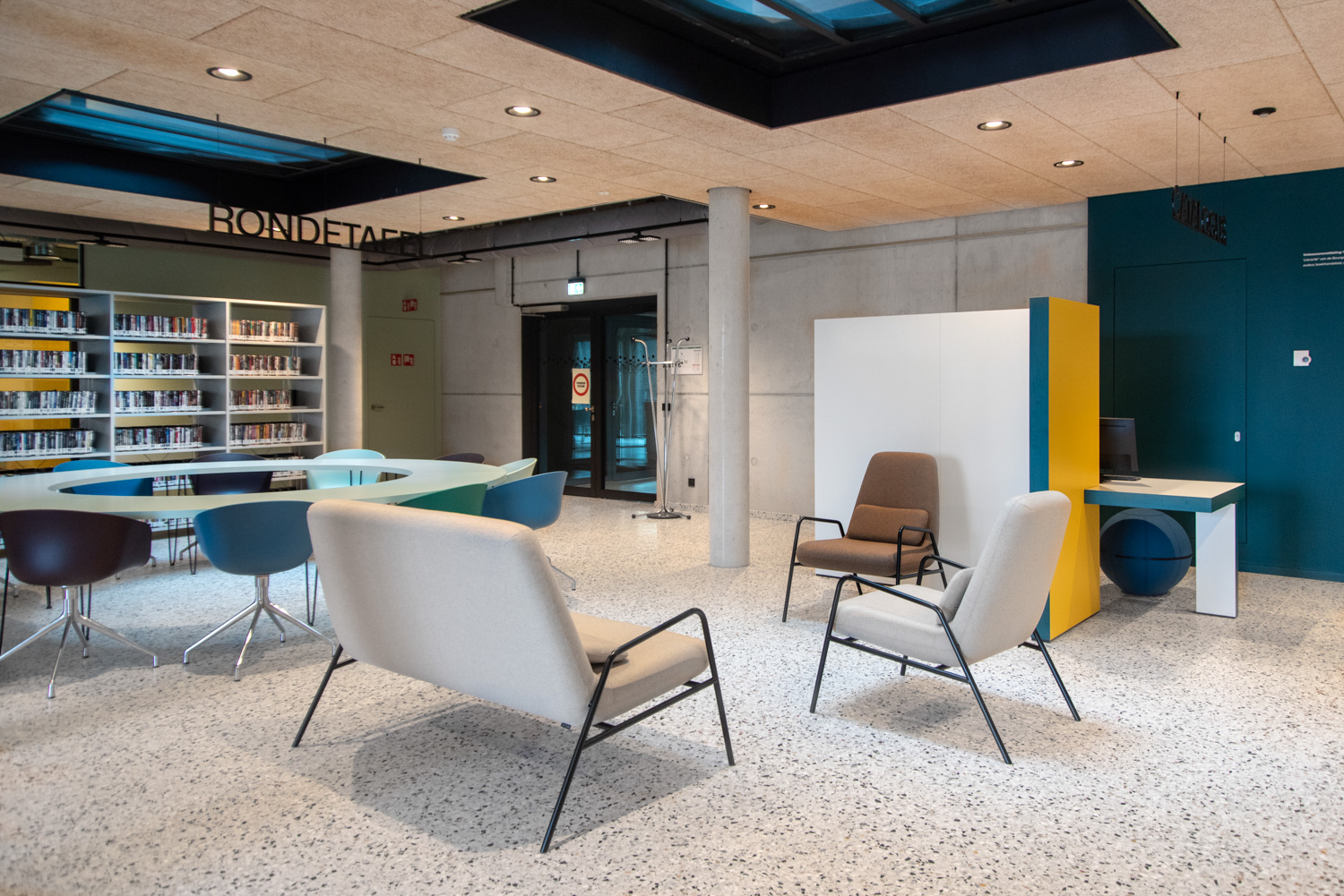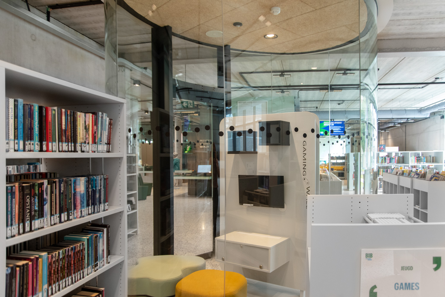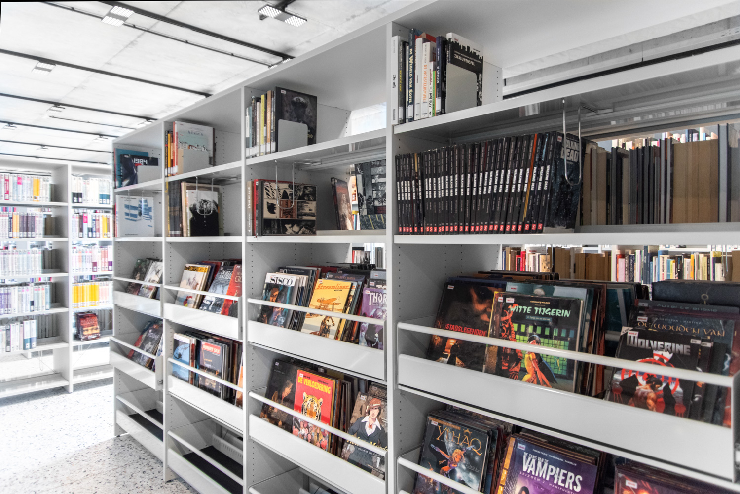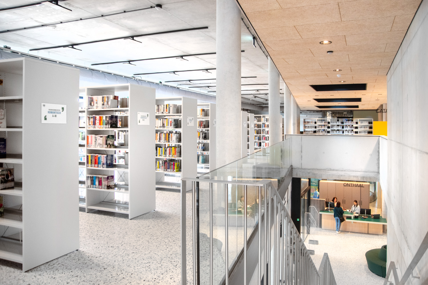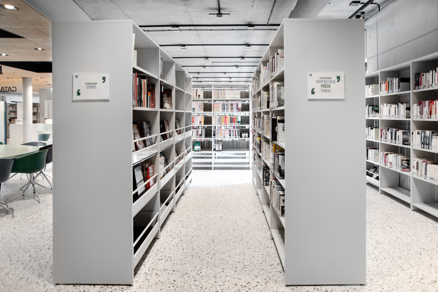 Lys og god plads er centrale elementer i det nye bibliotek i Geraardsbergen. Biblioteket er mere end blot et sted at låne bøger; det er et sted til læsning, studier, spil og meget mere. Der er mange siddemøbler at vælge imellem: borde og stole til arbejde eller studier, hyggelige og komfortable lænestole til afslapning og puffer, hvor man hurtigt kan slå sig ned med en god bog.