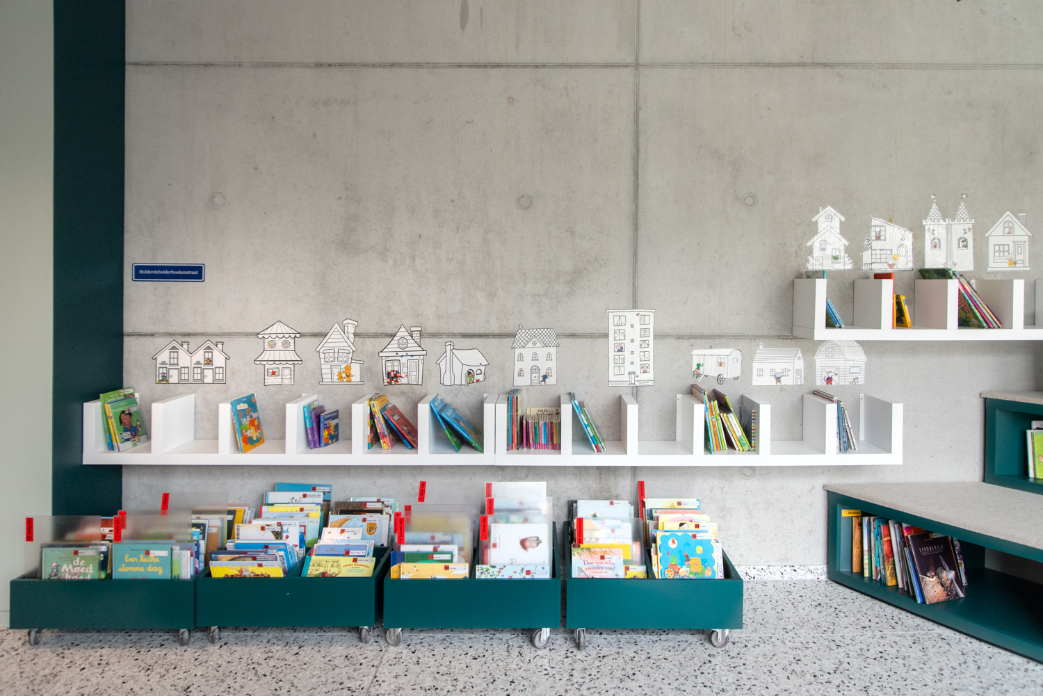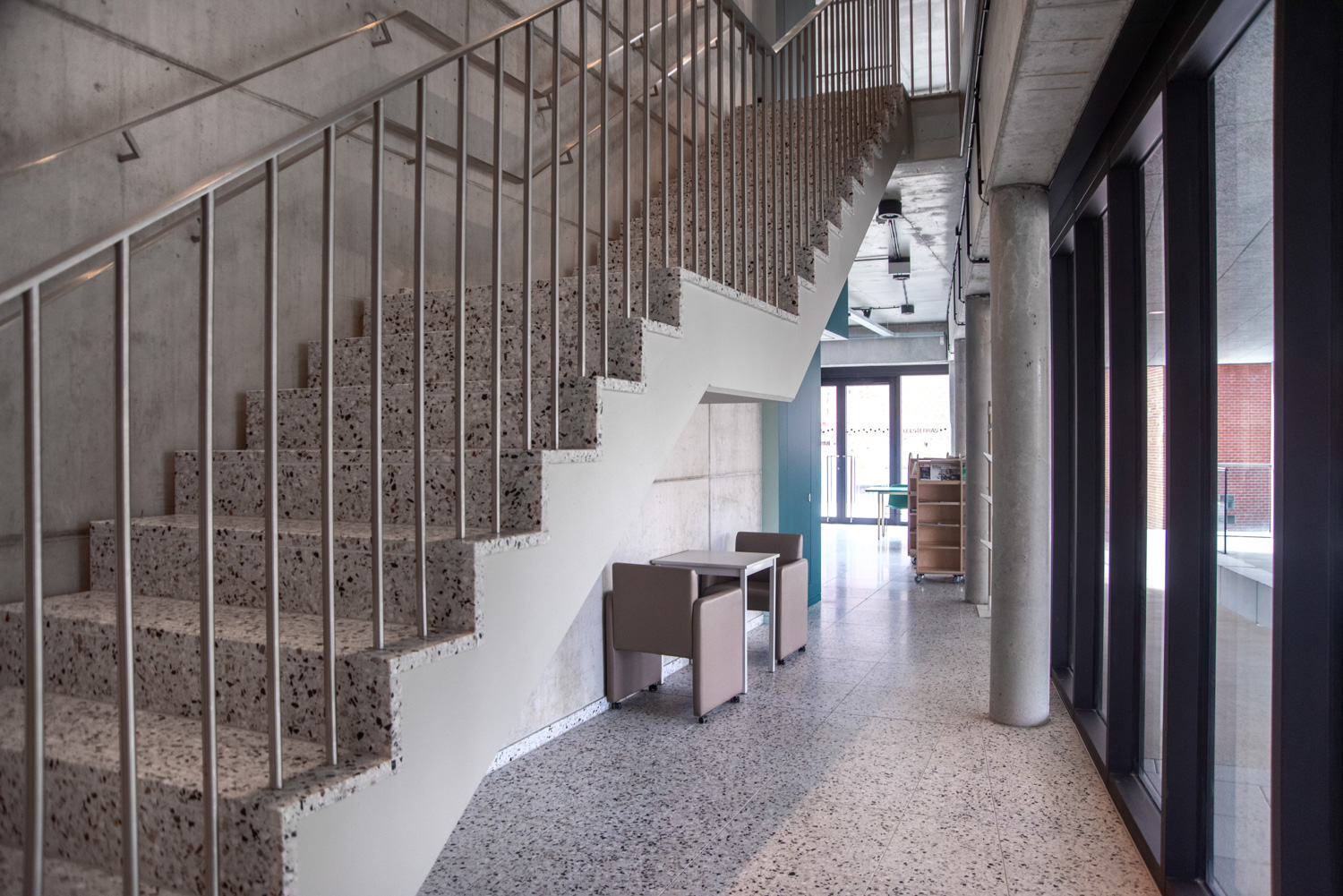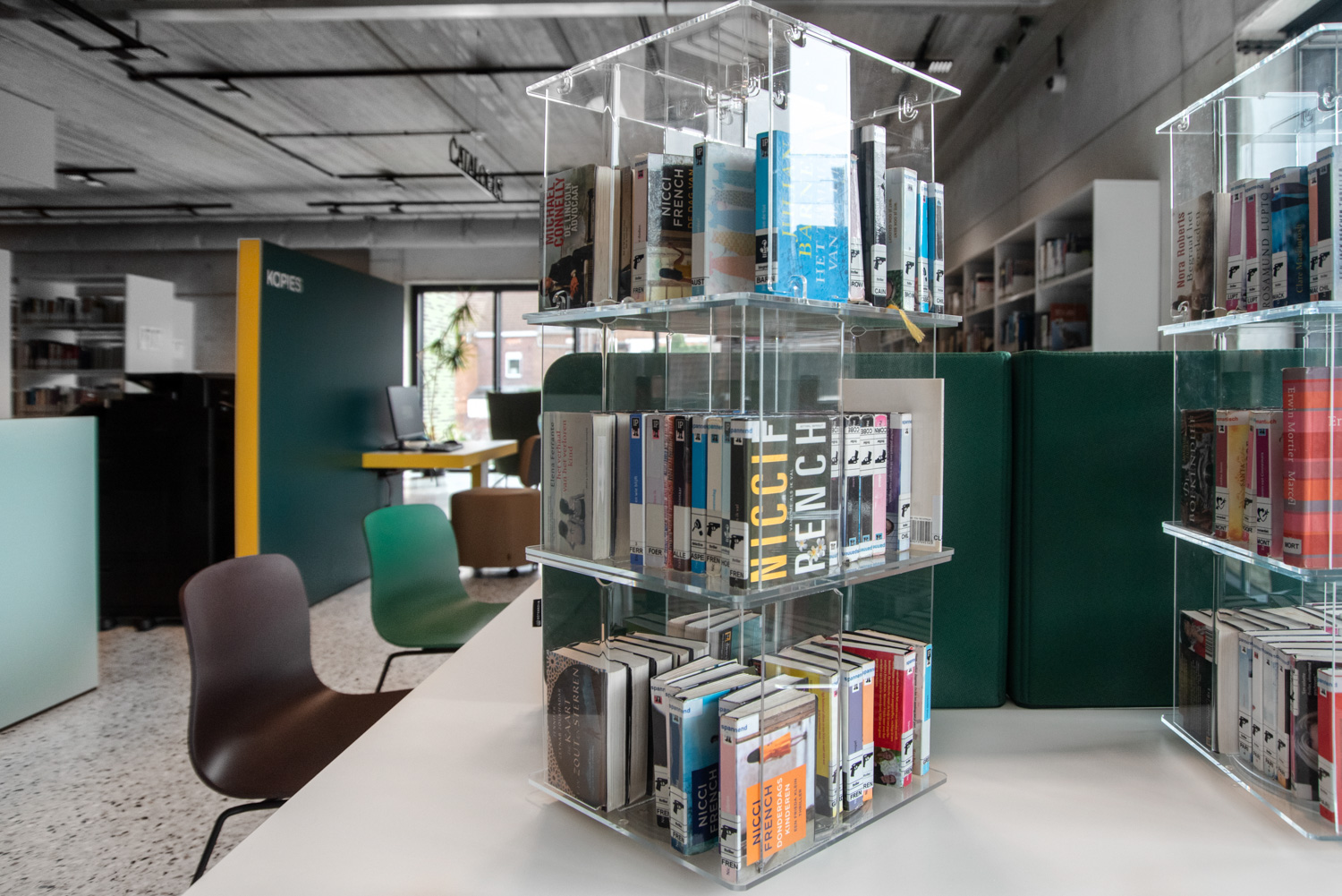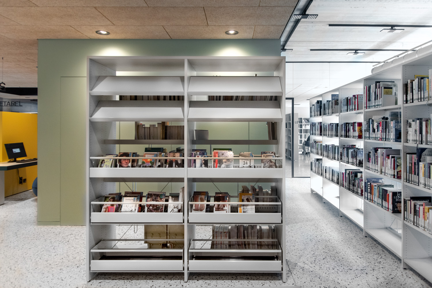 Lys og god plads er centrale elementer i det nye bibliotek i Geraardsbergen. Biblioteket er mere end blot et sted at låne bøger; det er et sted til læsning, studier, spil og meget mere. Der er mange siddemøbler at vælge imellem: borde og stole til arbejde eller studier, hyggelige og komfortable lænestole til afslapning og puffer, hvor man hurtigt kan slå sig ned med en god bog.