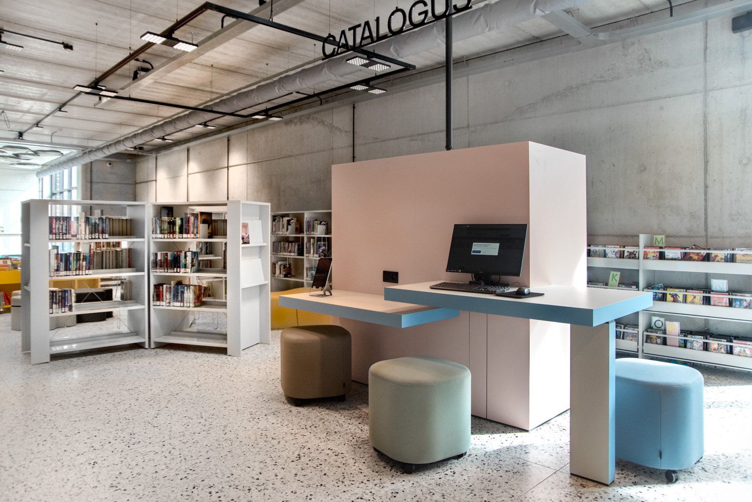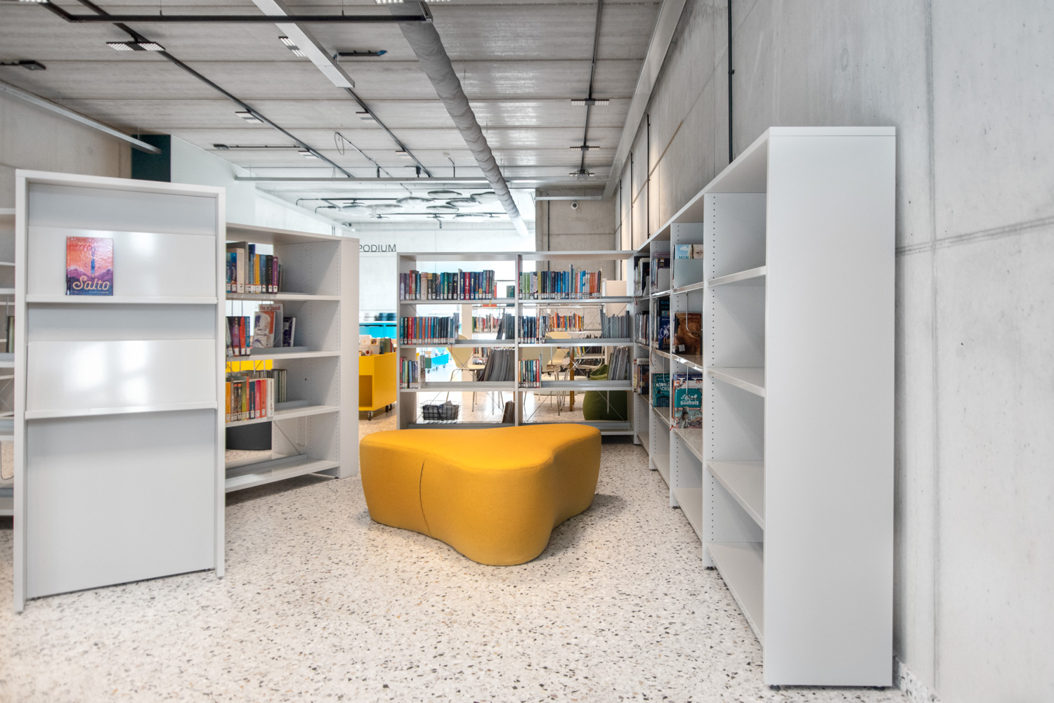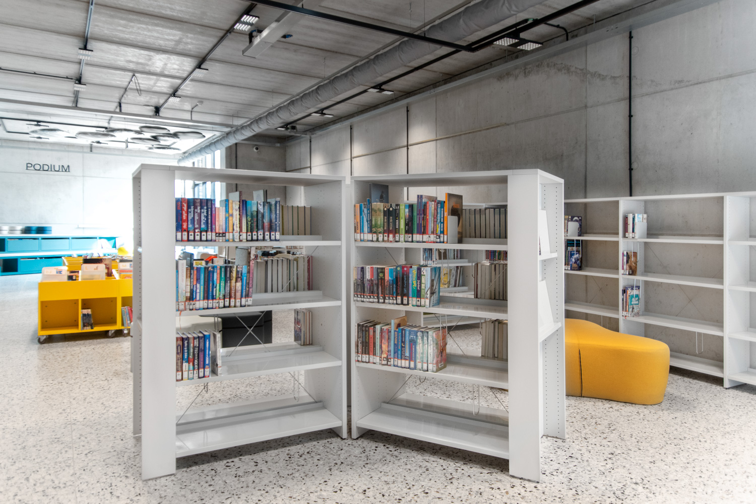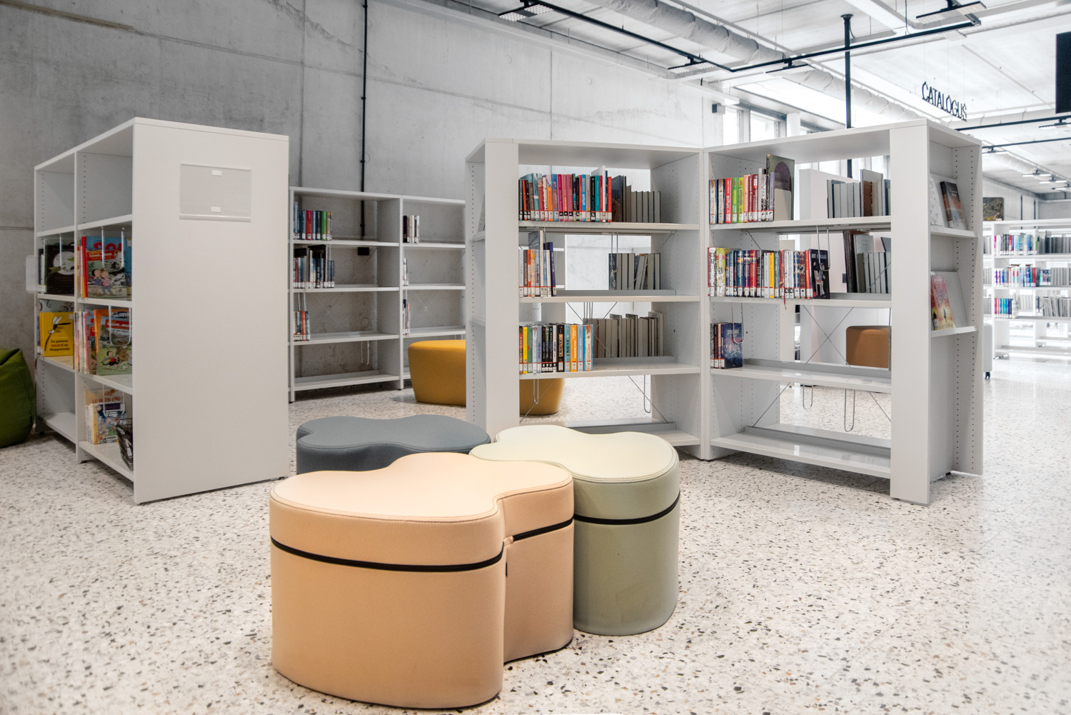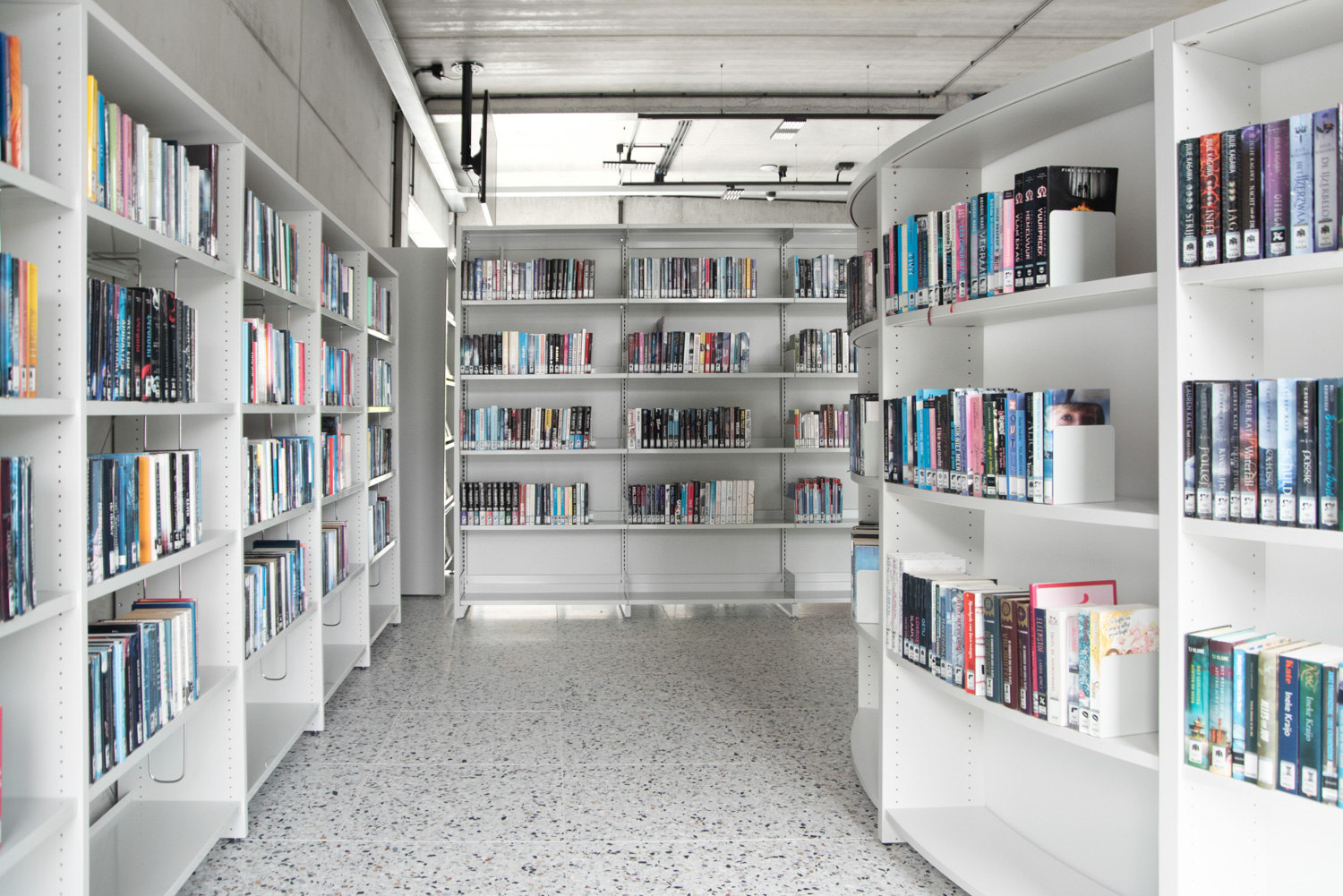 I hele biblioteket er reolerne hvide for at trække opmærksomheden mod indholdet – nemlig bøgerne. Bygningens moderne farvepalette bliver afspejlet i biblioteksmøblerne.