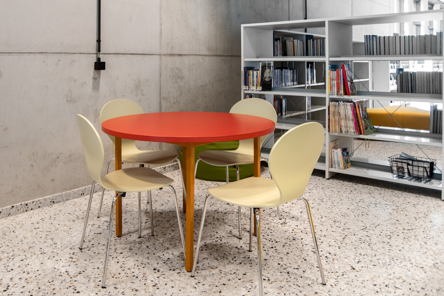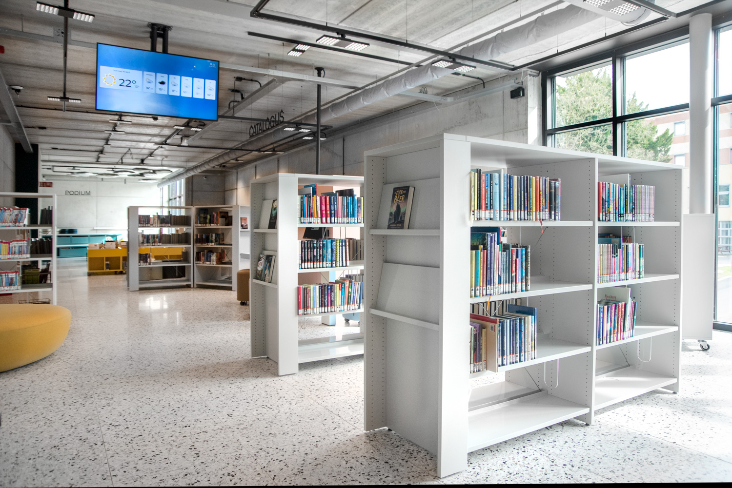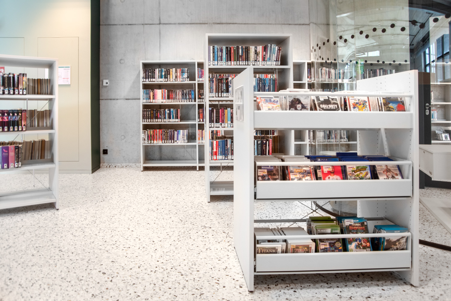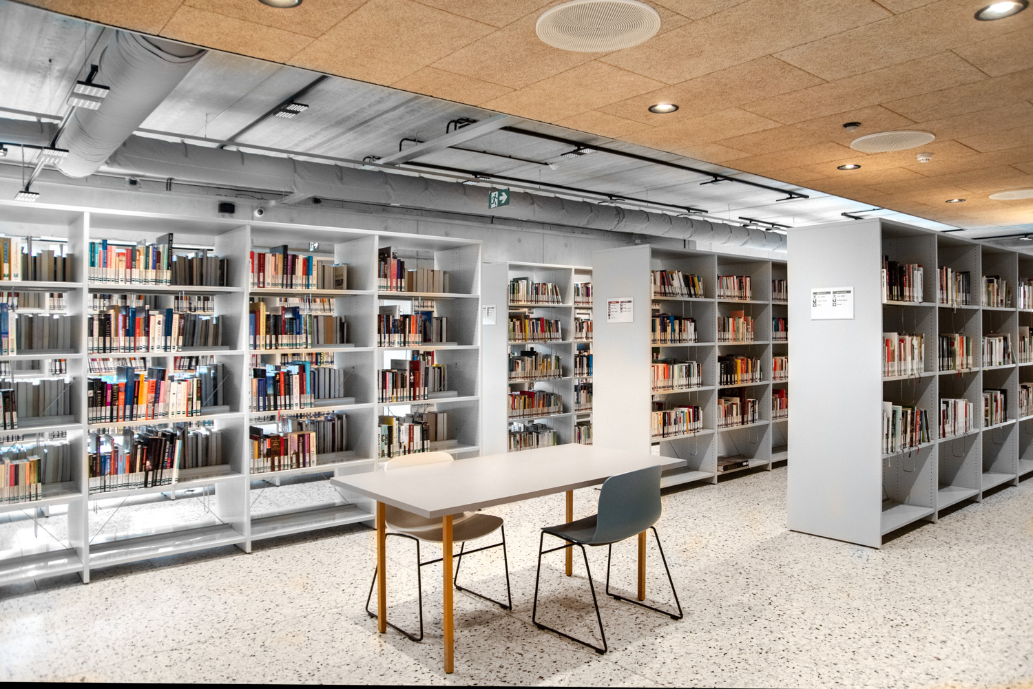 I hele biblioteket er reolerne hvide for at trække opmærksomheden mod indholdet – nemlig bøgerne. Bygningens moderne farvepalette bliver afspejlet i biblioteksmøblerne.