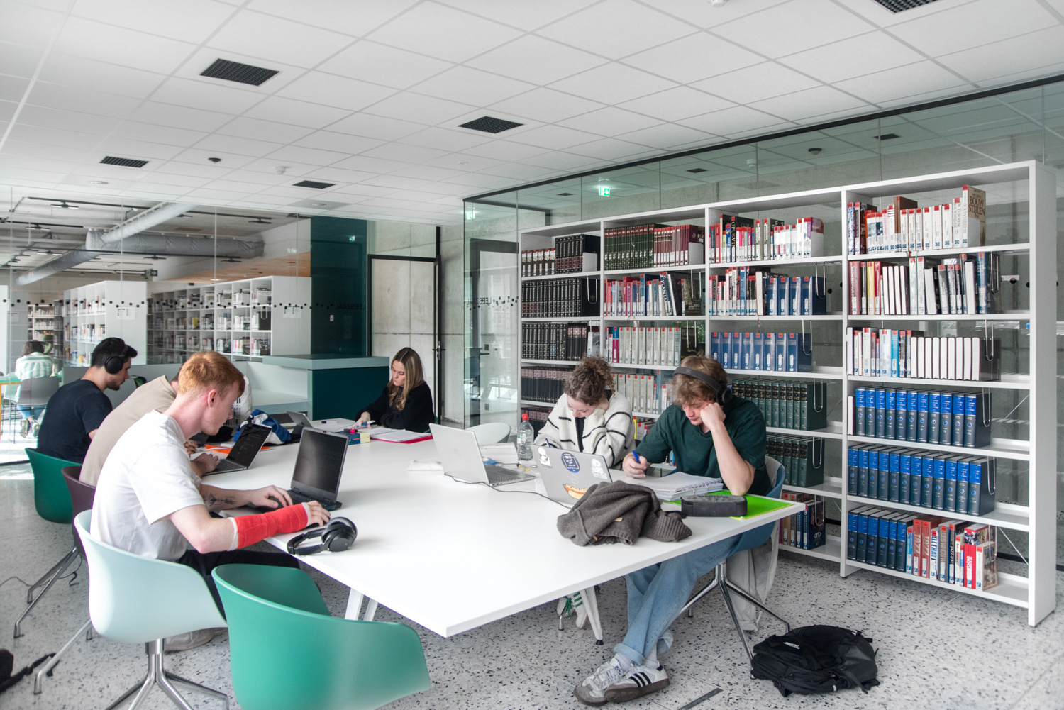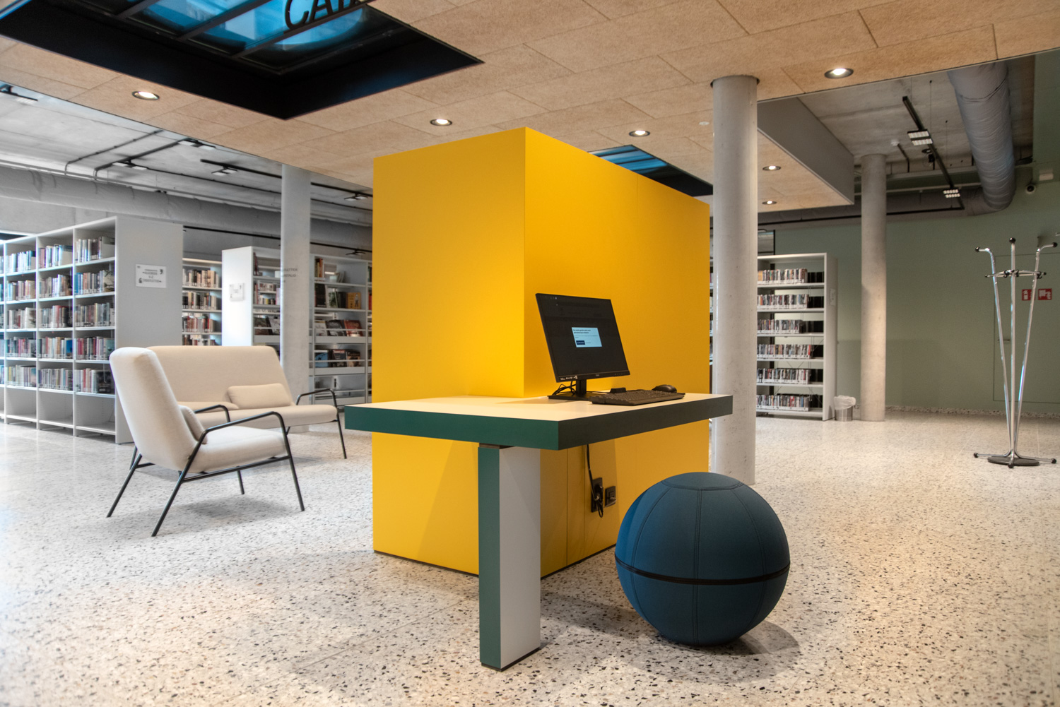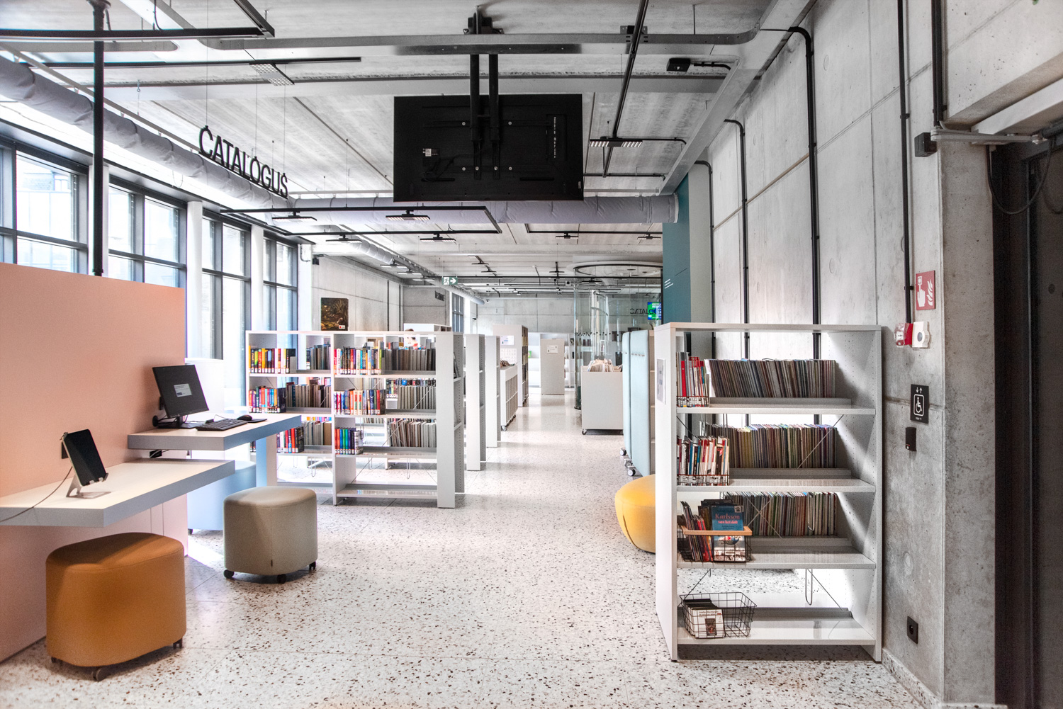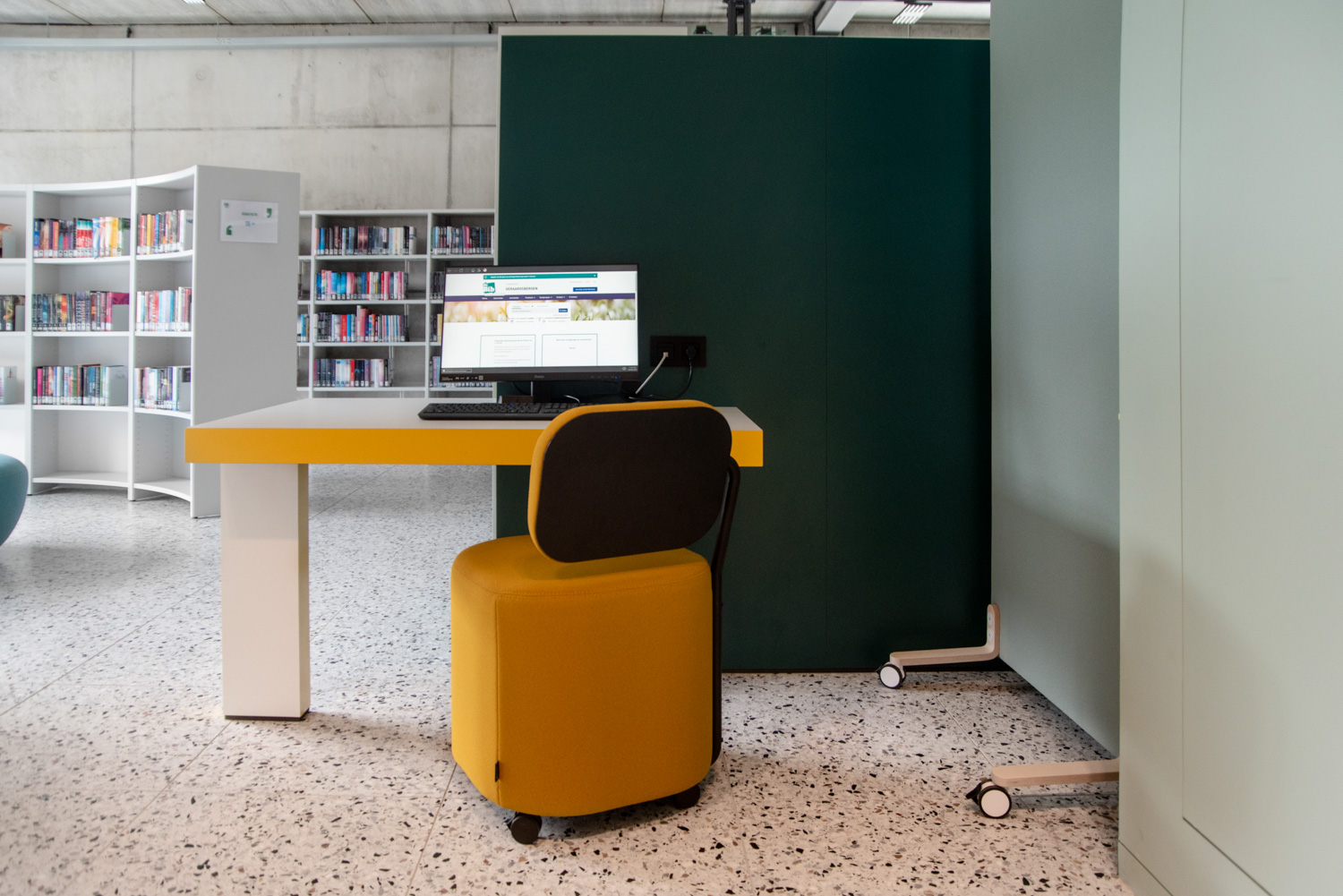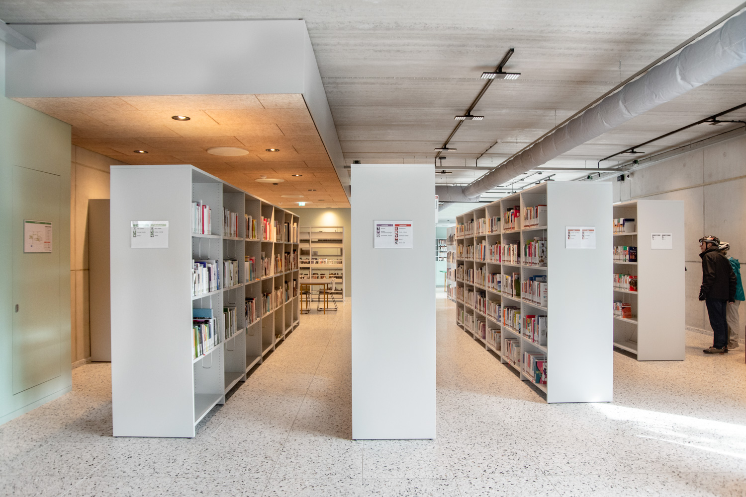 I hele biblioteket er reolerne hvide for at trække opmærksomheden mod indholdet – nemlig bøgerne. Bygningens moderne farvepalette bliver afspejlet i biblioteksmøblerne.