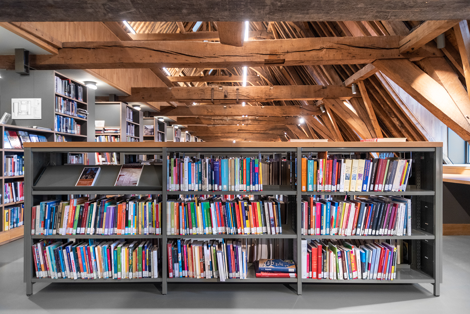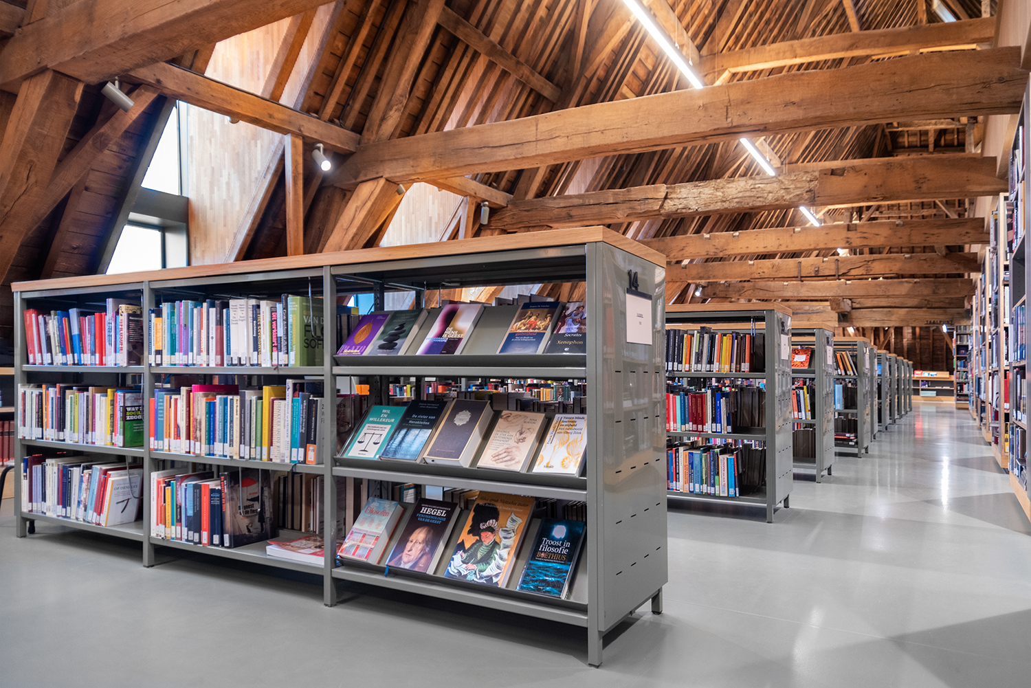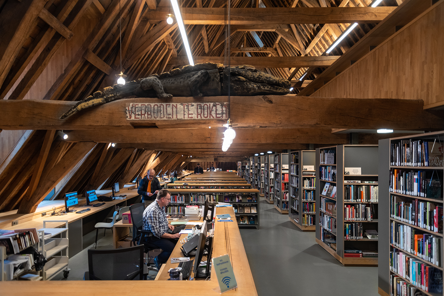 Bøgerne er arrangeret frontalt i lave bogkrybber, og samlingen følger bygningens konturer. Indretningen af biblioteket er en kombination af specialløsninger og standardmøbler, der er valgt med en bæredygtig finish. Således er Het Predikheren klar til et nyt kapitel i sin historie.