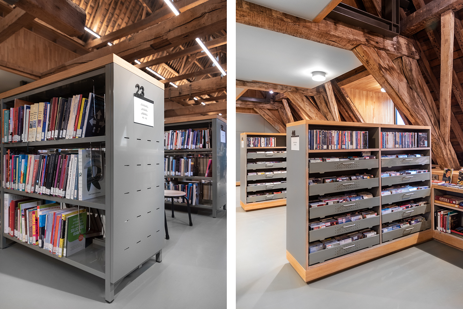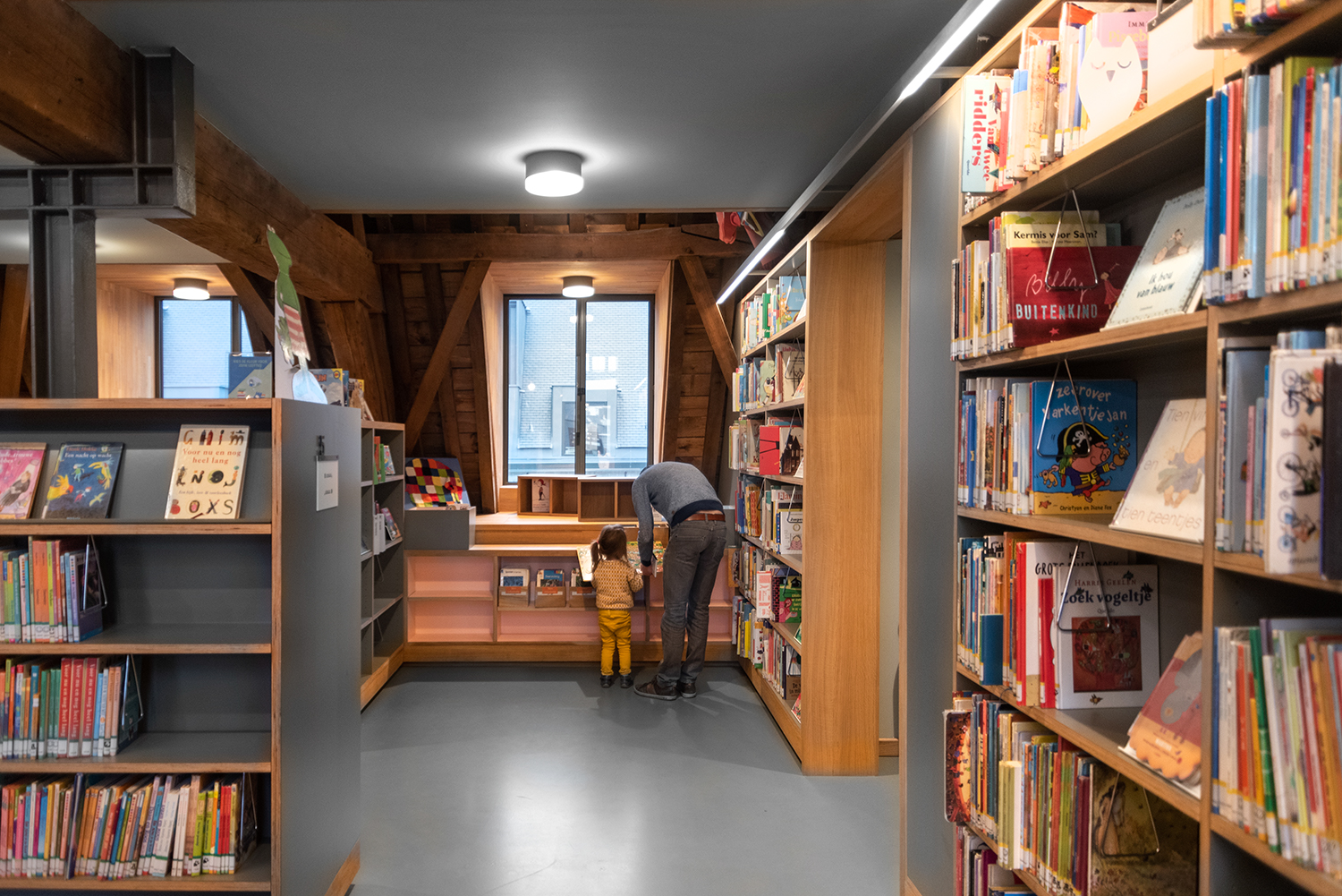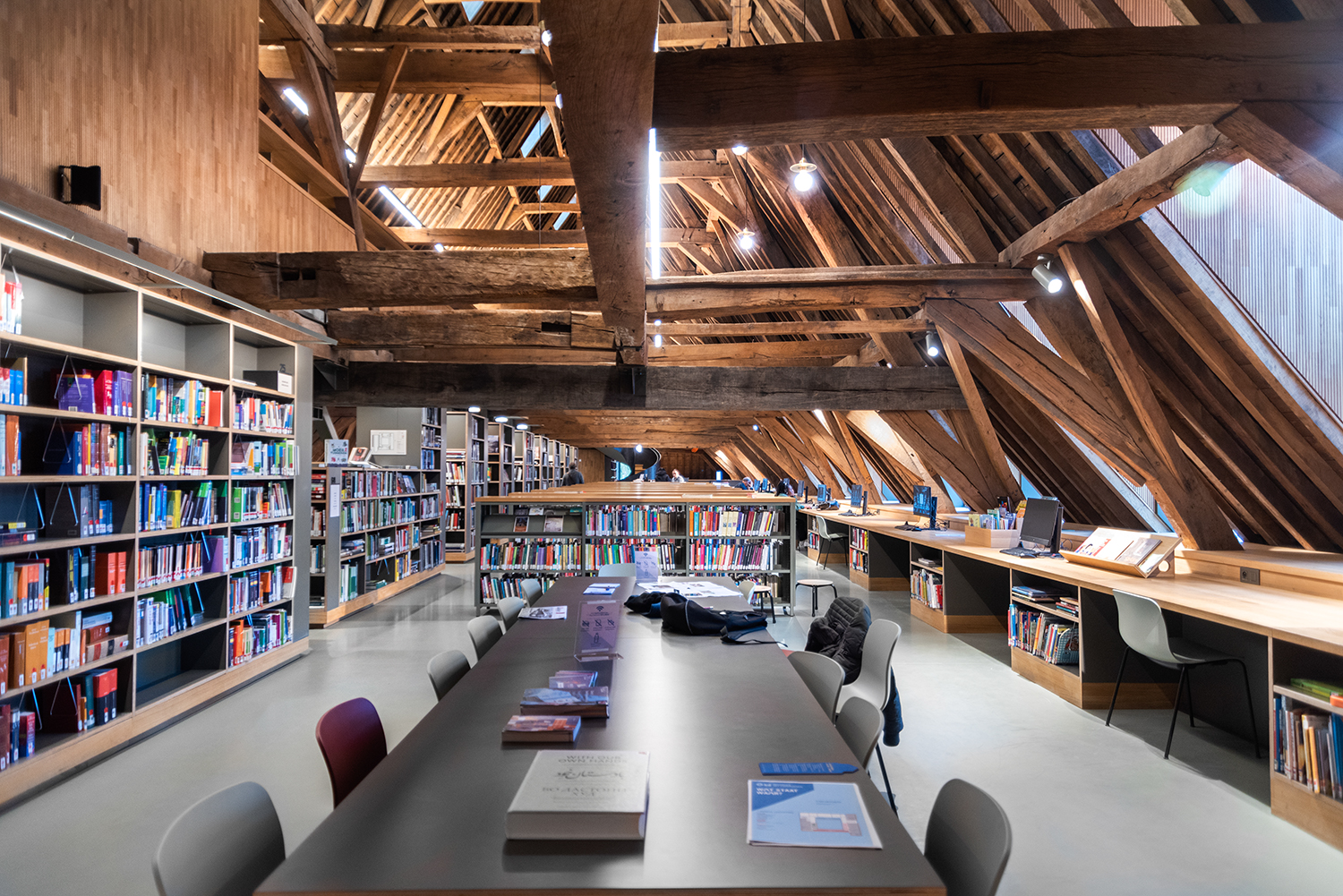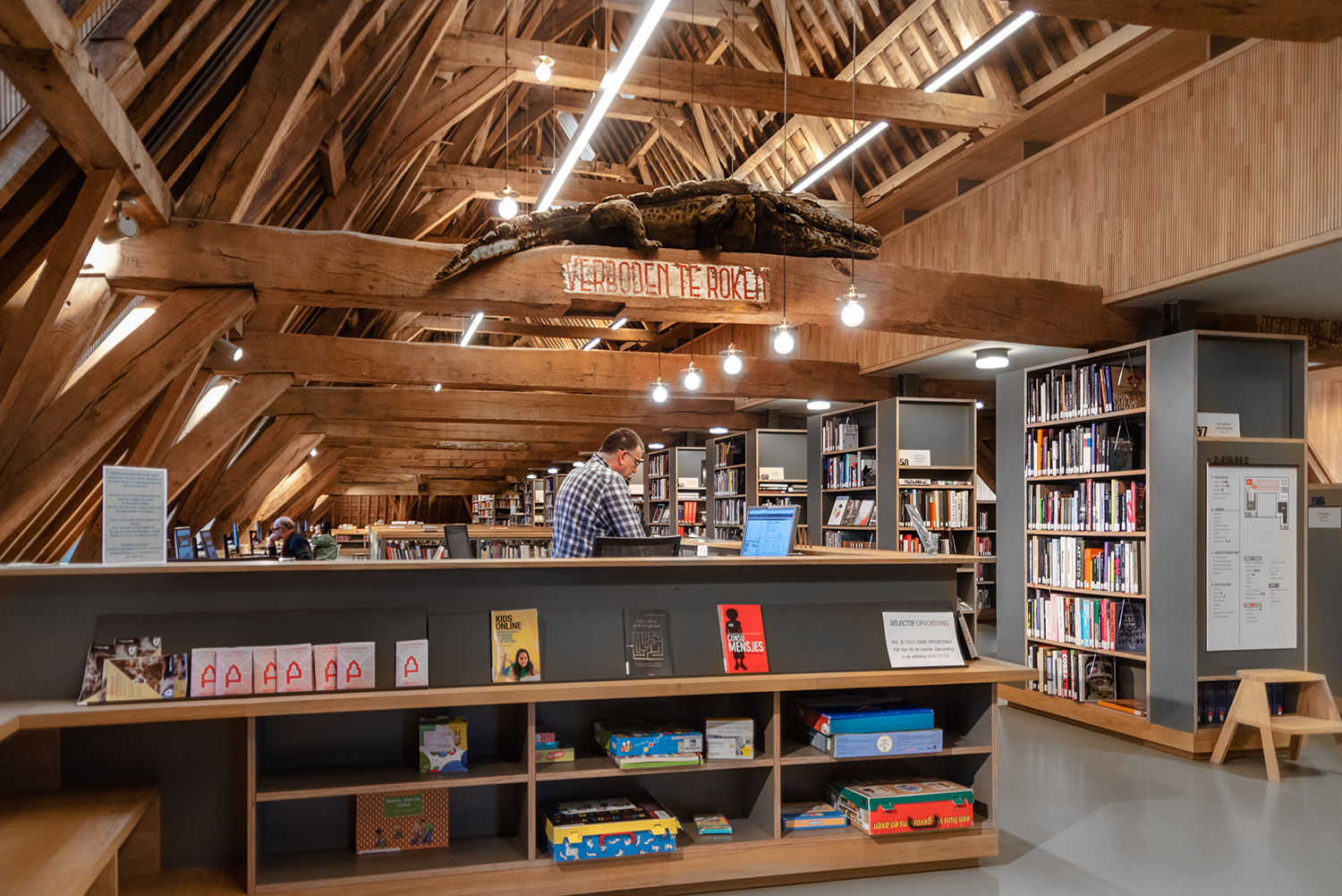 Bøgerne er arrangeret frontalt i lave bogkrybber, og samlingen følger bygningens konturer. Indretningen af biblioteket er en kombination af specialløsninger og standardmøbler, der er valgt med en bæredygtig finish. Således er Het Predikheren klar til et nyt kapitel i sin historie.