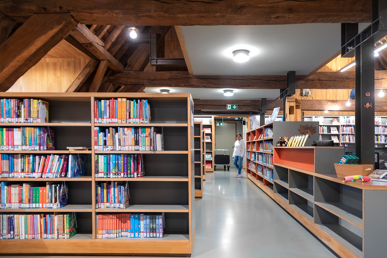 Børne- og ungdomsafdelingen er placeret på loftet. Et unikt rum, hvor de originale egetræsbjælker stadig er en del af tagkonstruktionen. Varmen fra træet omfavner dig og fortsætter i møblerne. Et ideelt sted for unge mennesker til at bladre igennem bøgerne.