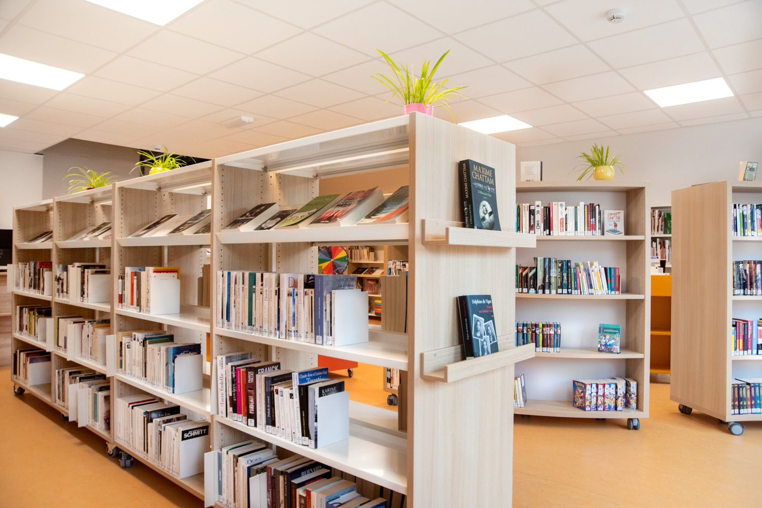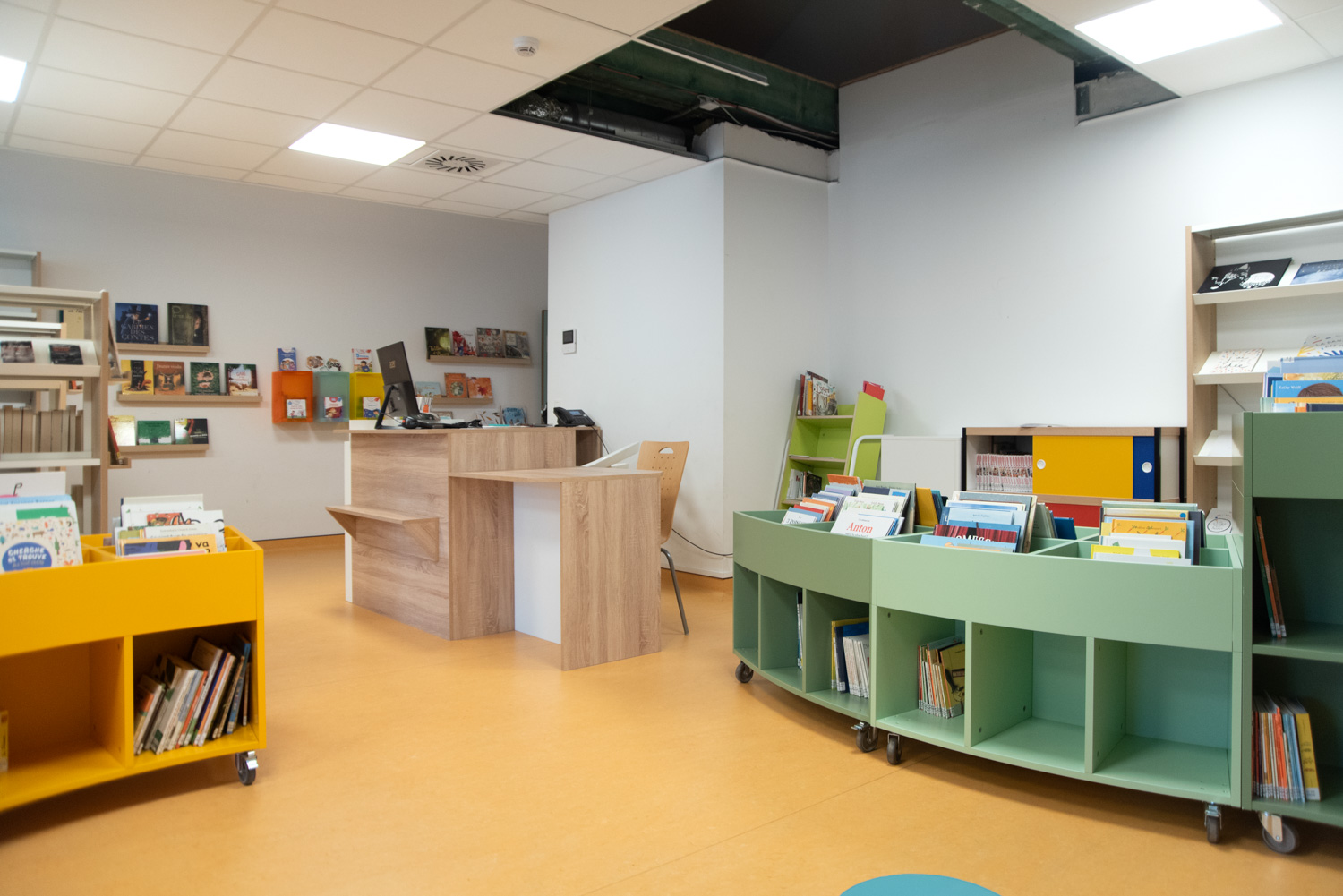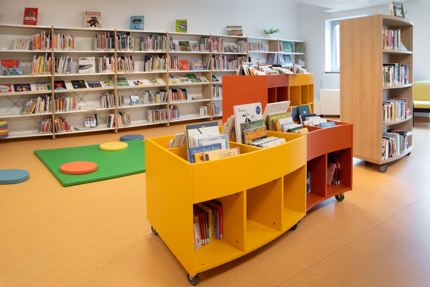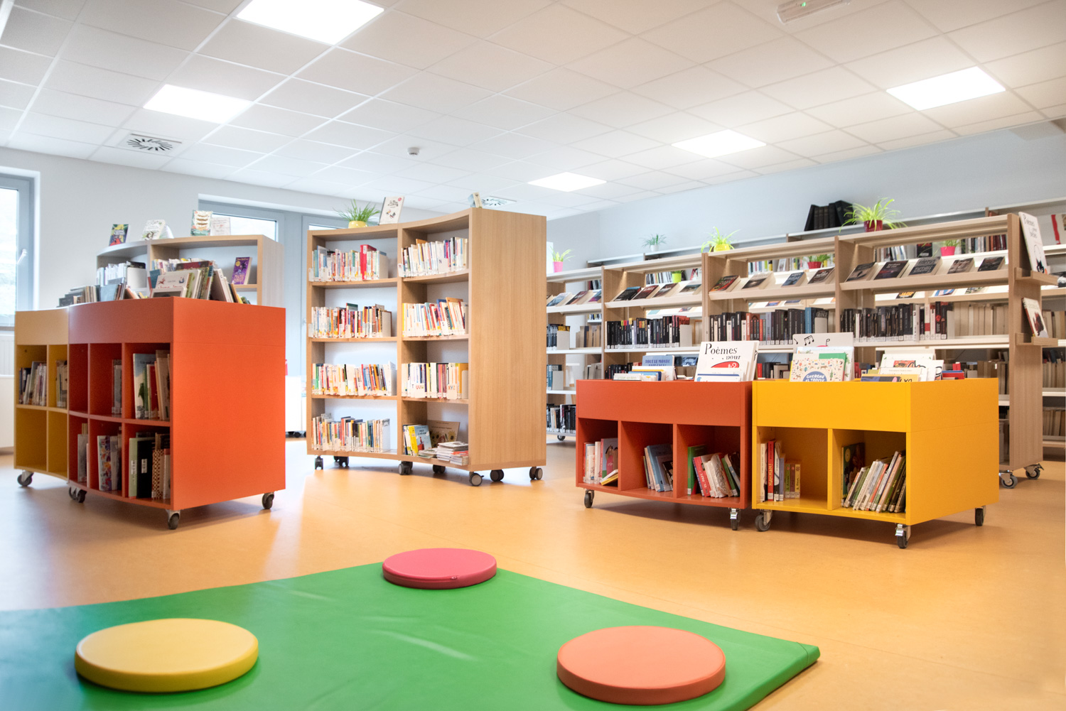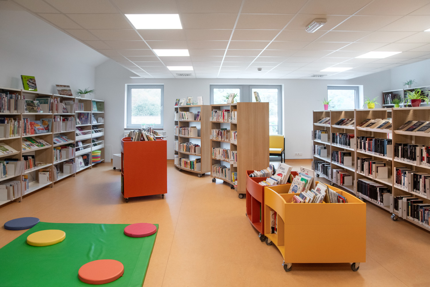 Efter oversvømmelserne i 2021, der ødelagde det gamle bibliotek, var planerne heldigvis allerede på plads for at flytte biblioteket til en nyopført skolebygning. I dag står biblioteket som et lyst, moderne rum, prydet med behagelige farver og runde møbler, der blødgør det strømlinede, lineære design.