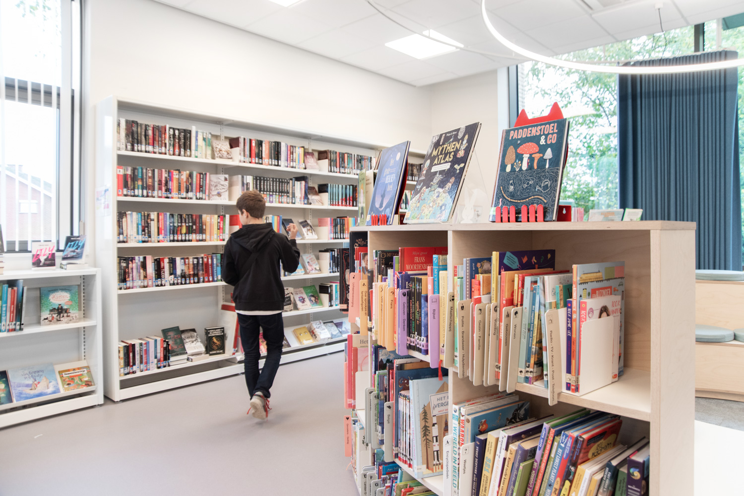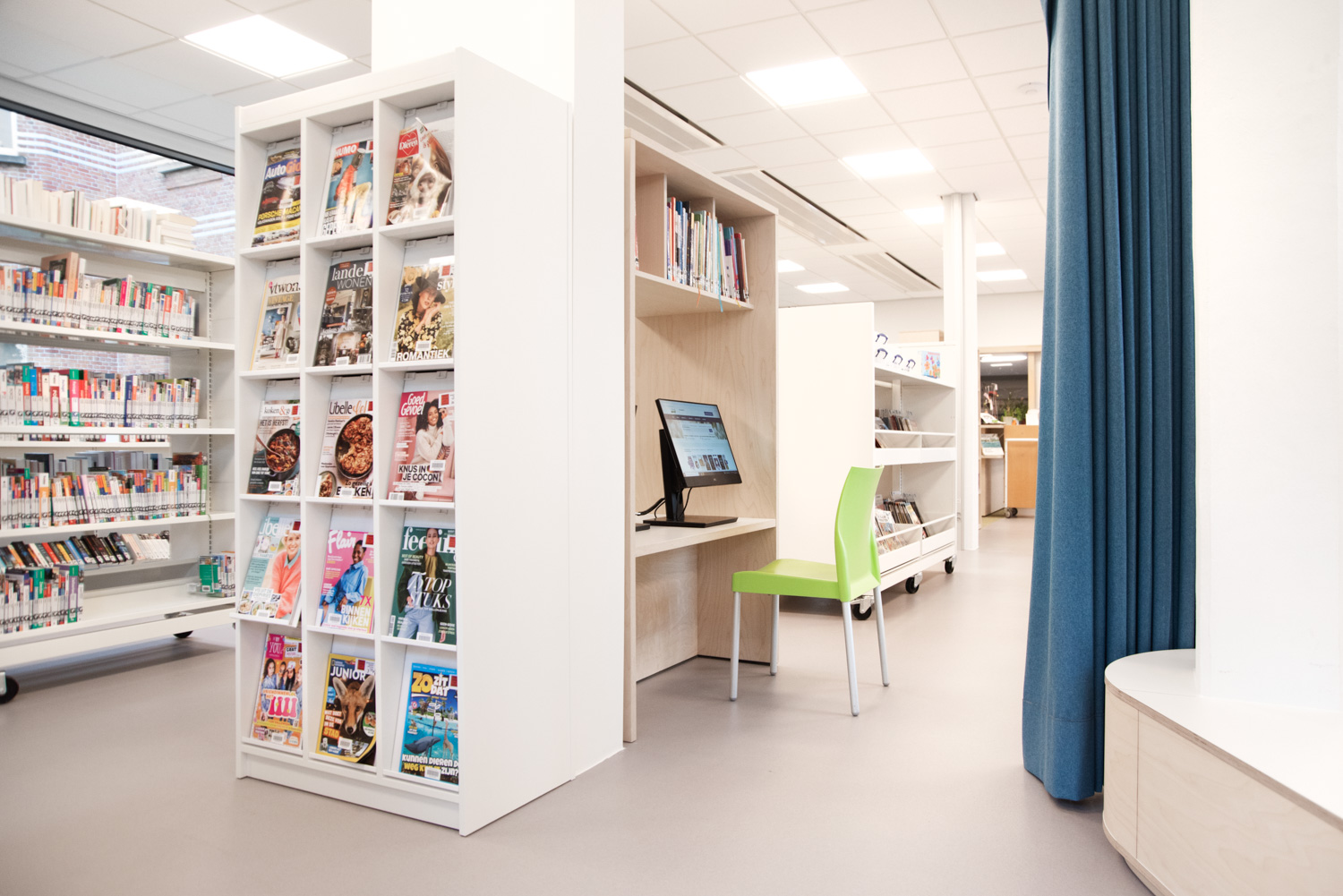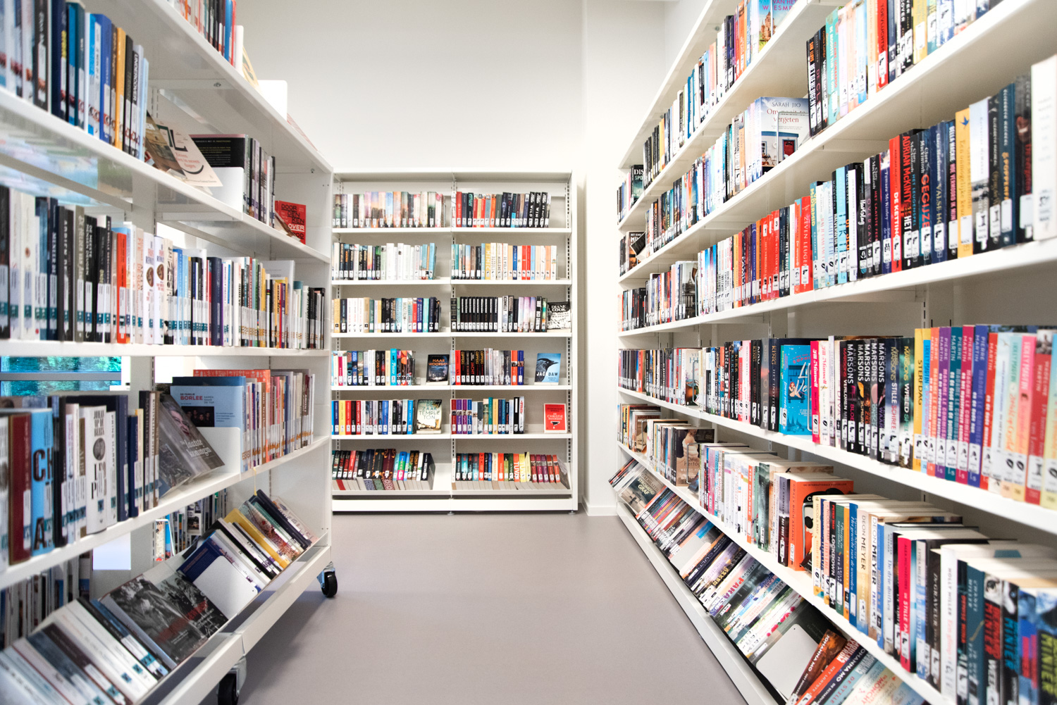 Bøger er præsenteret på skræddersyede reoler, specielt designet til at imødekomme lokalsamfundets behov. De nederste hylder er vinklet, så bøgerne er nemme at nå. Samtidig sikrer kombinationen af træelementer og hvide overflader, at bøgerne forbliver i fokus.