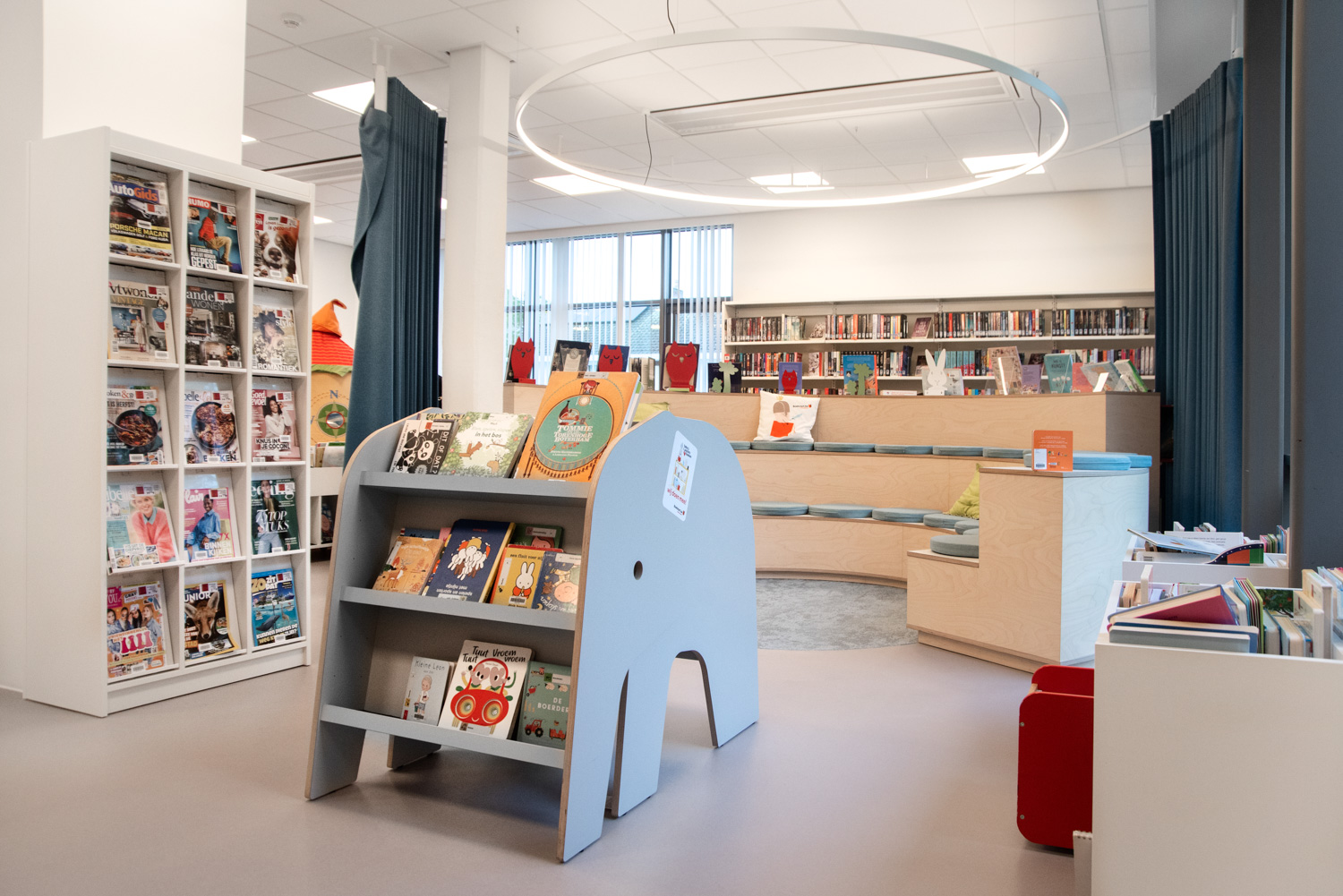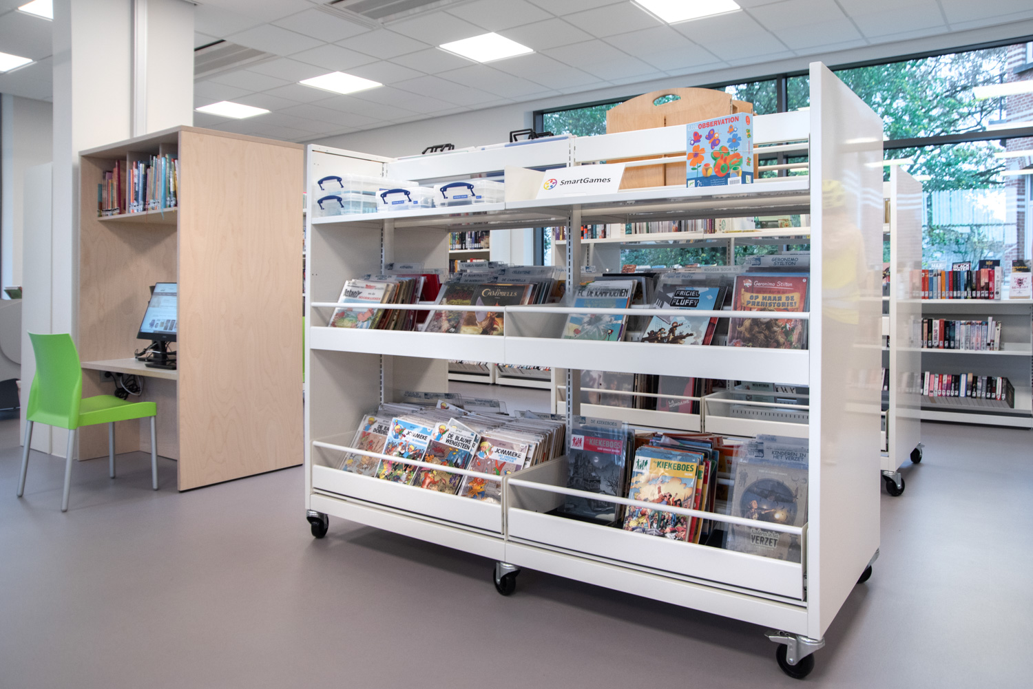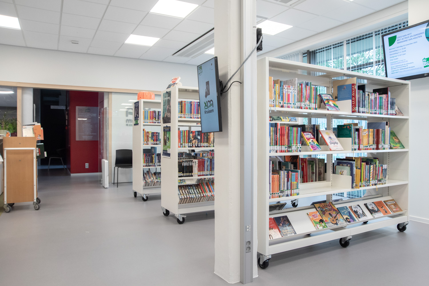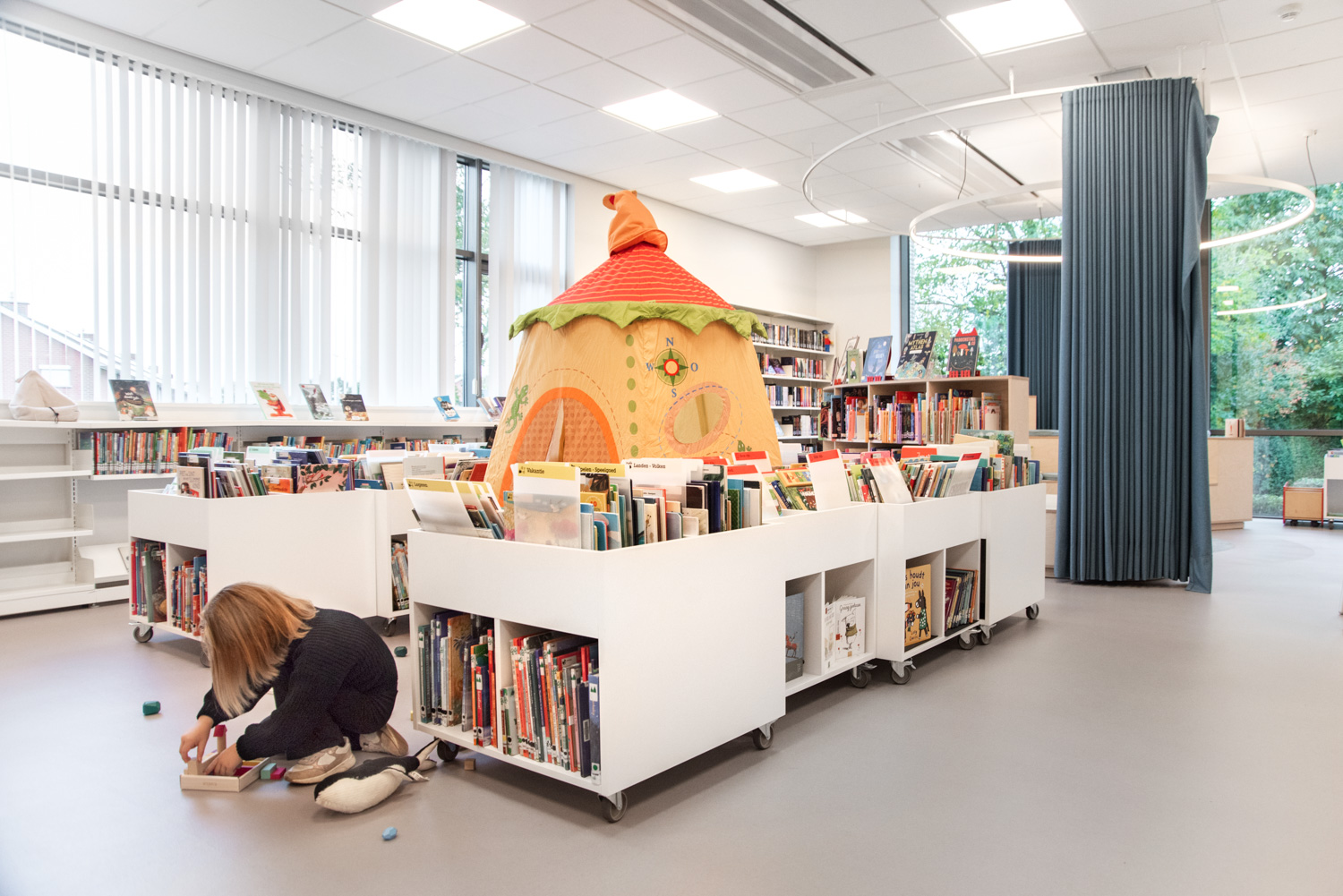 Bøger er præsenteret på skræddersyede reoler, specielt designet til at imødekomme lokalsamfundets behov. De nederste hylder er vinklet, så bøgerne er nemme at nå. Samtidig sikrer kombinationen af træelementer og hvide overflader, at bøgerne forbliver i fokus.
