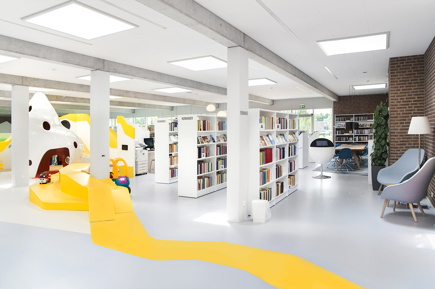 Biblioteket er i alle detaljer designet med fokus på at inspirere børn og mennesker i alle aldre til at lære og udforske nye emner baseret på en blanding af fri leg, udforskende læring og fysisk bevægelse.