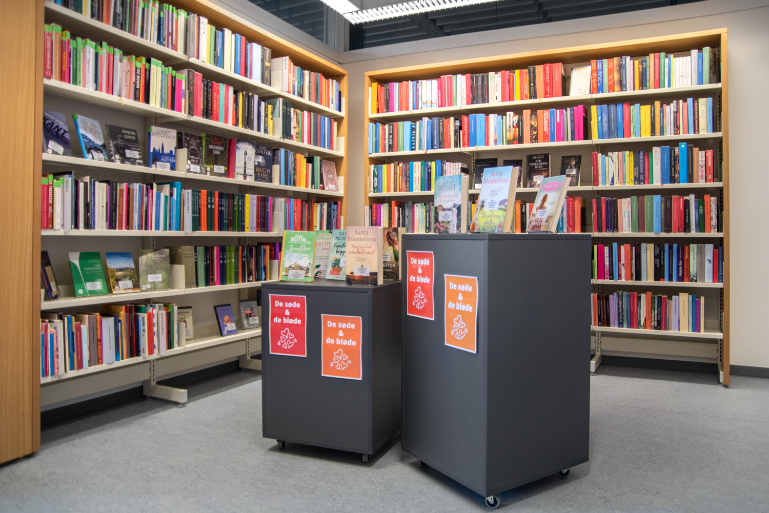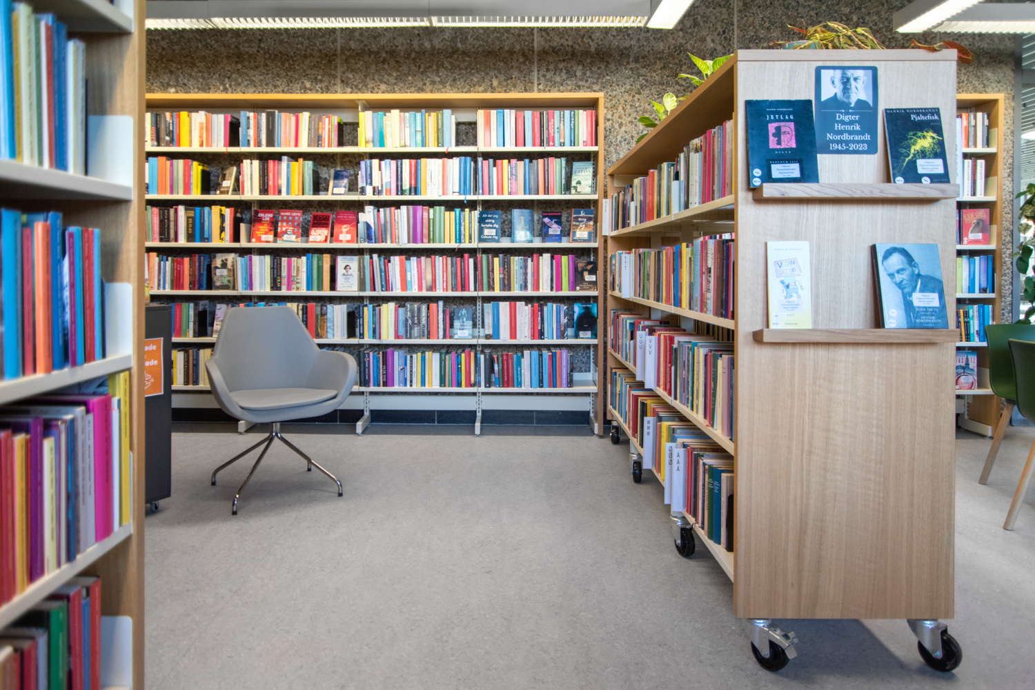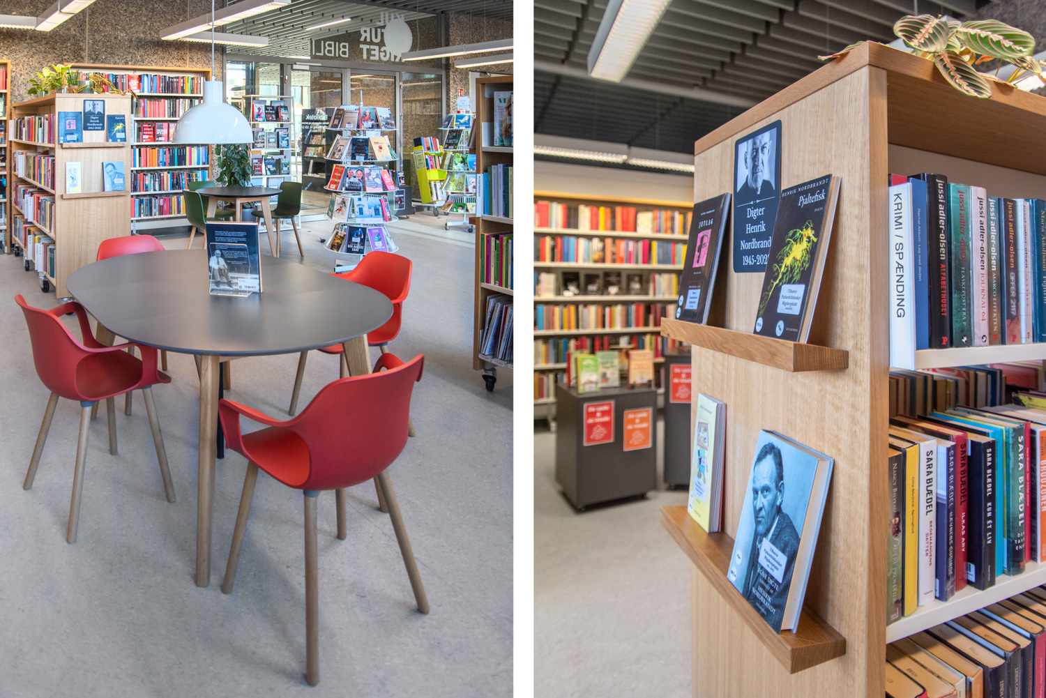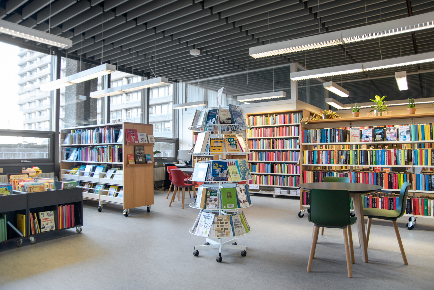 På biblioteket ses flotte udstillingshylder på reolernes gavle med spændende og iøjnefaldende læsning. Møbler tæller blandt andet Hay og Andersen Furniture samt specialdesignede avis- og brochureholdere.
