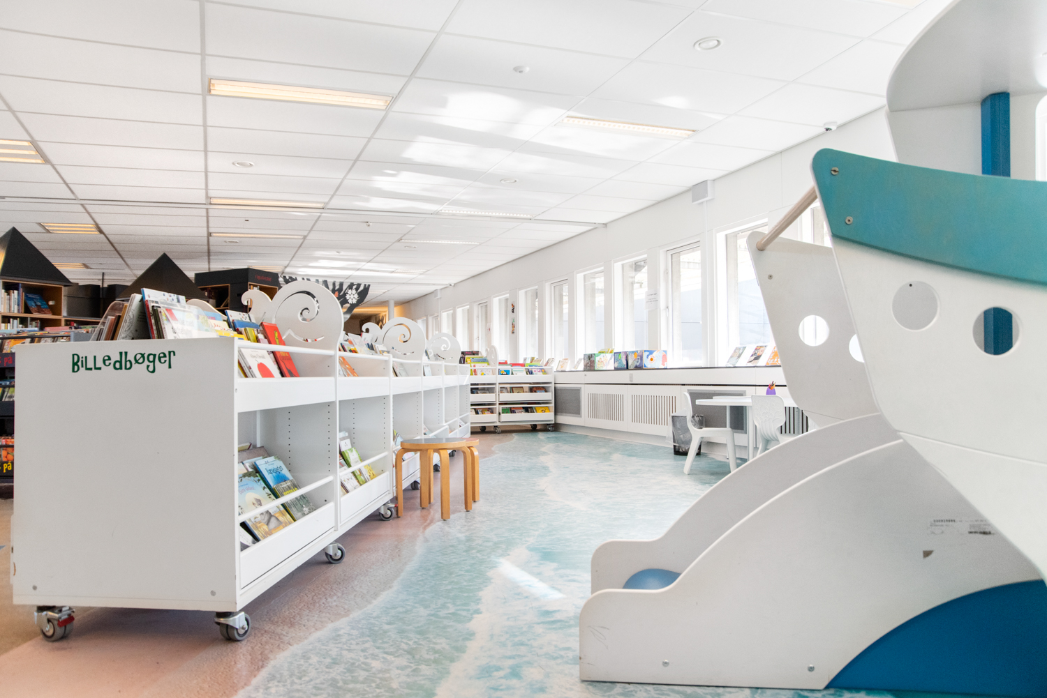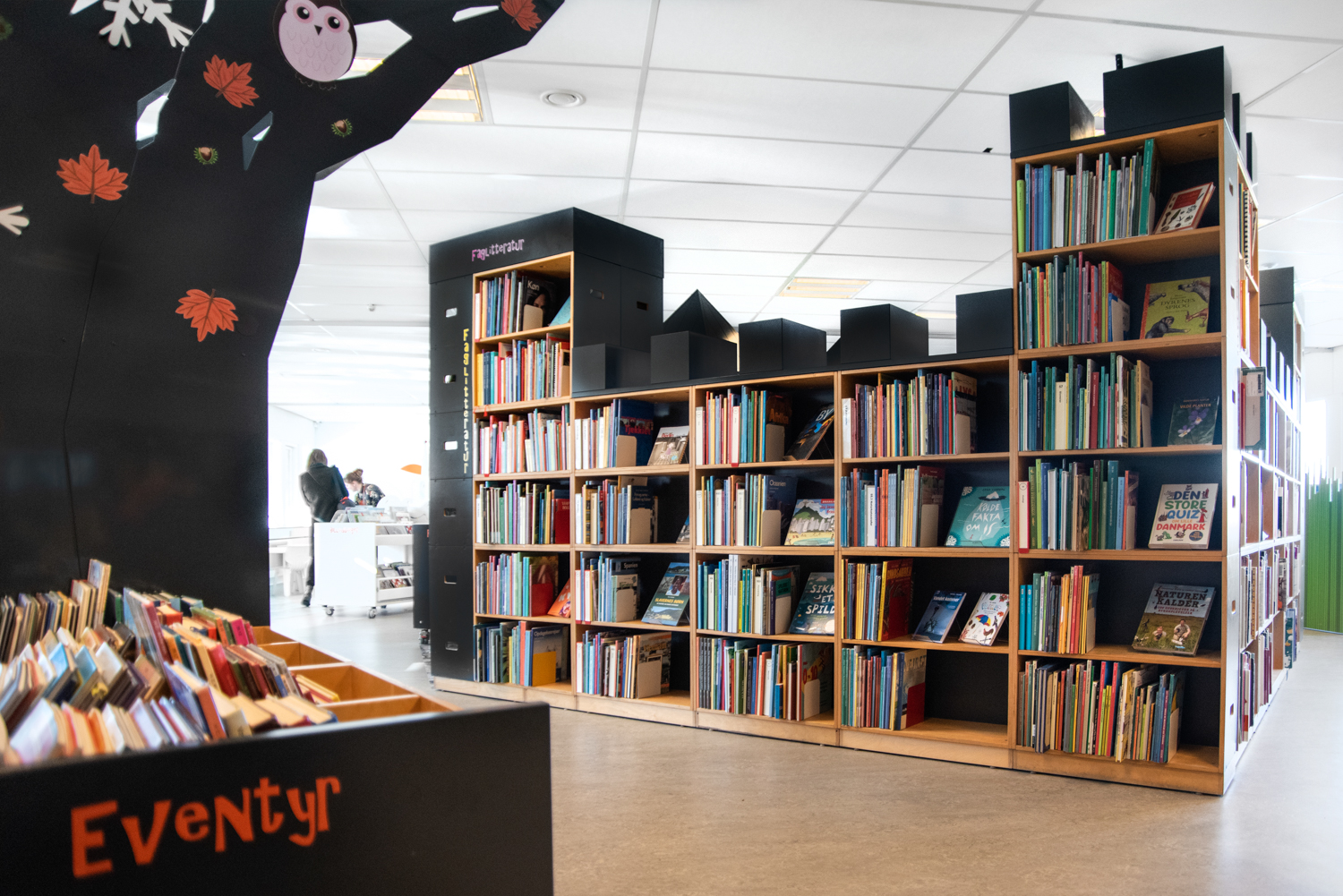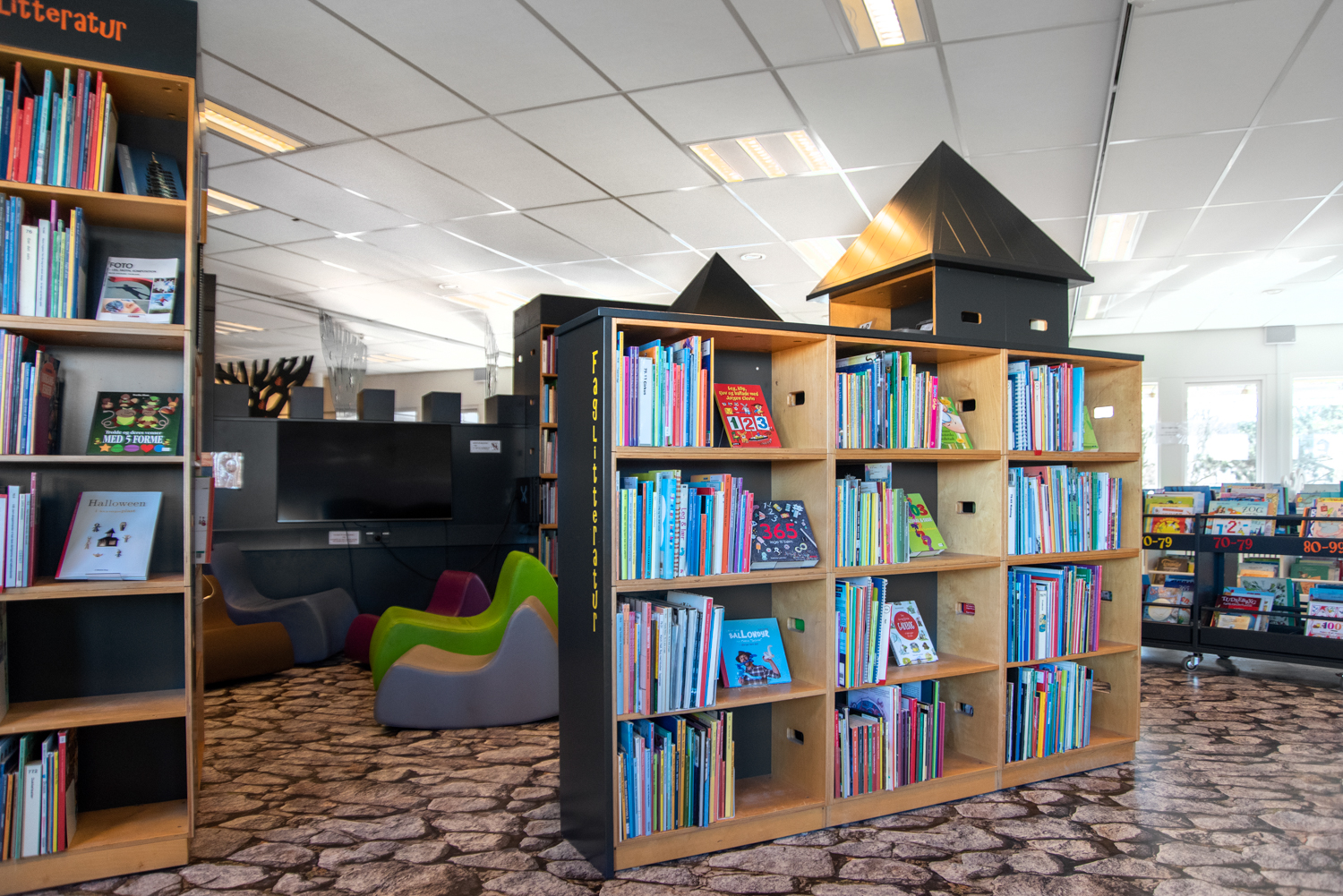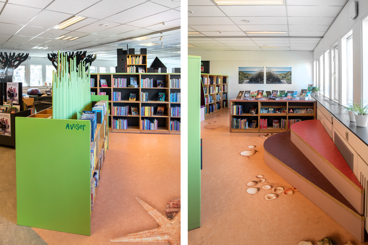 Nyindretningen har været med til at skabe en større rumopdeling med flere gode vinkler og afskærmede kroge. Tidligere var der én gennemgående passage gennem biblioteket, som nu er brudt op af en middelalderborg i midten af rummet. Ved at bryde rummet op, kan de besøgende mere uforstyrret nyde et hyggeligt ophold i skoven eller gå på opdagelse ved stranden eller i borgens spillehule. Et andet element i indretningen har været bæredygtighed. Gamle reoler er således blevet genanvendt og sammensat på nye måder, så de passer til den nye indretning.