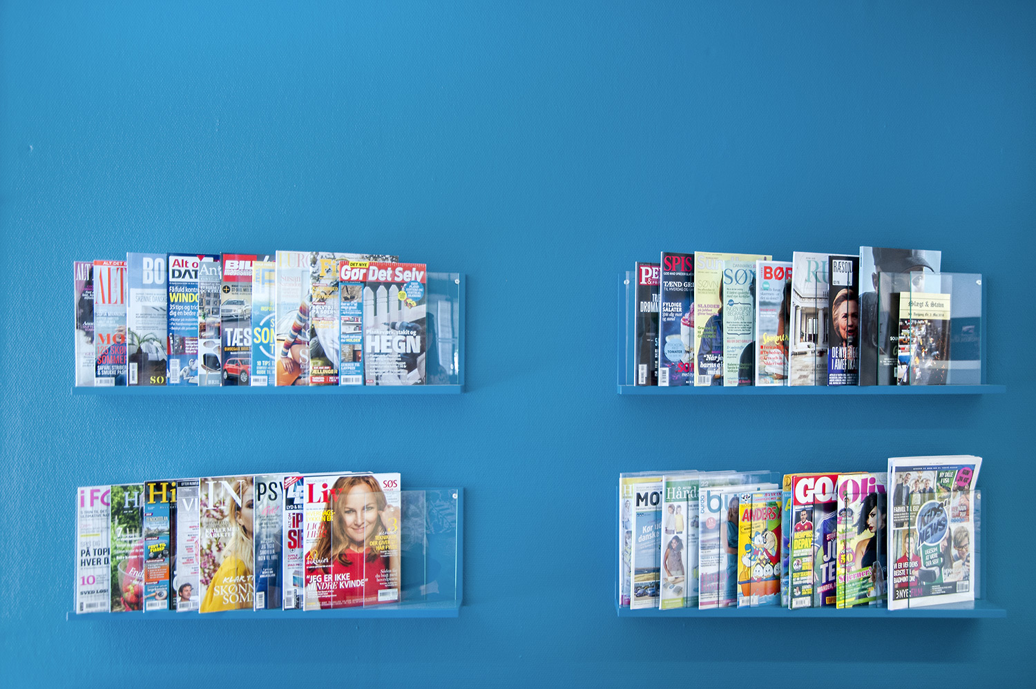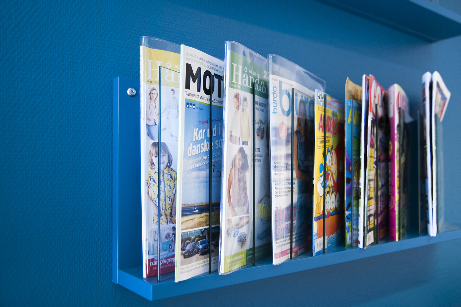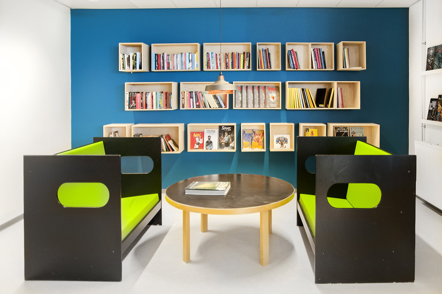 Farver på udvalgte møbler, vægge og tæpper bringer liv til bibliotket i en rolig og afslappet atmosfære.