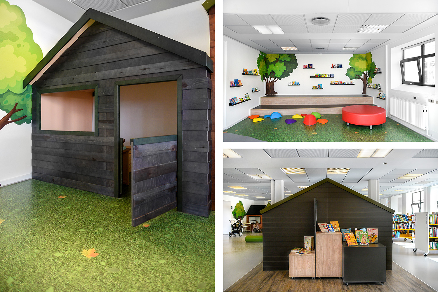 I den nye indretning på Horsens Bibliotek er de ældre, gule reoler blevet genbrugt. Ved at pakke reolerne ind i antracitgrå gavle giver det et mere moderne look. Samtidig er der tilføjet udstillingspodier i grå og egetræ, lavet felter på gulvet med trægulv og sat folie på vægge med skovbilleder. I børneafdelingen er der kommet hytter og træer på væggene.