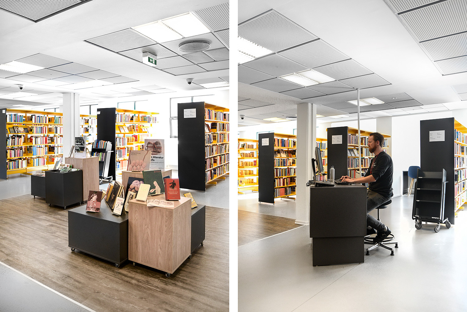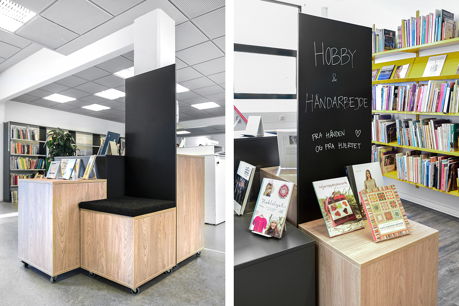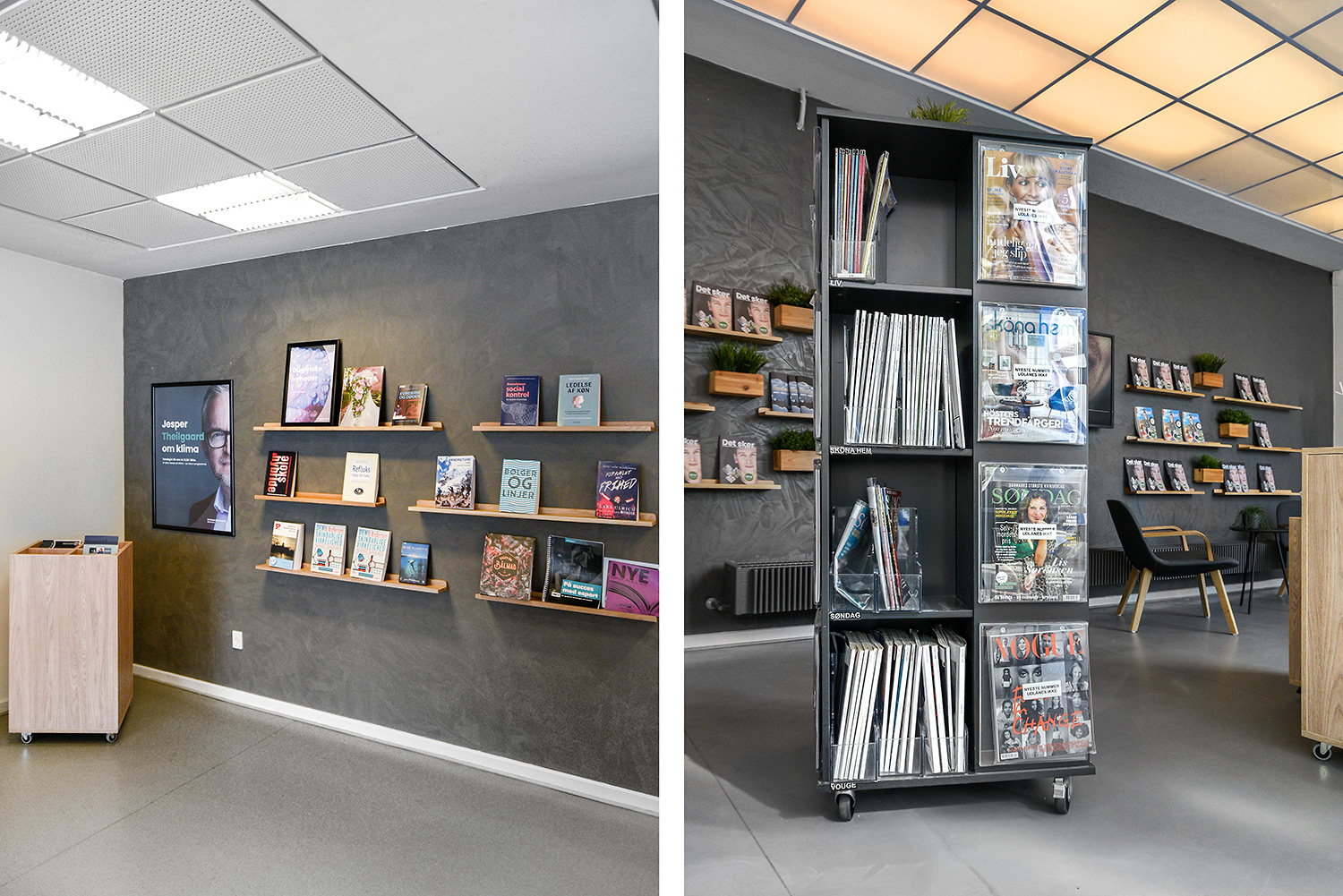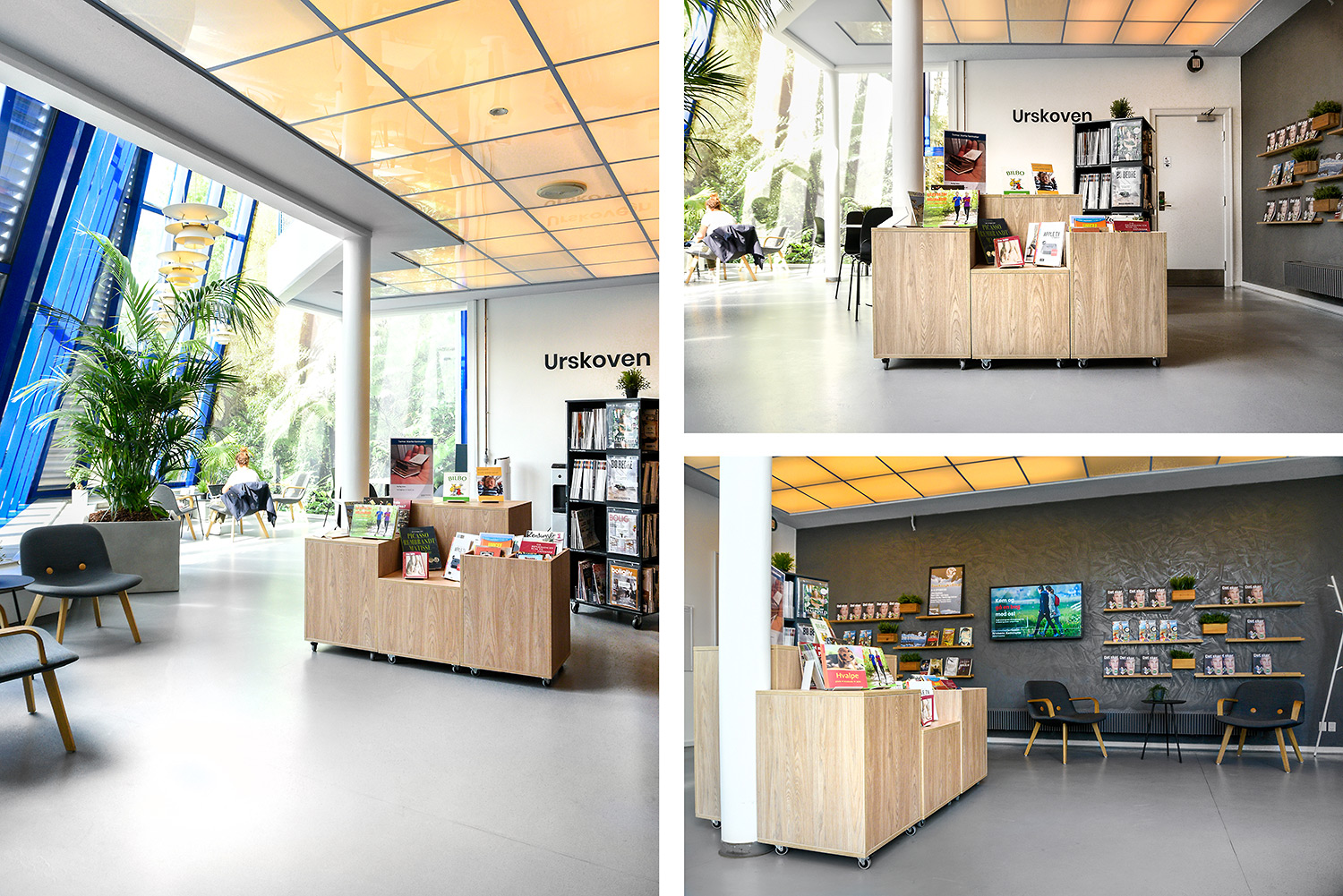 Nu er de gule reoler blevet en del af en helhed, der skaber en moderne fortælling om natur på en stilren og meget unik måde. De gule reoler er blevet en styrke fremfor en nødvendighed. Helheden er opnået ved at lave en stærk farvepalette, hvor de gule, grå og grønne farver sammen med træmaterialerne har et flot samspil, og er med til at understrege naturen i indretningen.