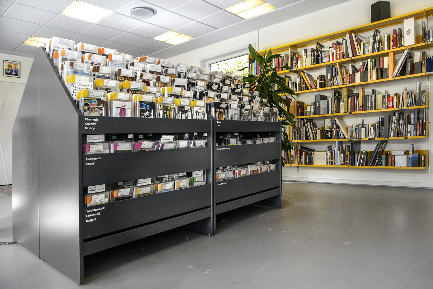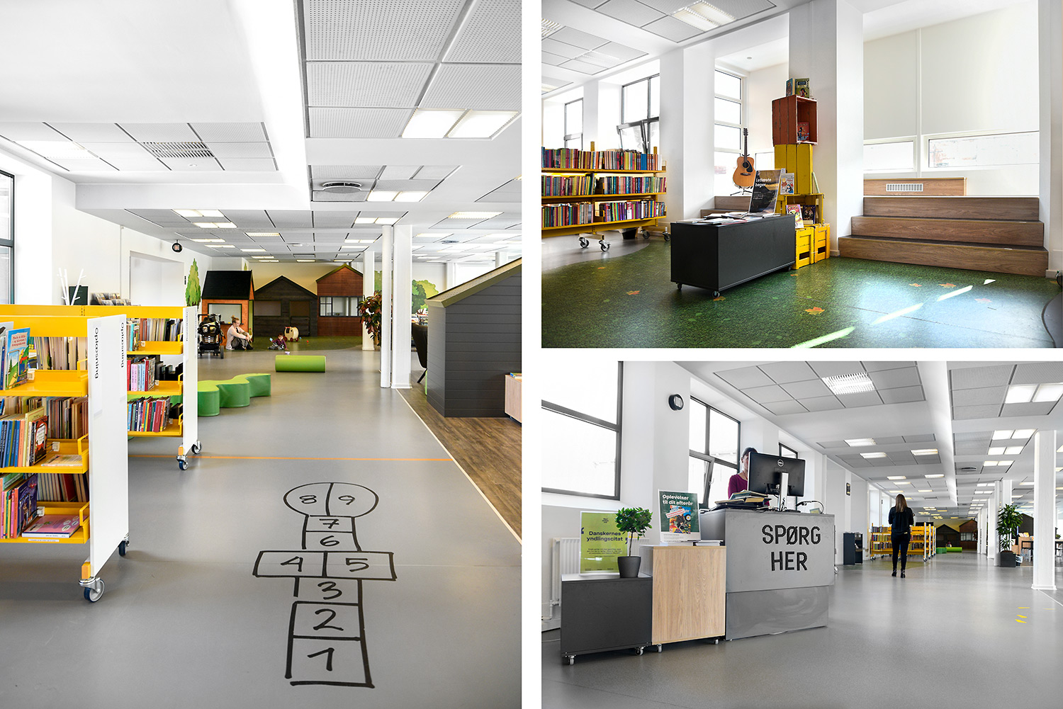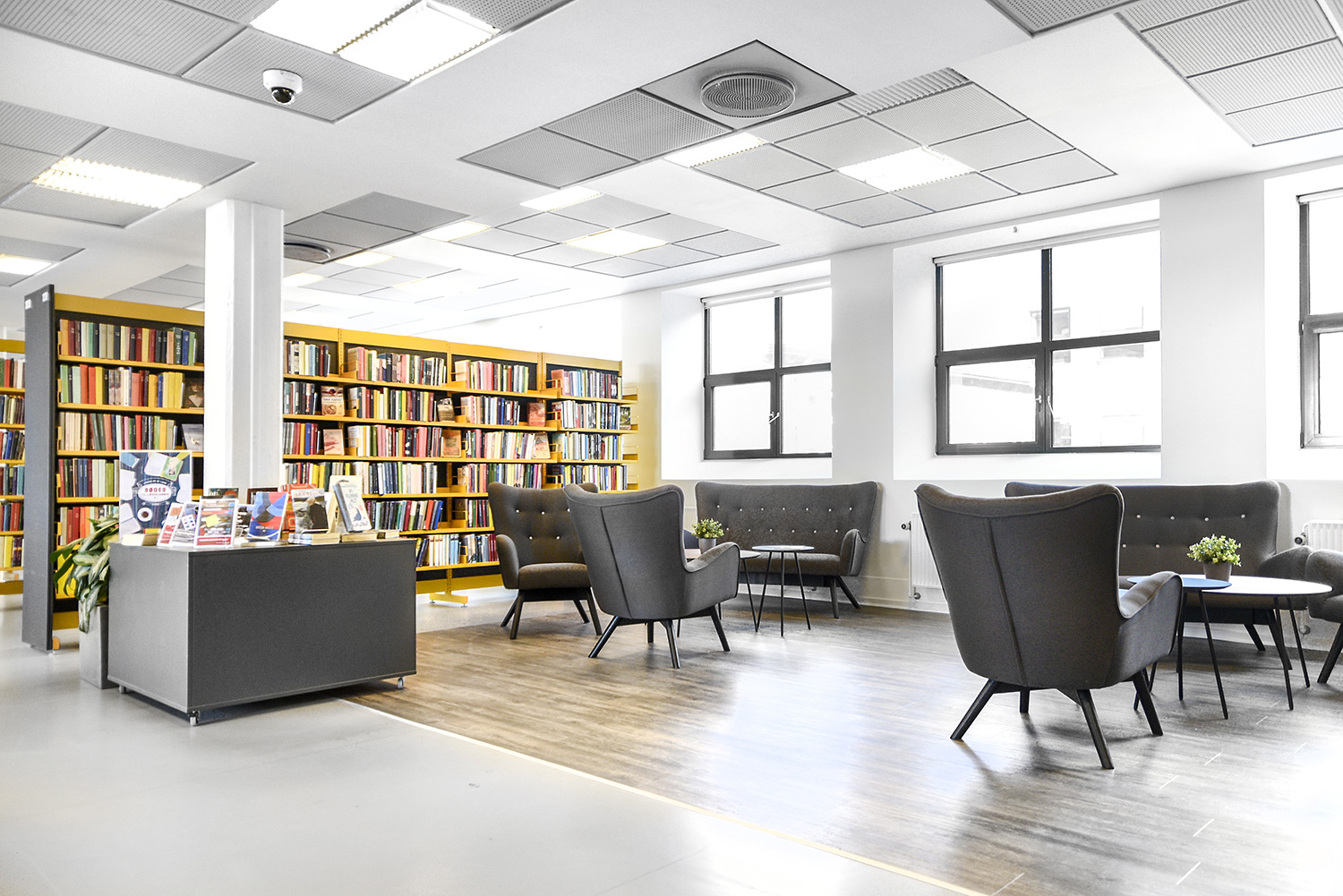 Nu er de gule reoler blevet en del af en helhed, der skaber en moderne fortælling om natur på en stilren og meget unik måde. De gule reoler er blevet en styrke fremfor en nødvendighed. Helheden er opnået ved at lave en stærk farvepalette, hvor de gule, grå og grønne farver sammen med træmaterialerne har et flot samspil, og er med til at understrege naturen i indretningen.