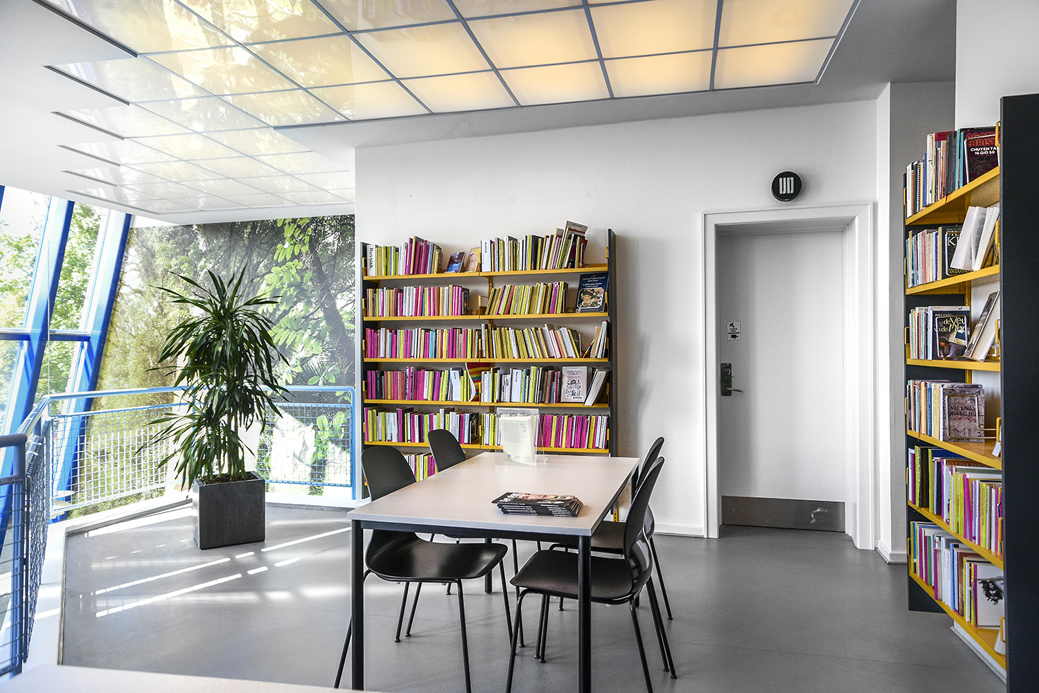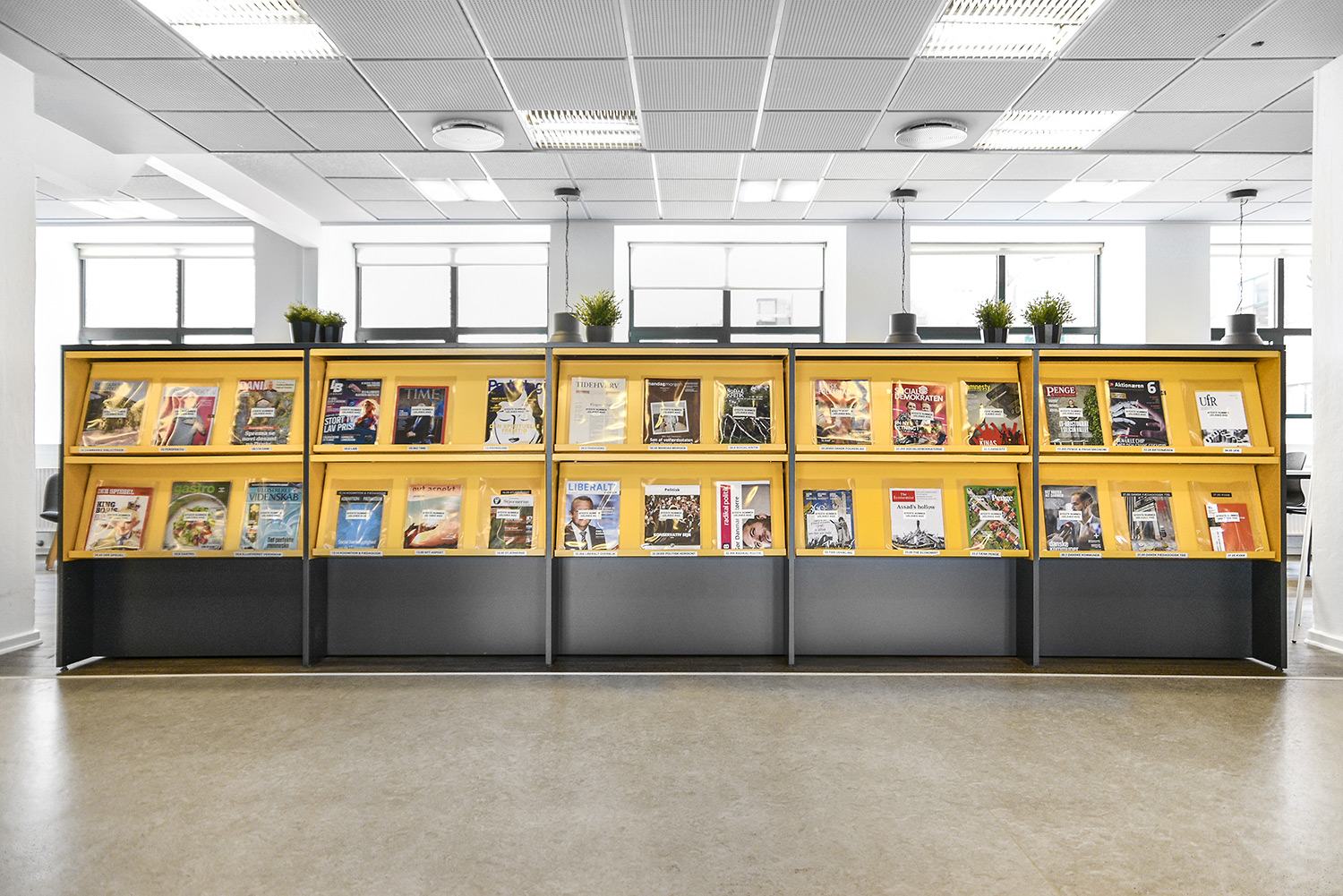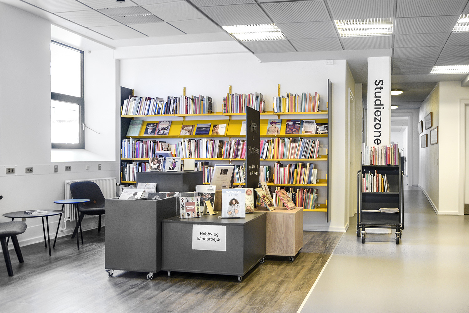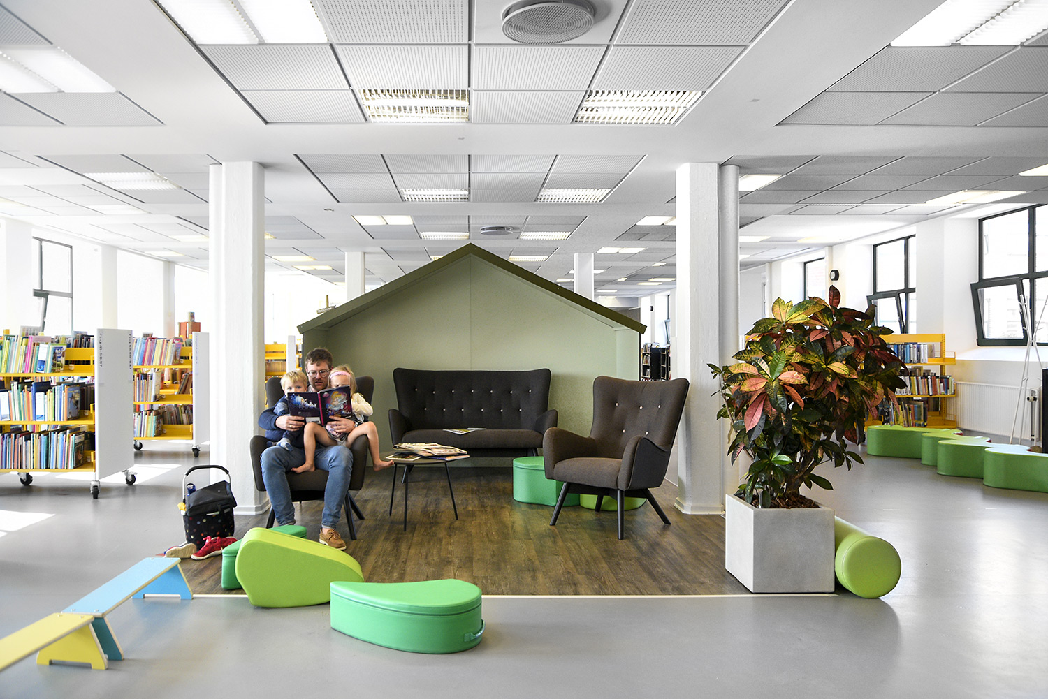 Nu er de gule reoler blevet en del af en helhed, der skaber en moderne fortælling om natur på en stilren og meget unik måde. De gule reoler er blevet en styrke fremfor en nødvendighed. Helheden er opnået ved at lave en stærk farvepalette, hvor de gule, grå og grønne farver sammen med træmaterialerne har et flot samspil, og er med til at understrege naturen i indretningen.