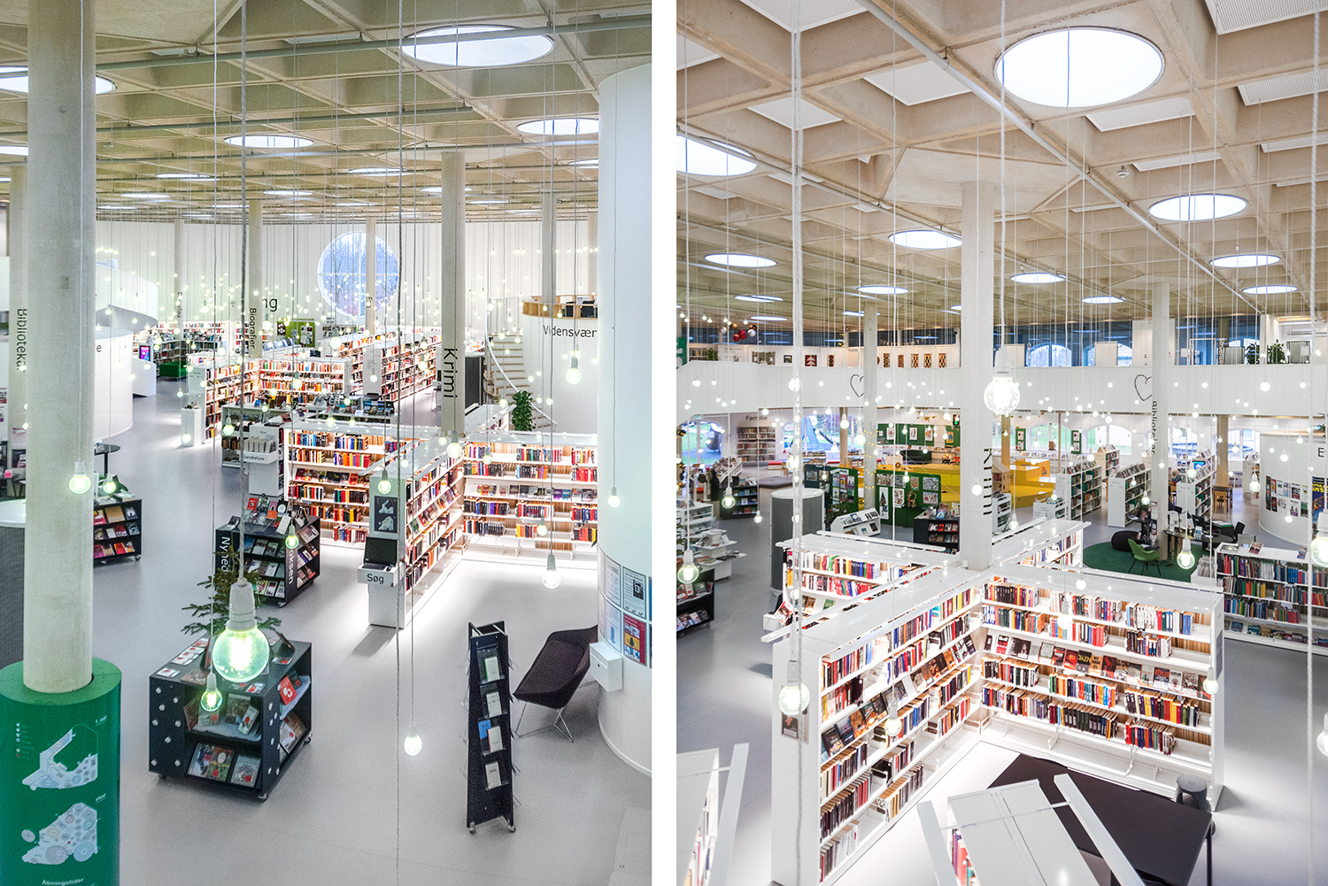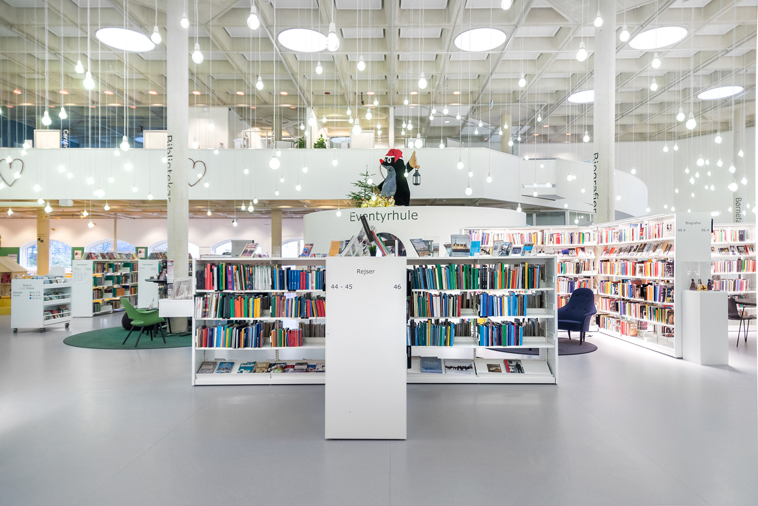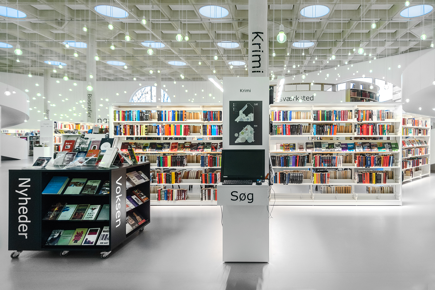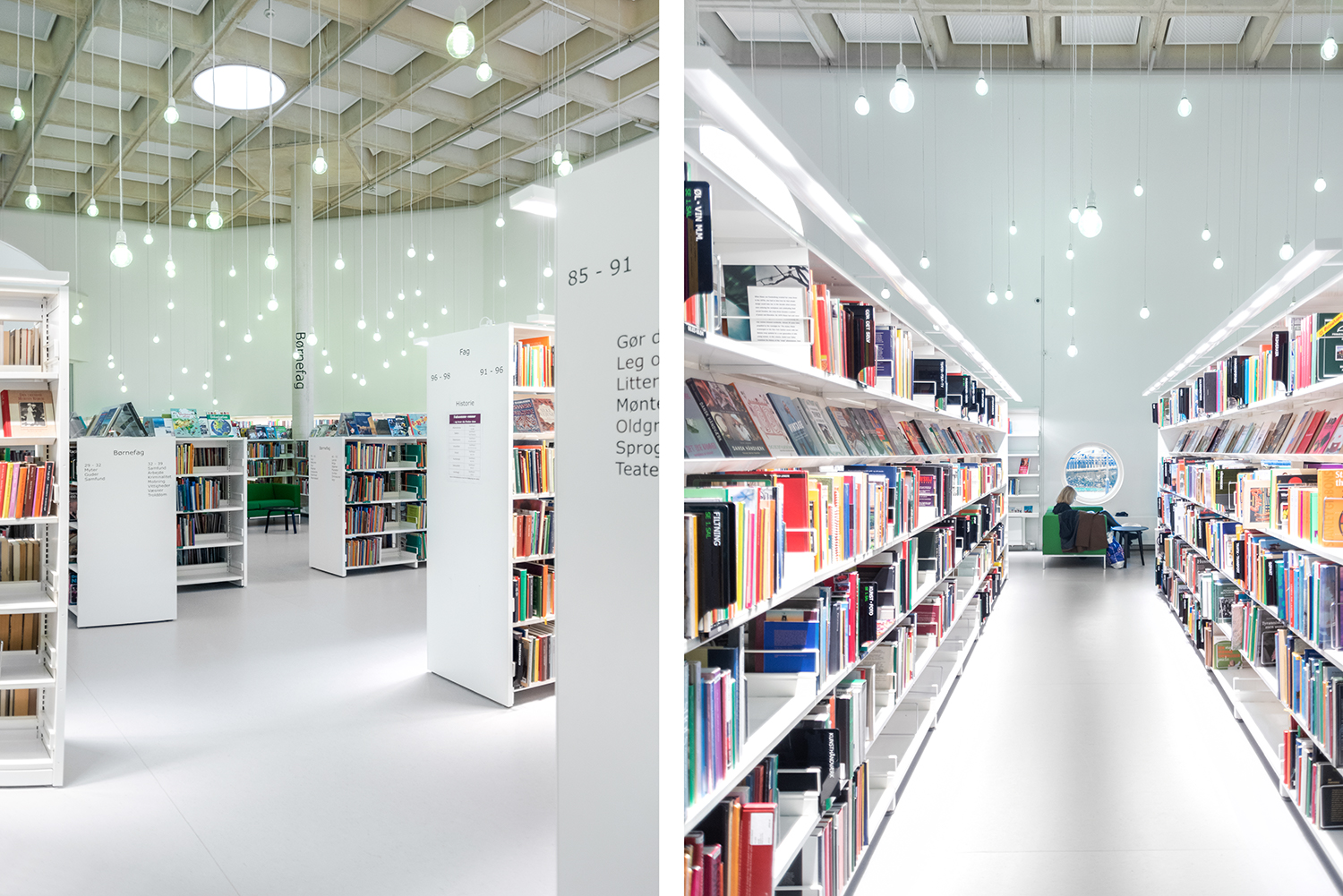 Det lyse, åbne biblioteksrum understøttes godt af både belysning og de hvide reoler, der sætter ekstra fokus på bøgerne.