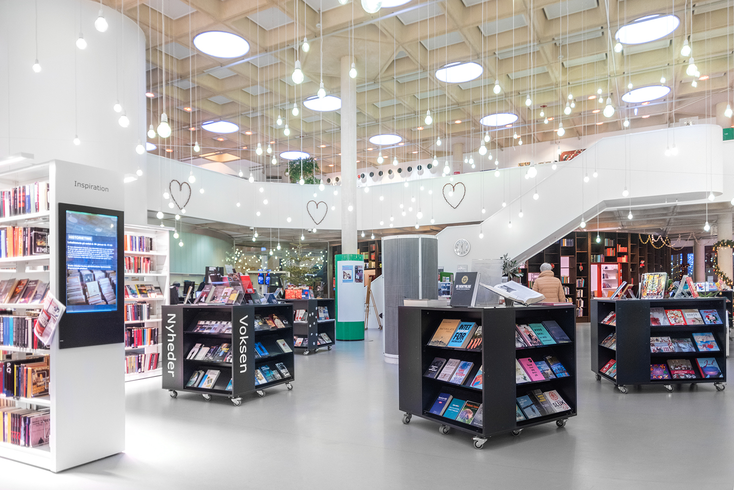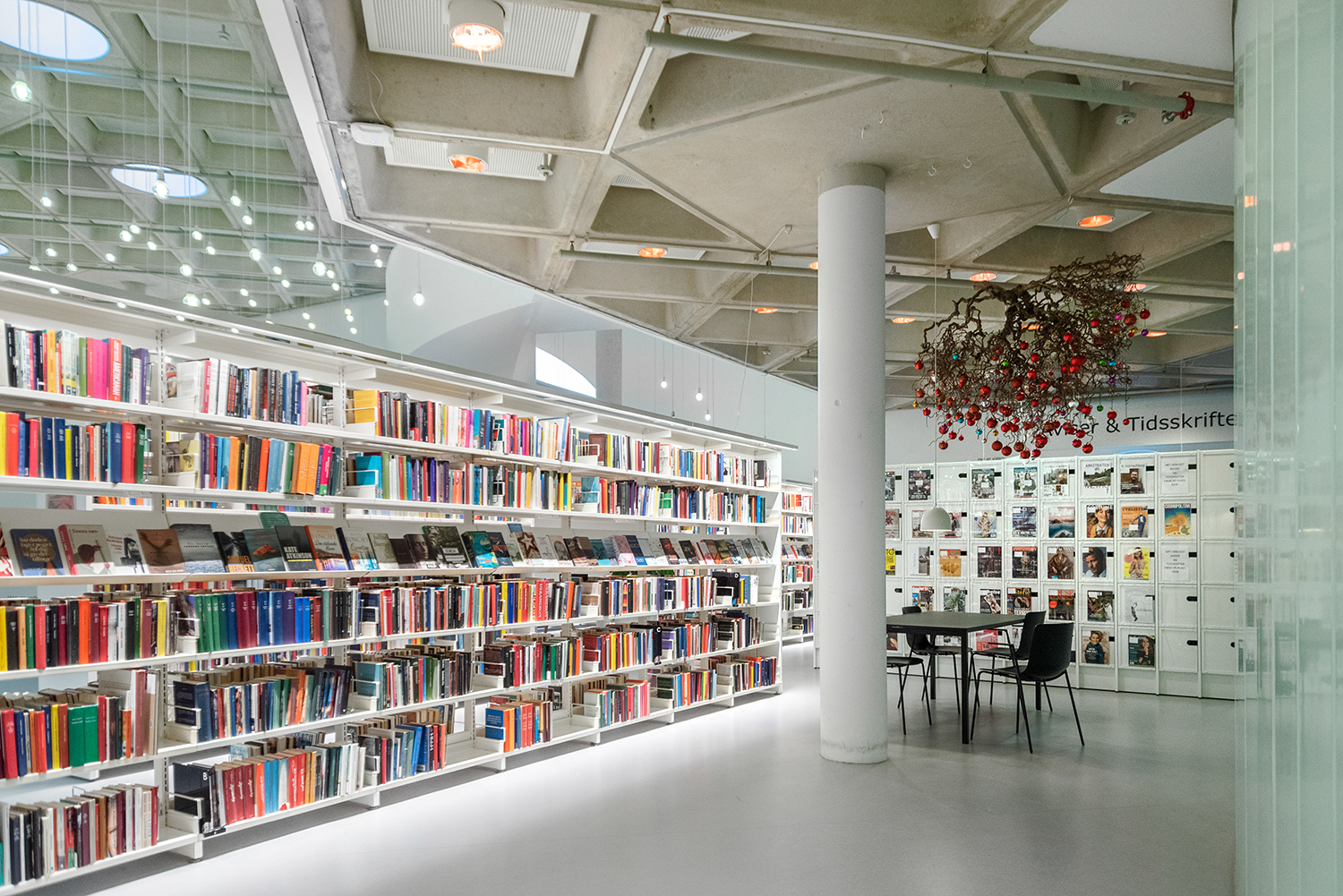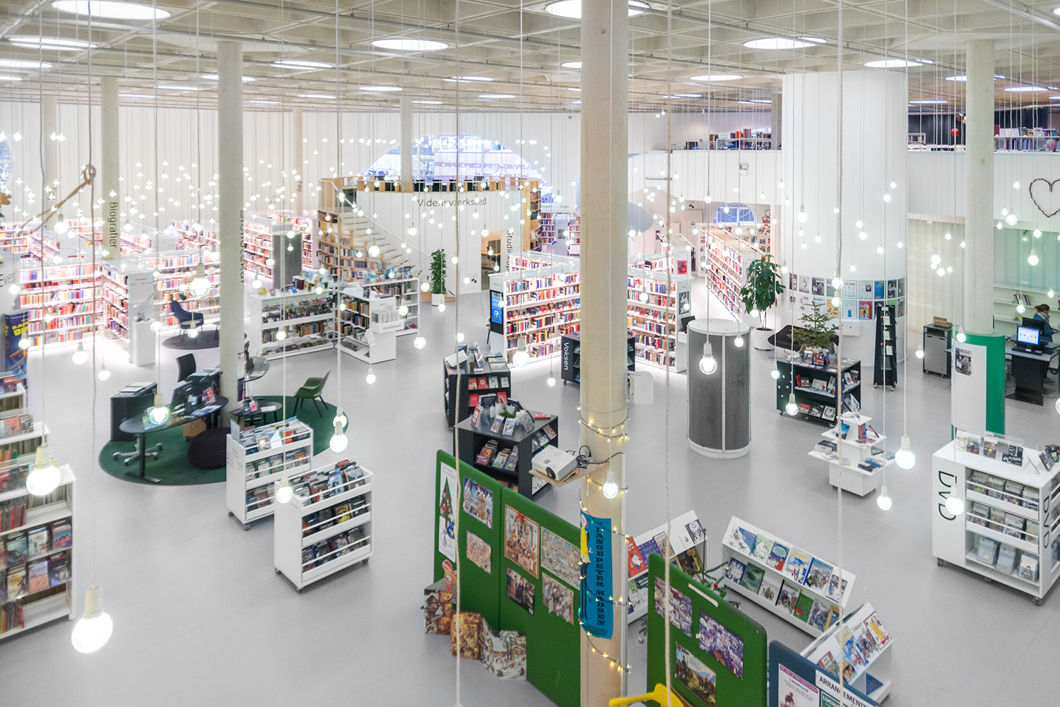 Det lyse, åbne biblioteksrum understøttes godt af både belysning og de hvide reoler, der sætter ekstra fokus på bøgerne.