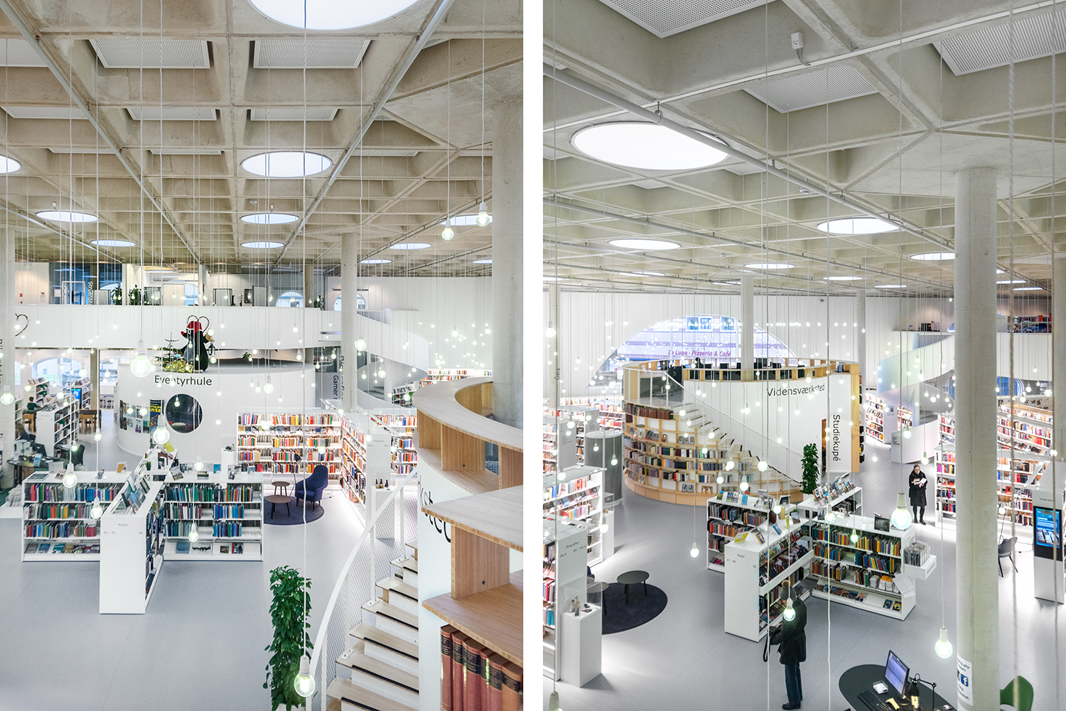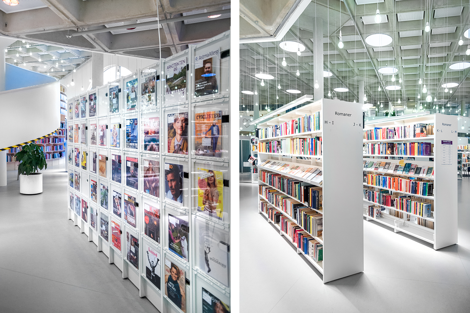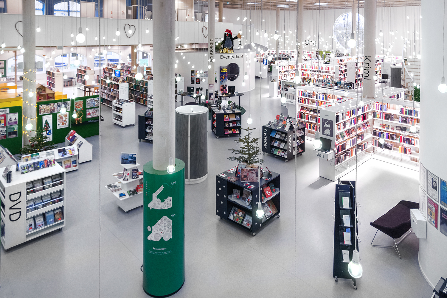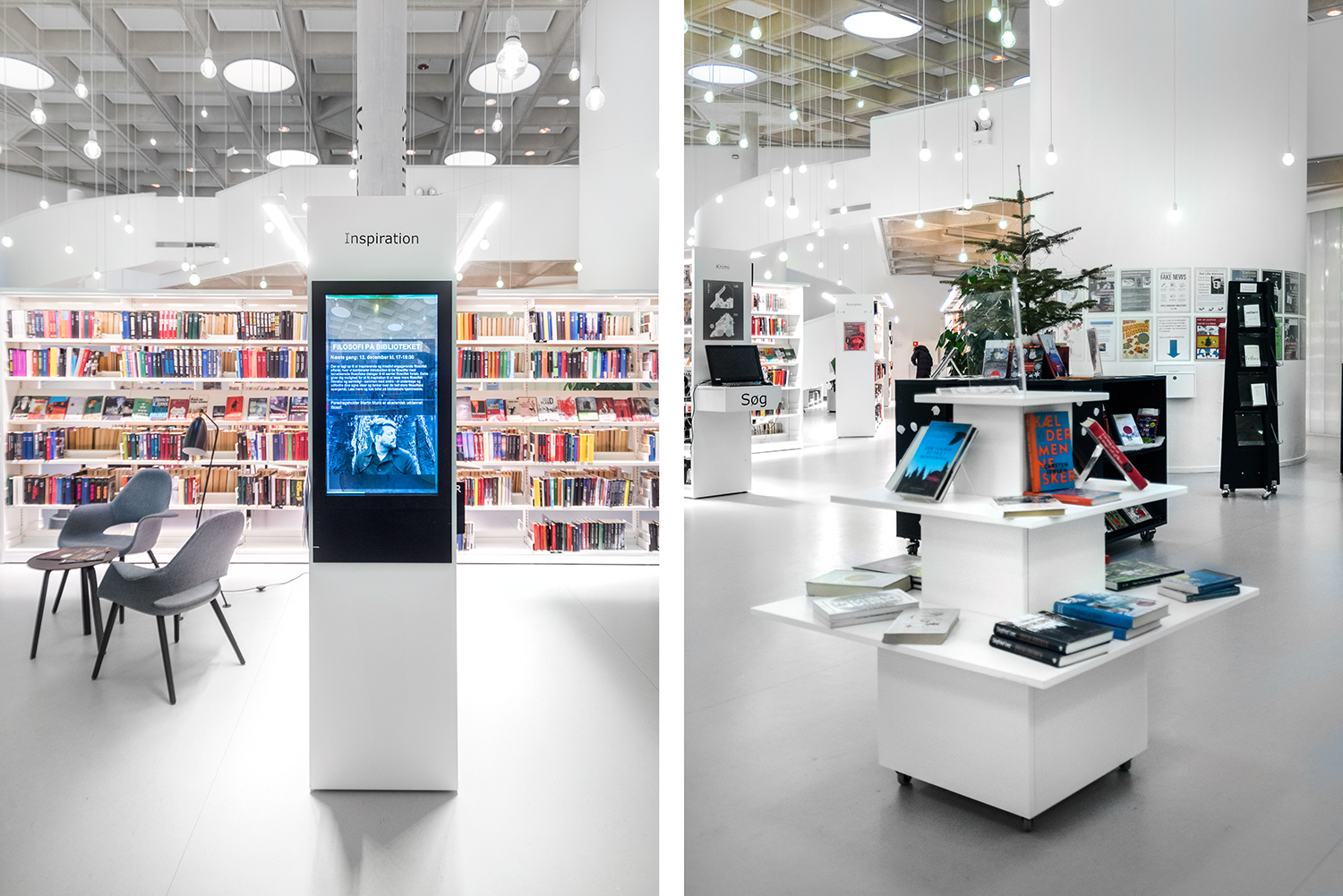 Det lyse, åbne biblioteksrum understøttes godt af både belysning og de hvide reoler, der sætter ekstra fokus på bøgerne.