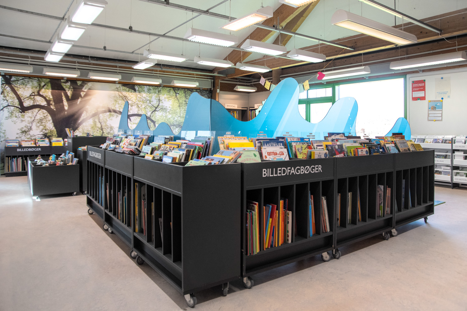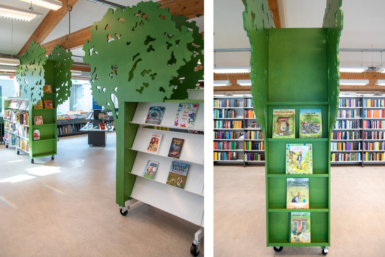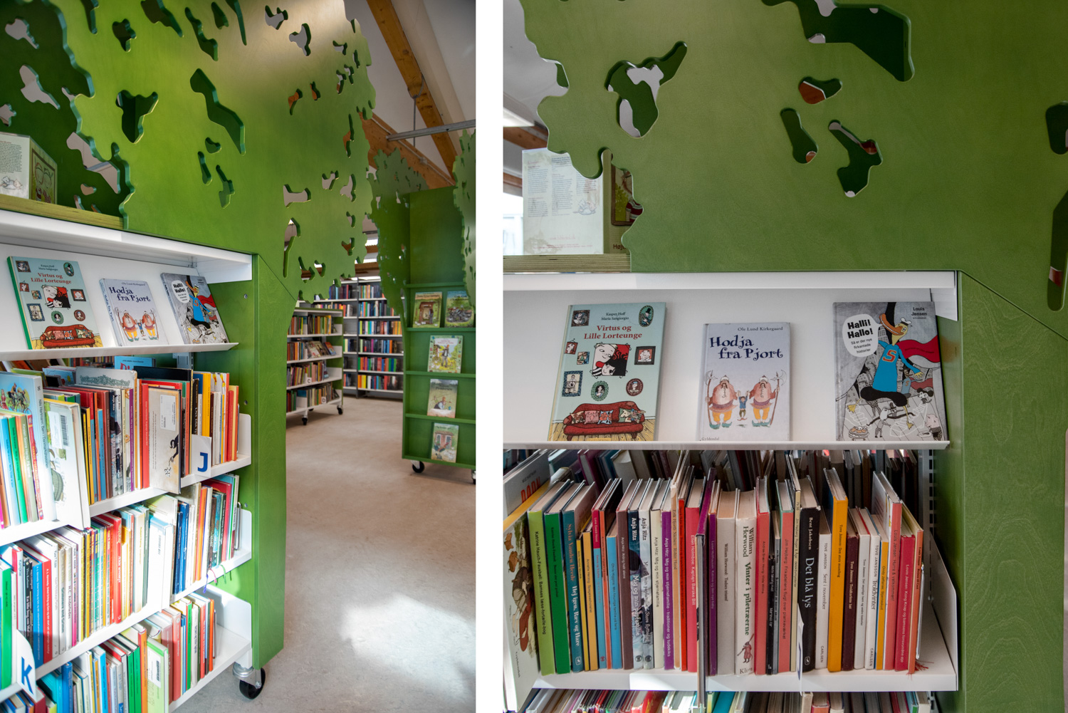 Blandt andet har reolerne fået toppe og gavle bejdset krydsfiner i grønne nuancer, og indgangen til børnebiblioteket er markeret af to store træer. Hertil er der kommet nye krybber til pegebøger, som er integreret med et sidde- og legepodie. Et stort tæppe med græs og vand skaber rum til leg og ophold ved vinduet, og de gamle krybber til fagbilledbøger omkranser området sammen med en akrylvæg med print af bølger og fisk.
