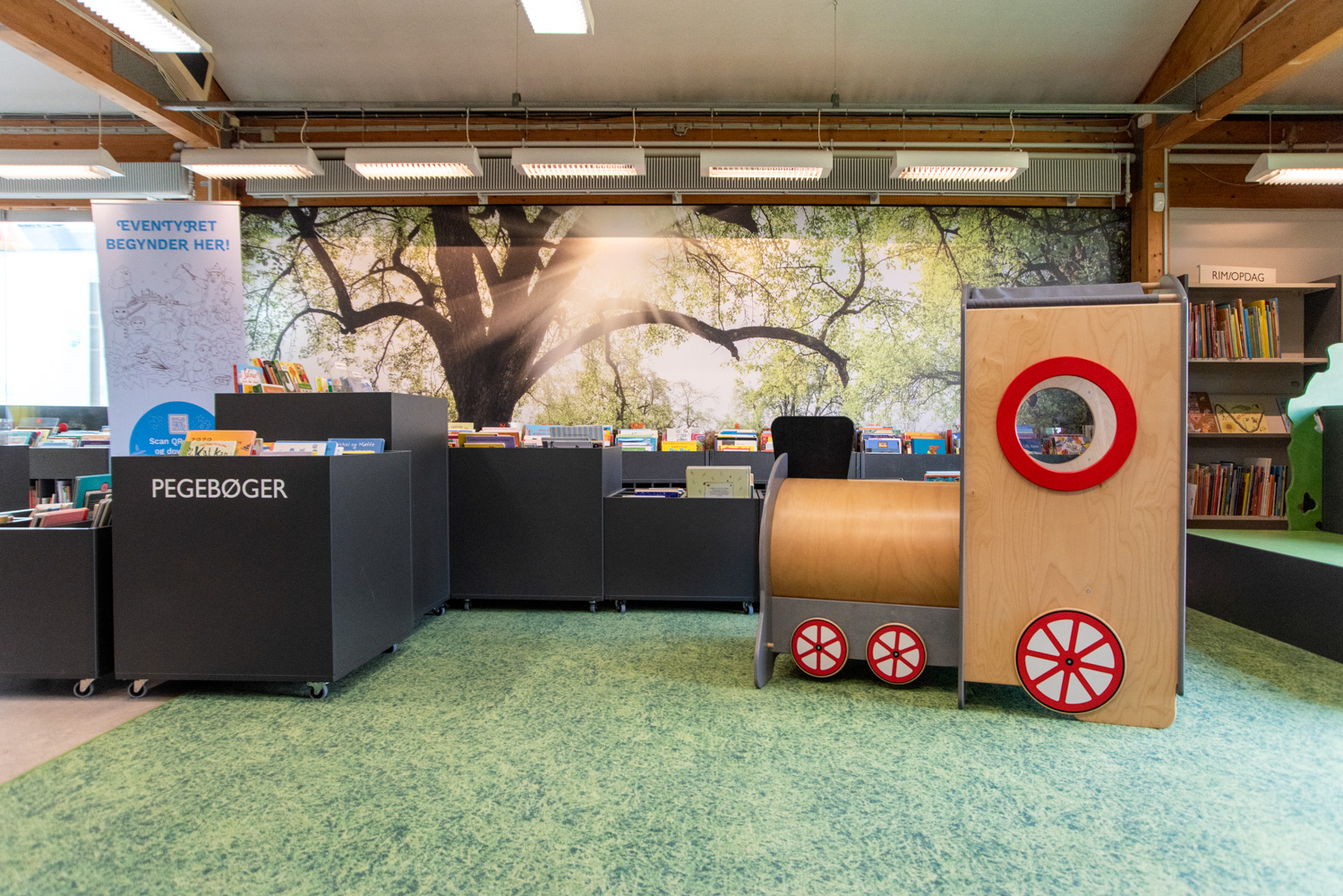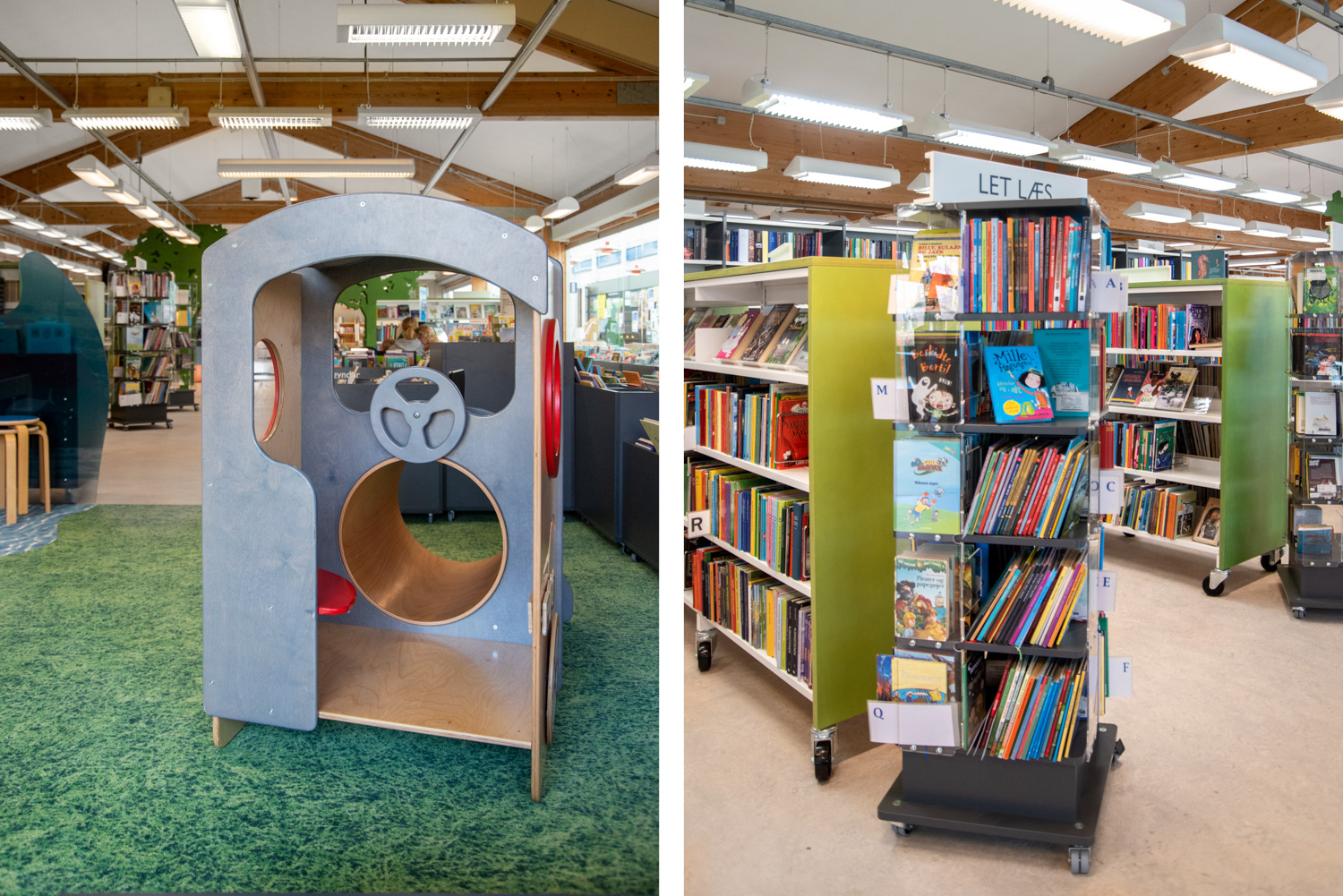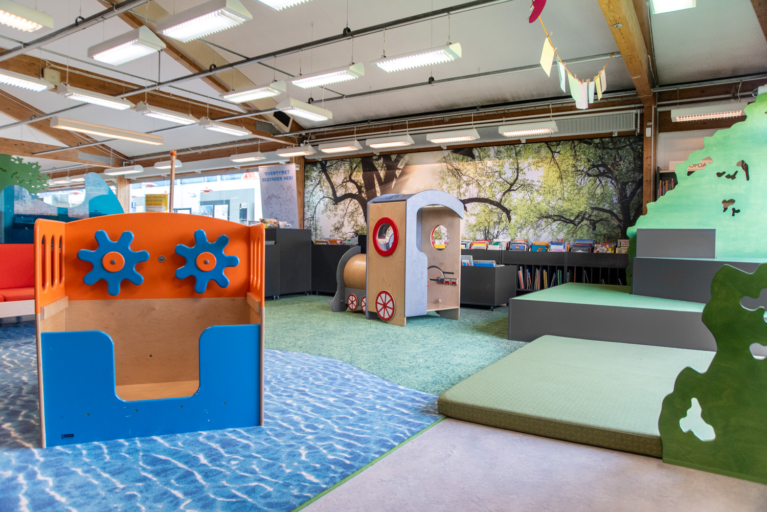 Det gamle legeskib- og tog er blevet bevaret, men har nu fået et sted at høre til. Således går gammelt biblioteksinventar og nye produkter hånd i hånd på dette fantasifulde børnebibliotek.