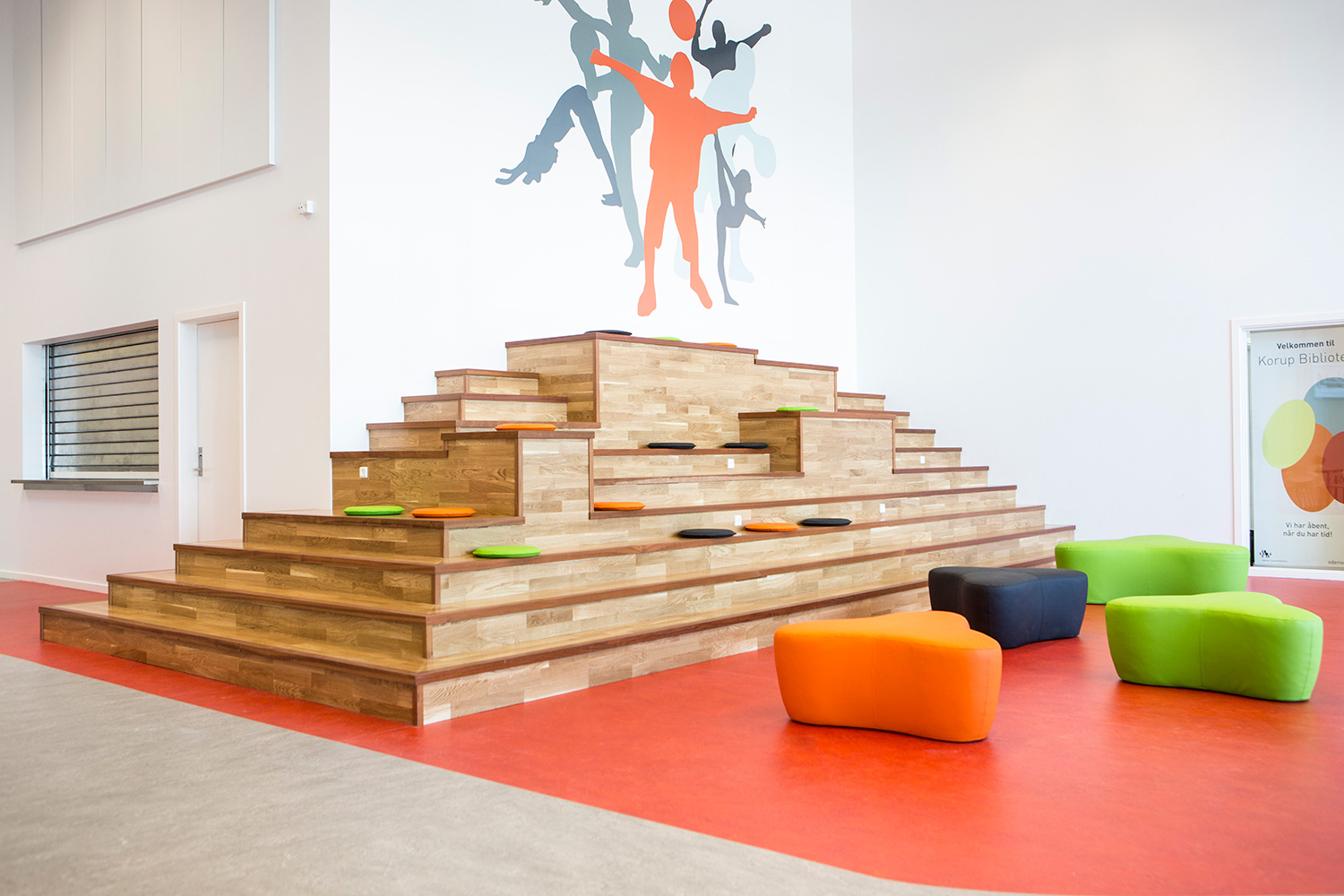 Det nye bibliotek i Korup er placeret i tilknytning til en nyrenoveret sportshal. Biblioteket består af et rum med høje vægge og kvadratiske vinduer i forskellige højder. Ved vinduerne har væggen fået en farve som får rummet til at trække sig sammen. Desuden udnyttes vinduerne til siddepladser og hyggekroge, så dagslyset og det lille areal udnyttes optimalt.