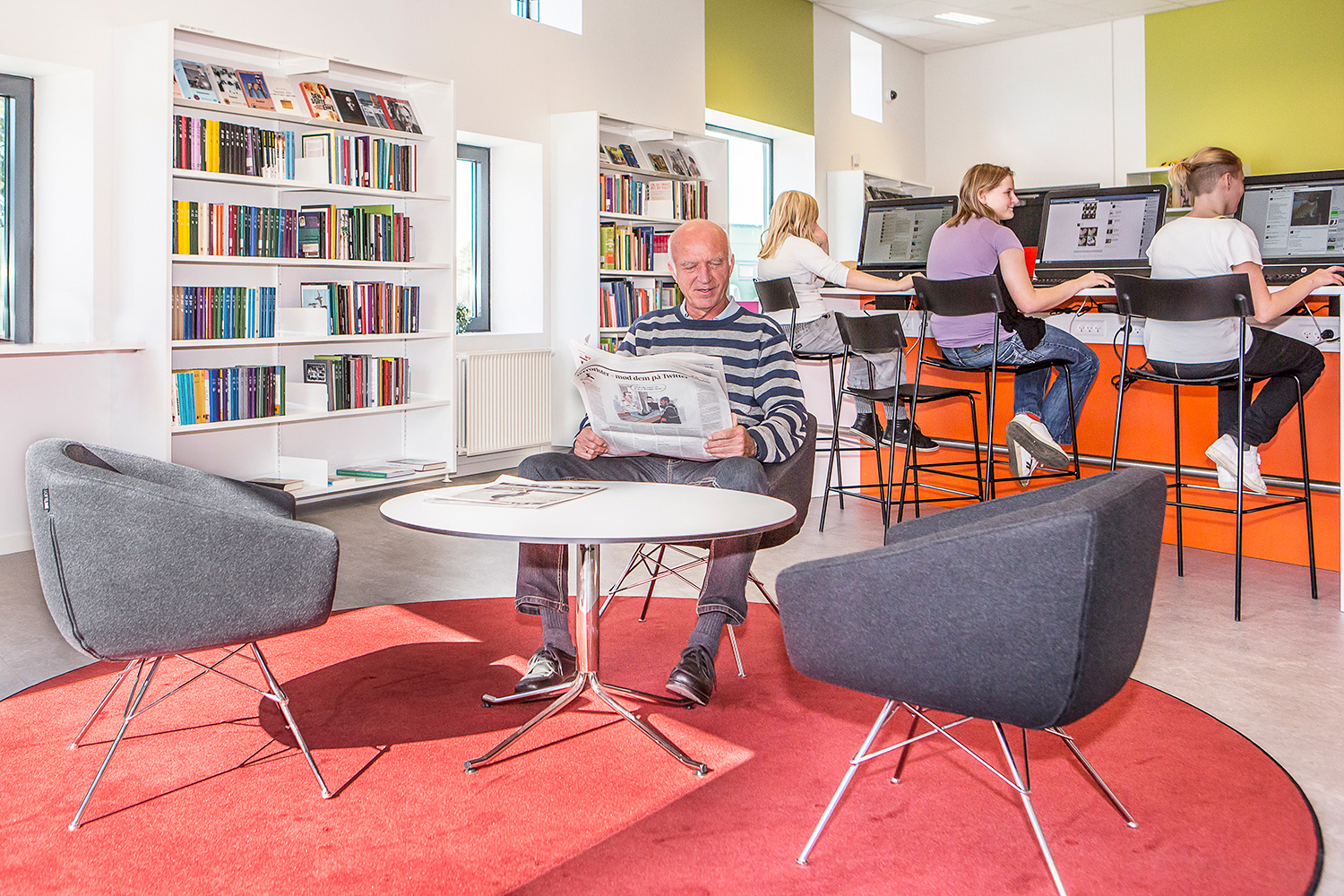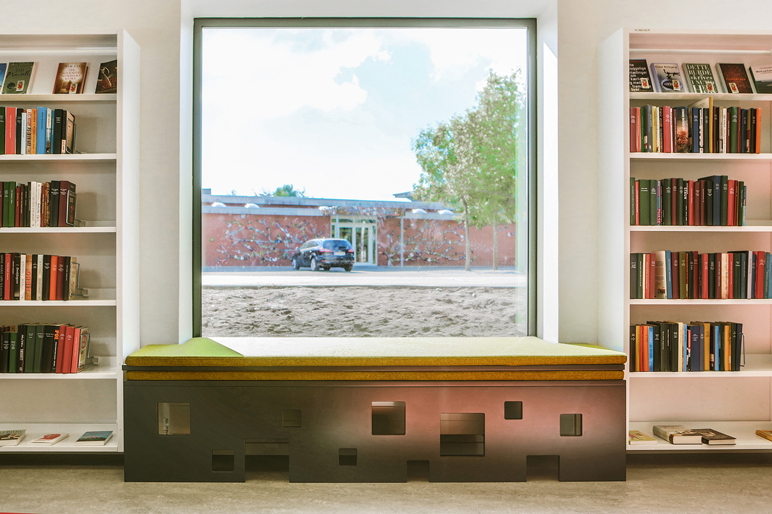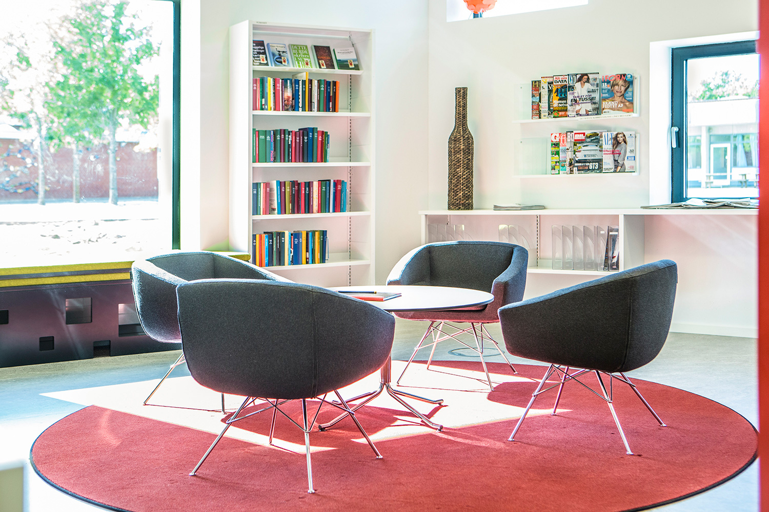 Der er indrettet med standardreoler i forskellige højder, som fint spiller sammen med vinduernes spring op og ned i vinduesvæggen.