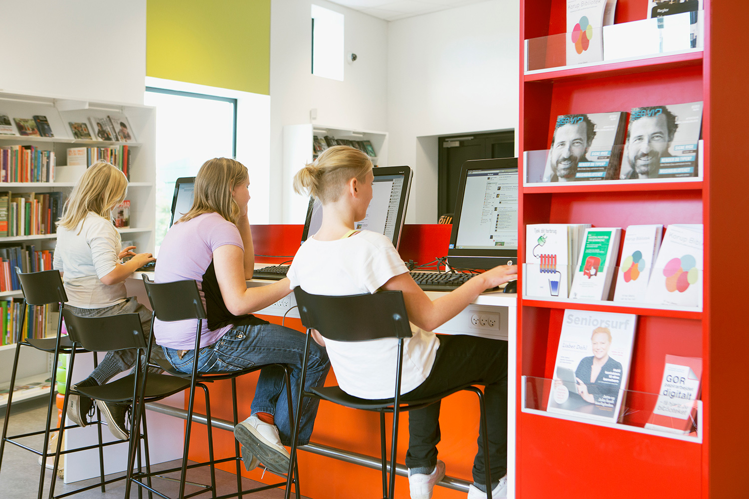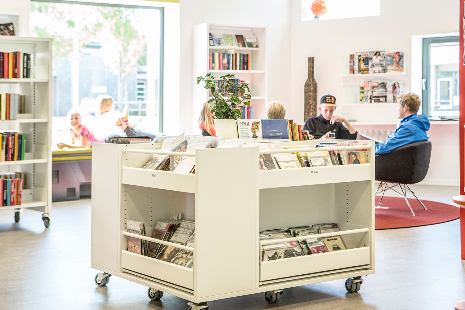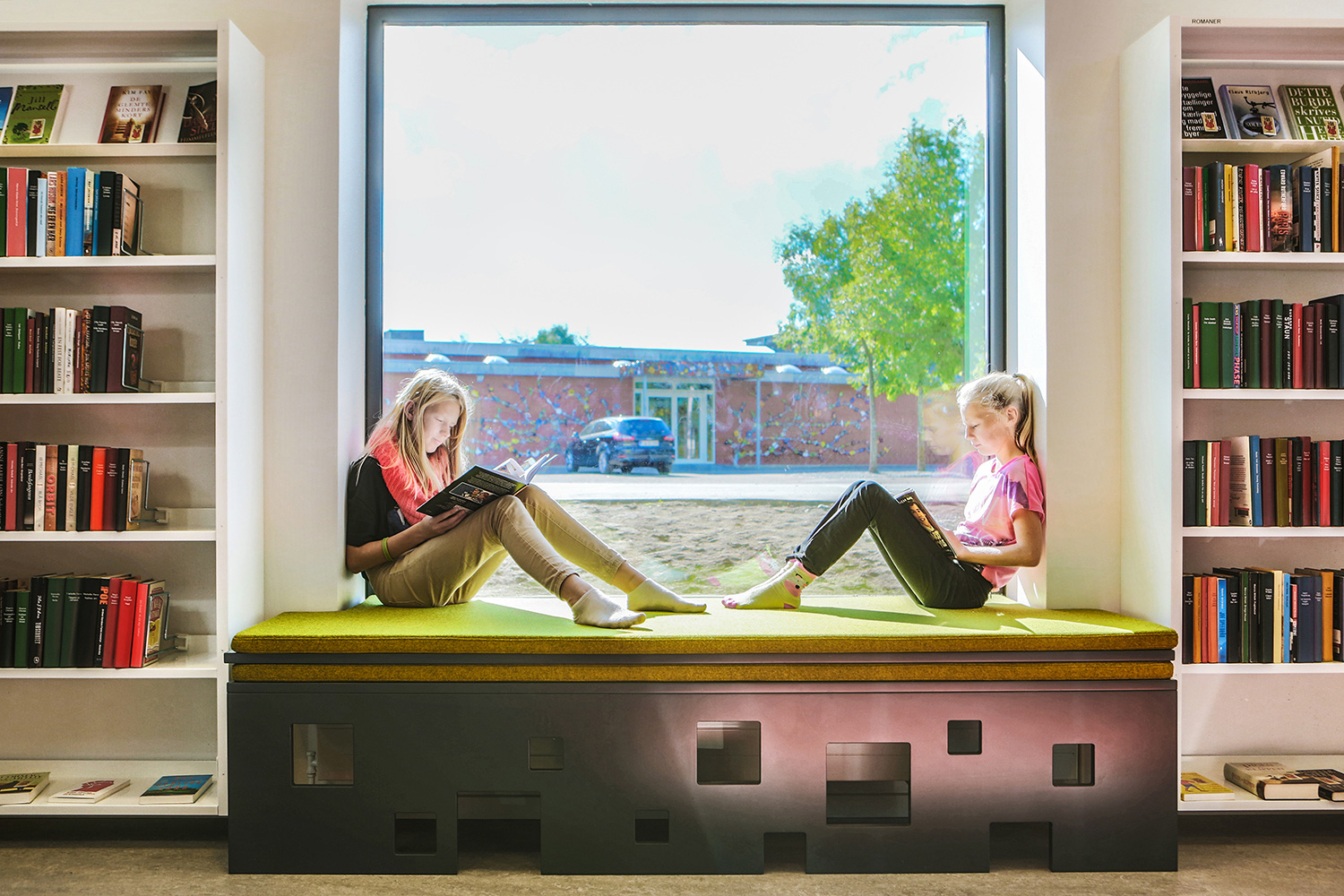 Der er indrettet med standardreoler i forskellige højder, som fint spiller sammen med vinduernes spring op og ned i vinduesvæggen.
