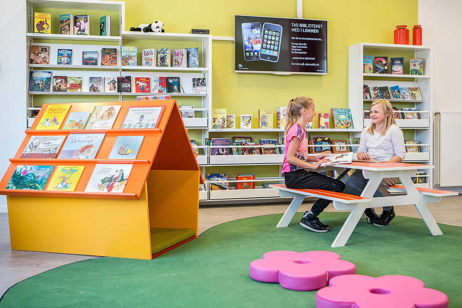 En søjle midt i rummet har fået en vigtig funktion som rumdeler imellem børn og voksne og er næsten blevet et møbel i sig selv i forbindelse med pc-bord og pjeceudstilling.