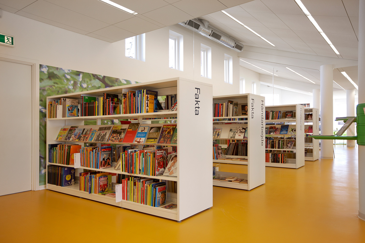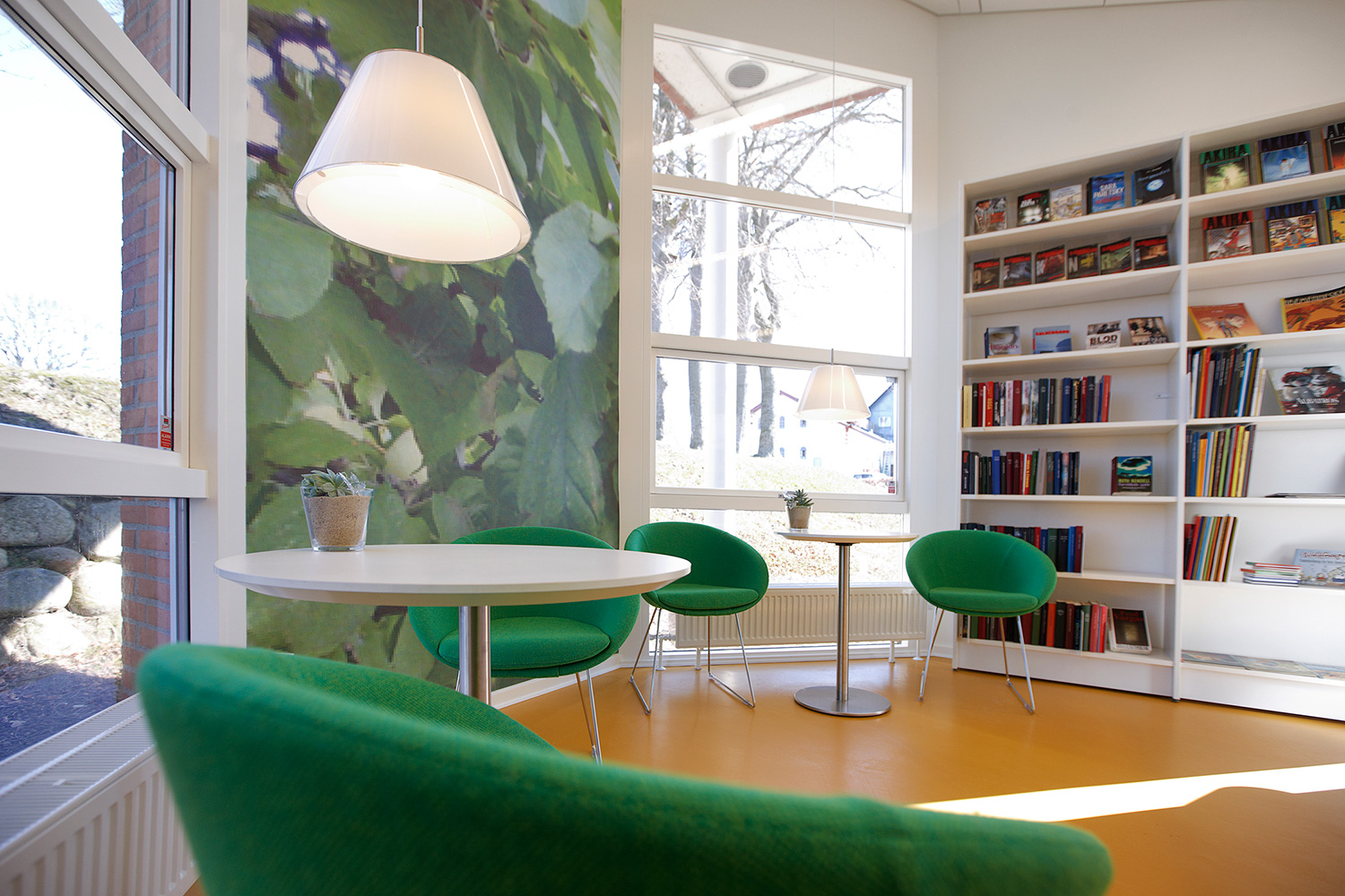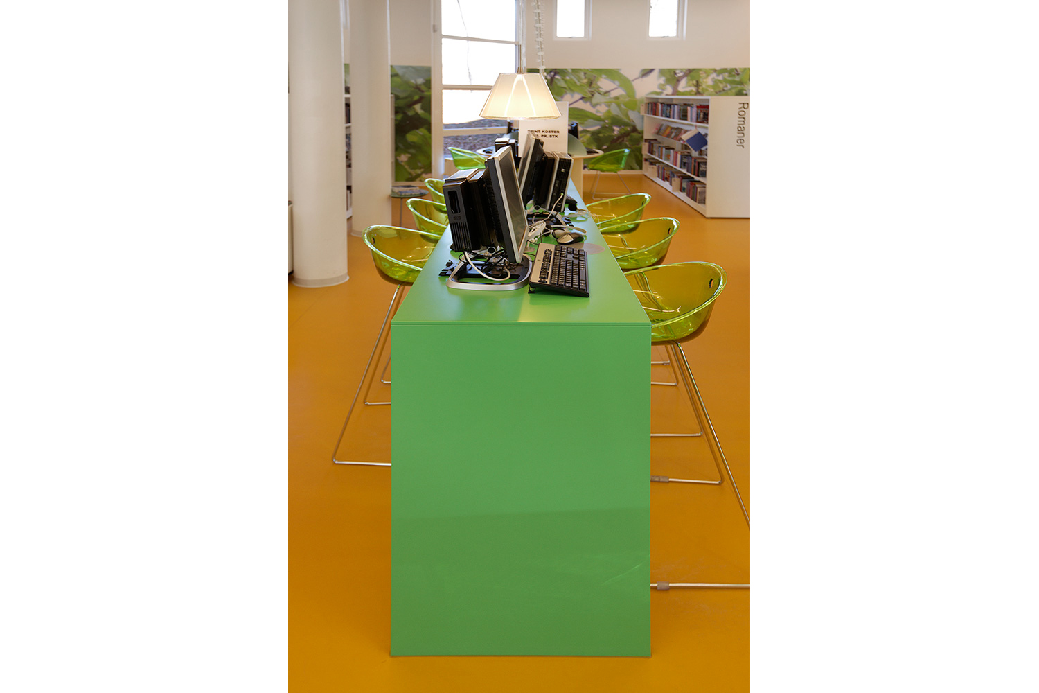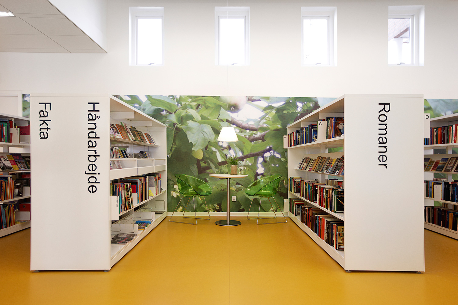 Som baggrund for den grønne linie er biblioteket udstyret med hvidlakerede 60/30 klassisk stålreoler og møbler i lyse, klare farver.
