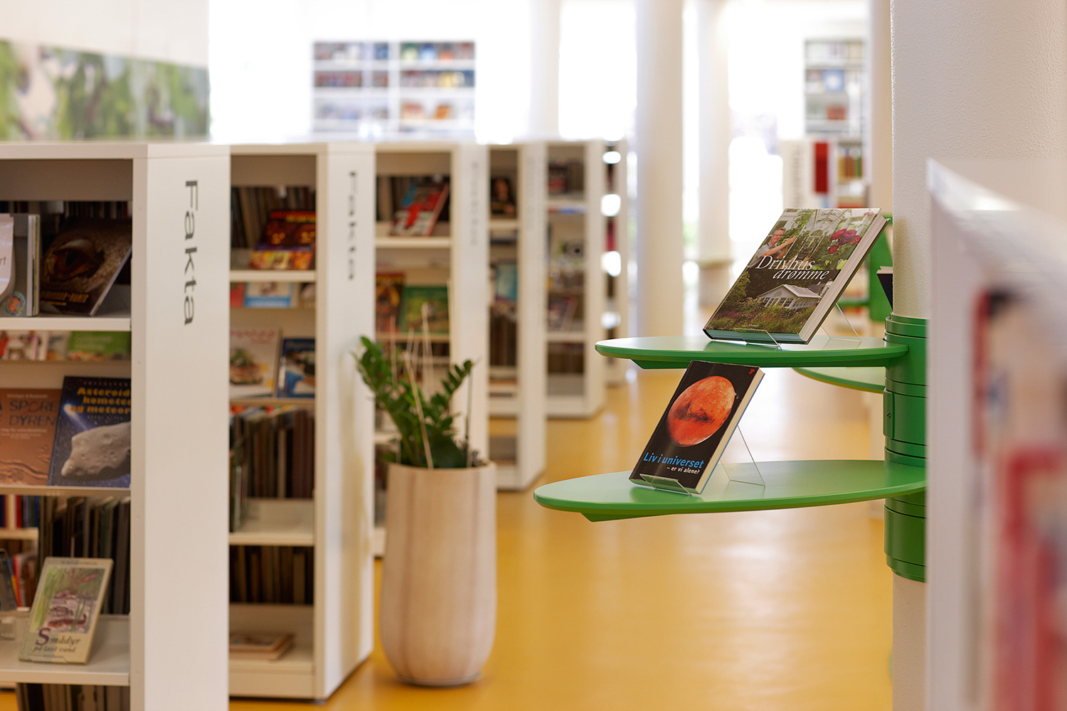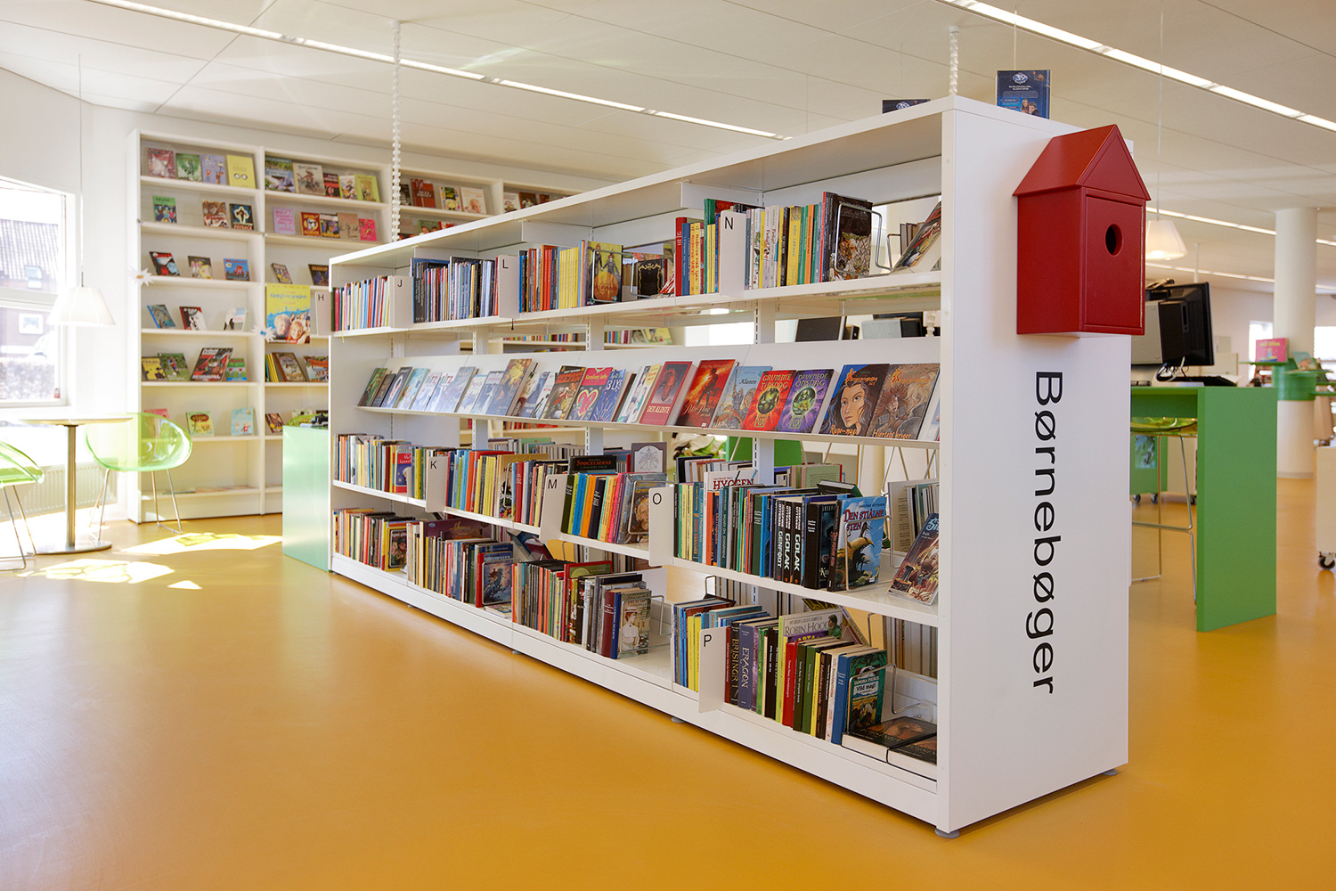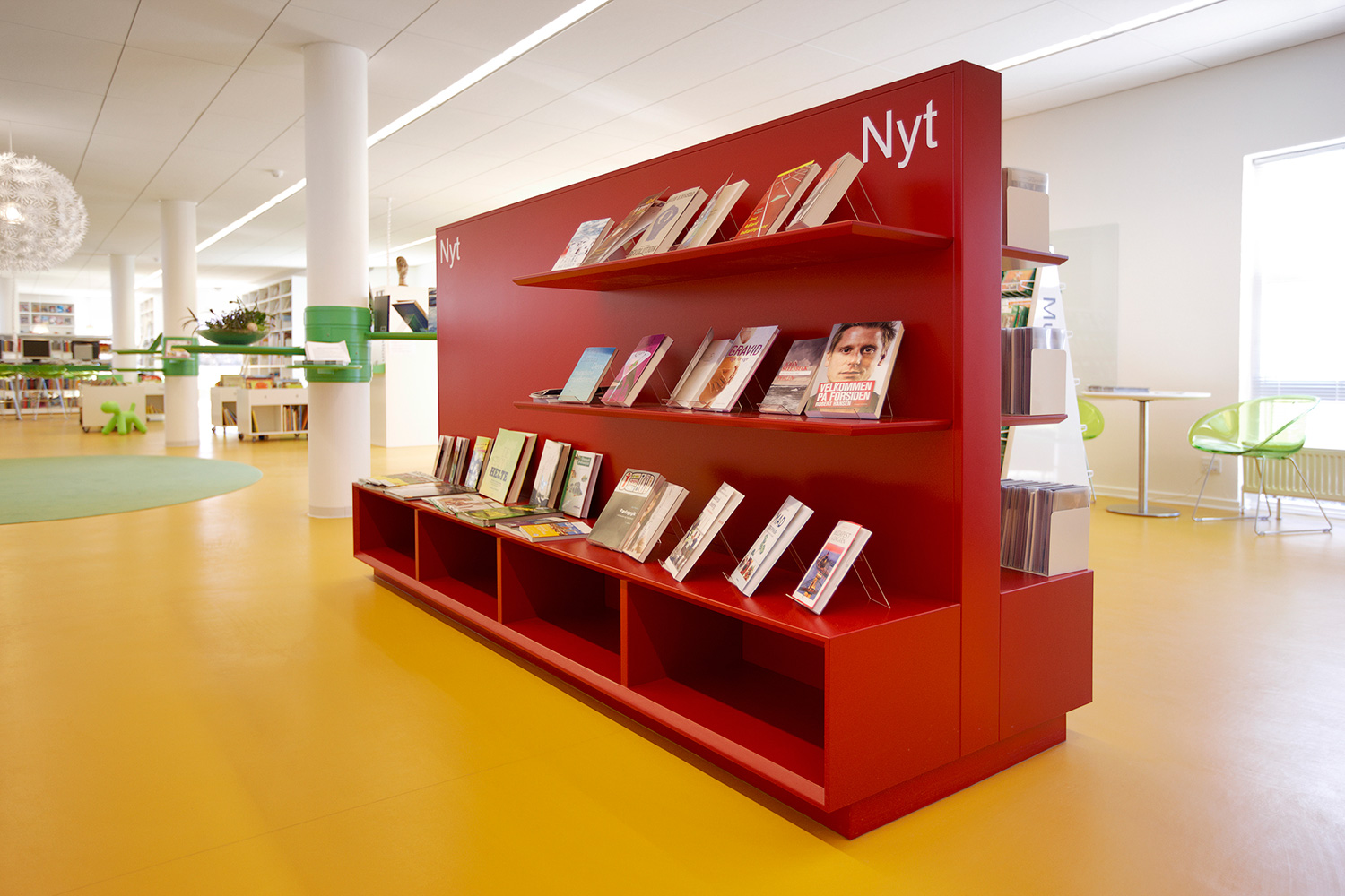 Som baggrund for den grønne linie er biblioteket udstyret med hvidlakerede 60/30 klassisk stålreoler og møbler i lyse, klare farver.