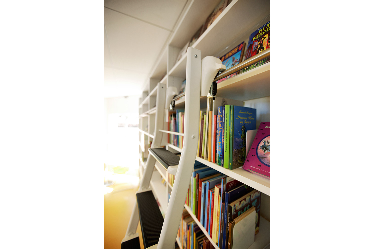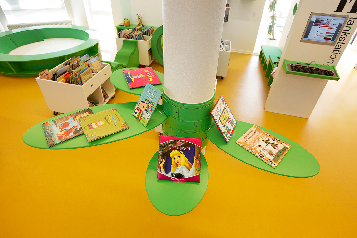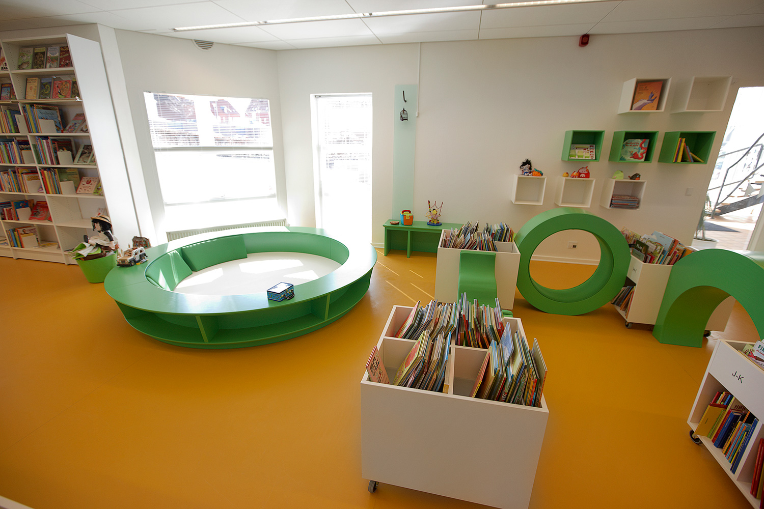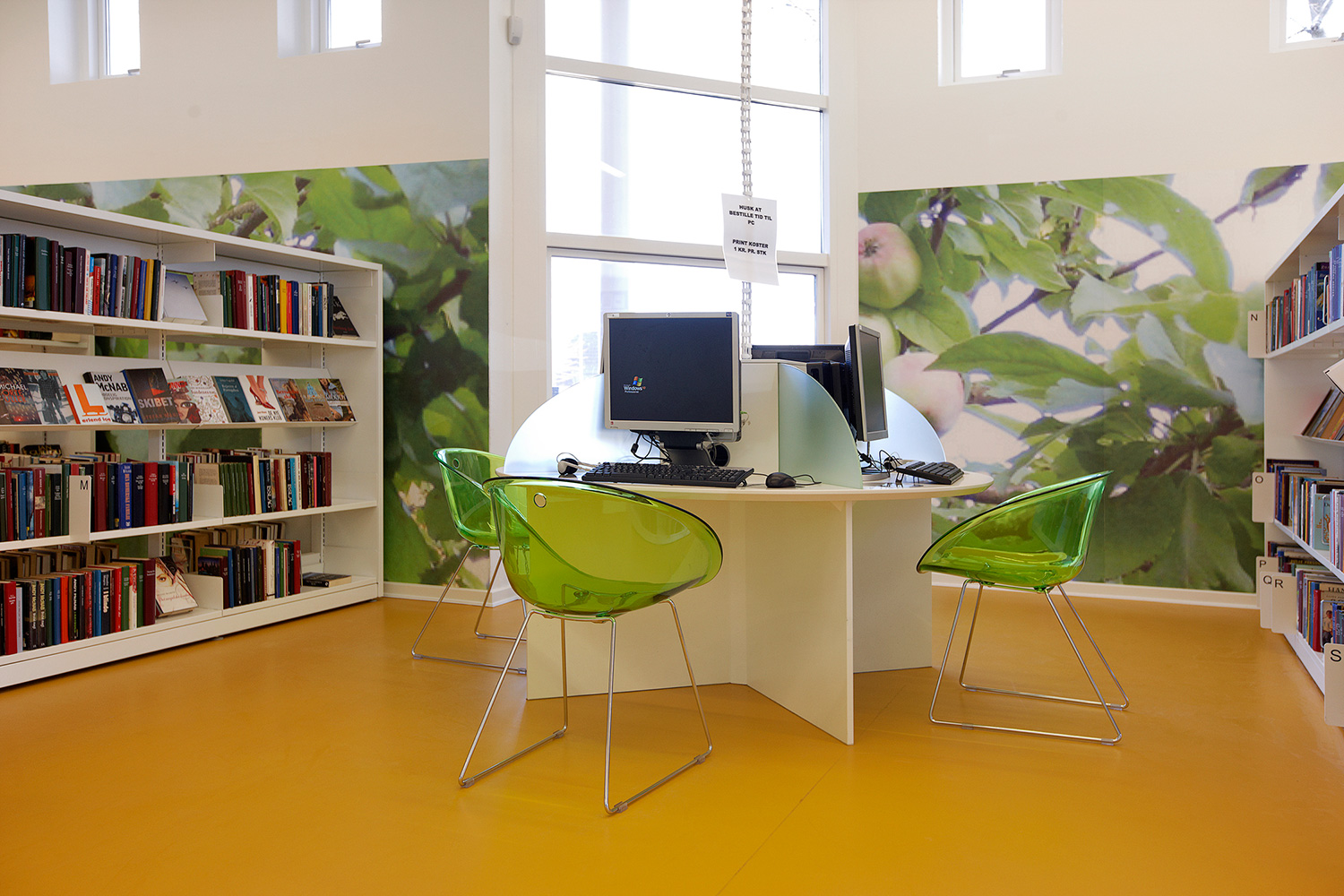 Som baggrund for den grønne linie er biblioteket udstyret med hvidlakerede 60/30 klassisk stålreoler og møbler i lyse, klare farver.
