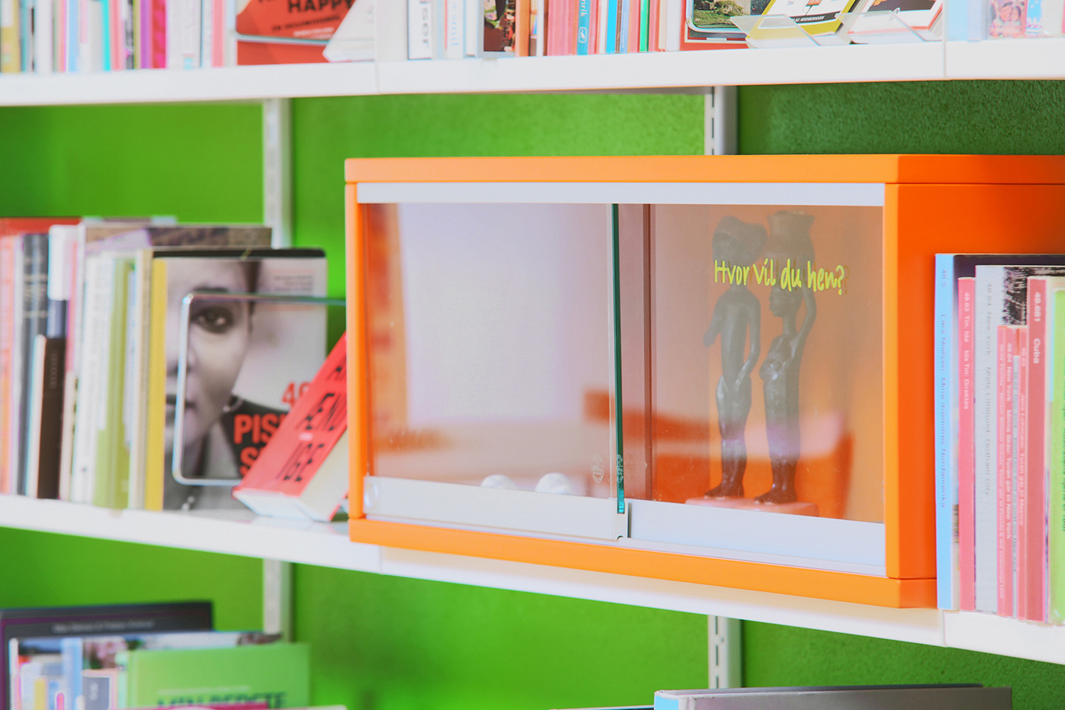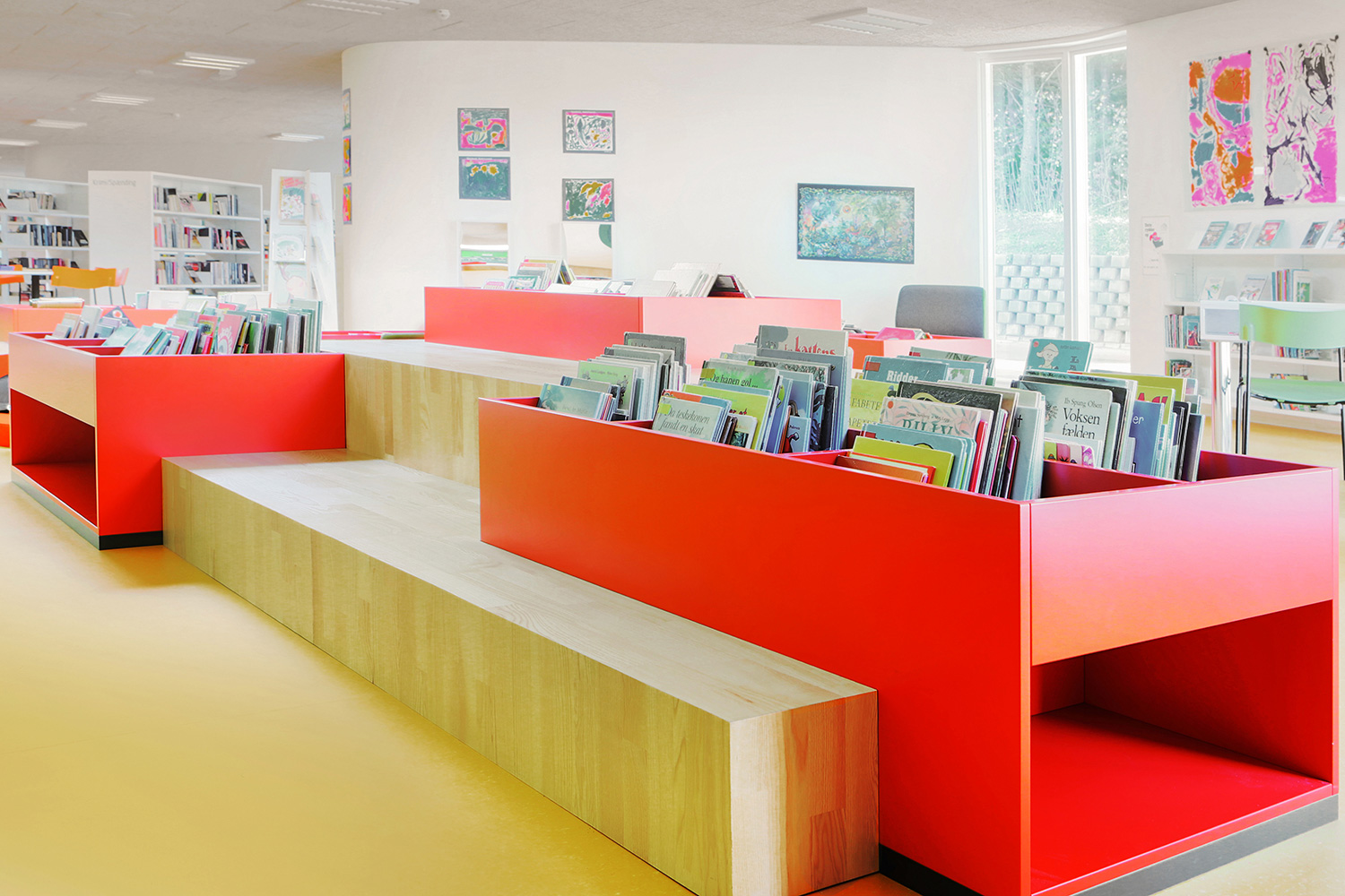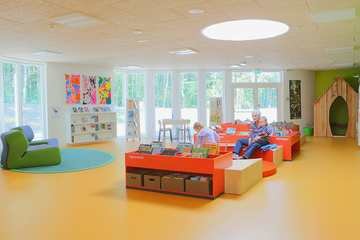 I børneafdelingen findes et specialtegnet stort lege-siddemøbel med indbyggede krybber til udstilling af billedbøger og væghængte reoler i forskudte højder giver dynamik til rummet. Mobile orange udstillingsmoduler er placeret i reolerne for at skabe opmærksomhed om udvalgte emner eller for at danne mindre specialudstillinger.