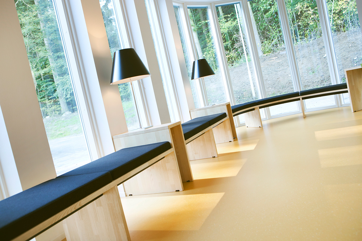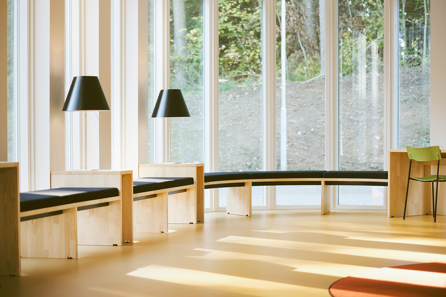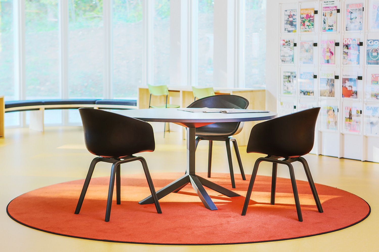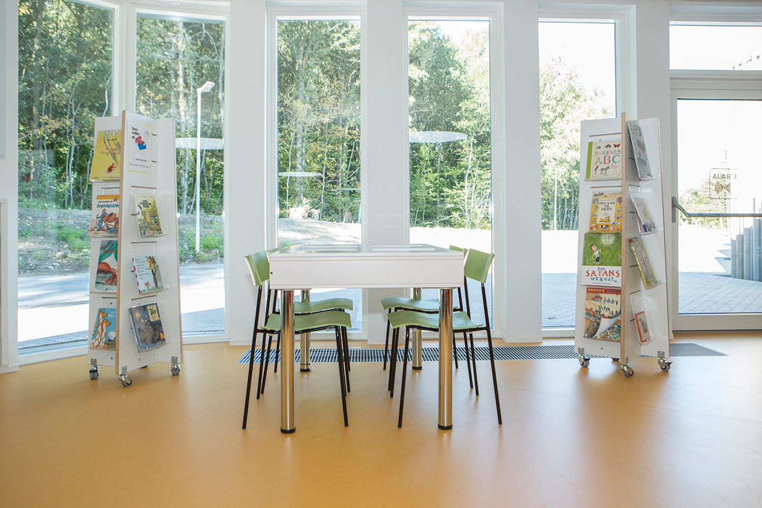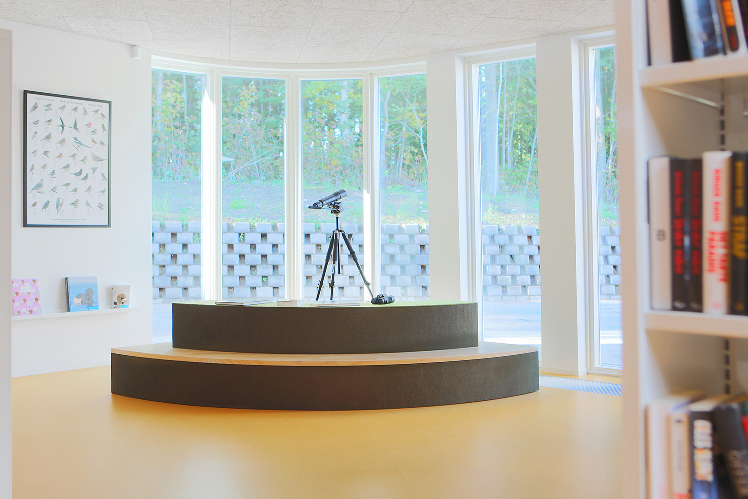 Naturen er omdrejningspunktet i bibliotekets indretning. For eksempel, er der langs vinduespartiet placeret projekttilpassede møbler i ask med fuld udnyttelse af dagslyset. Derudover giver en speciallavet udkigstrappe beklædt med filt mulighed for at se naturen på tættere hold. Naturens grønne farver er trukket med ind i biblioteket og giver et godt samspil med de øvrige gule og orange farver.