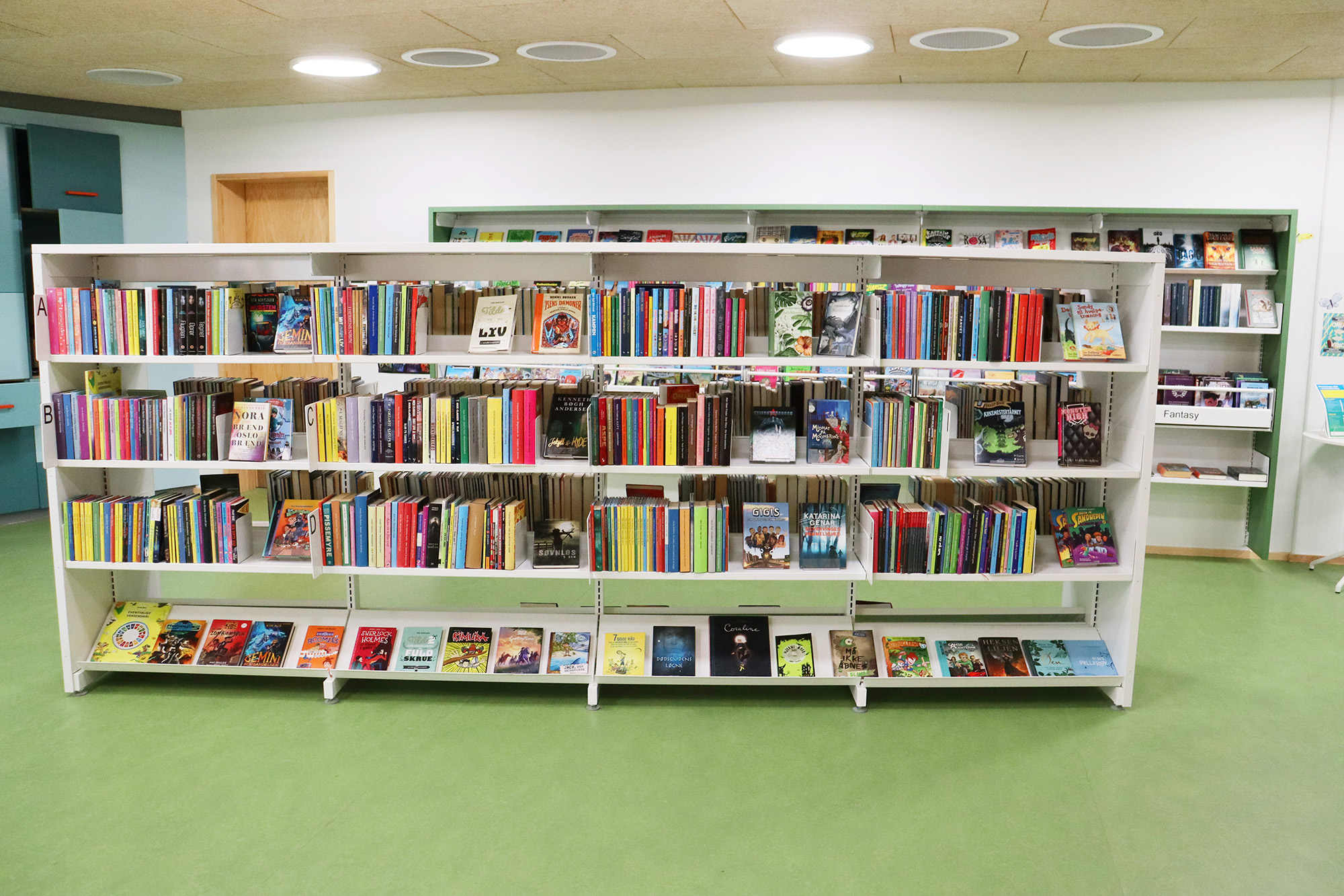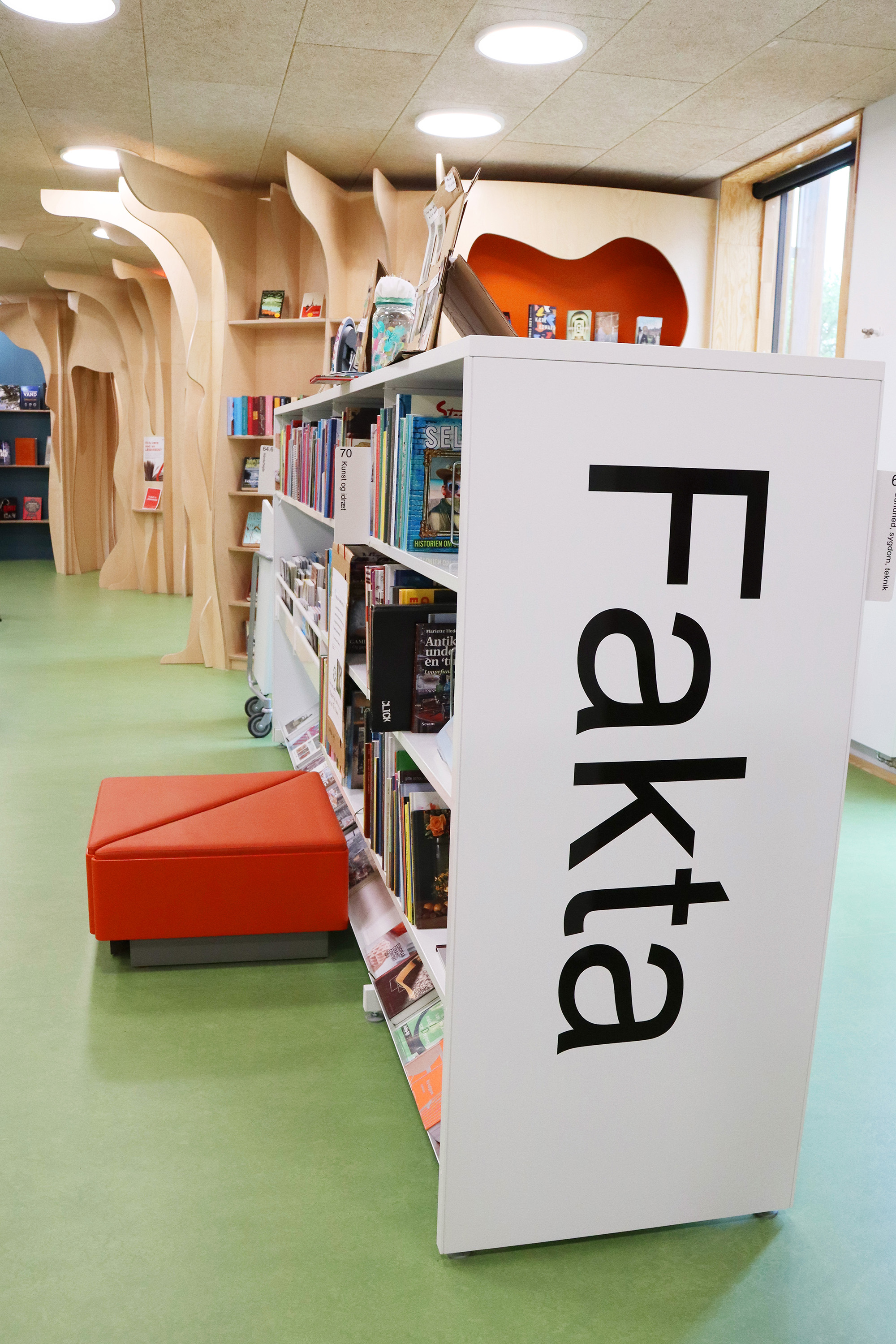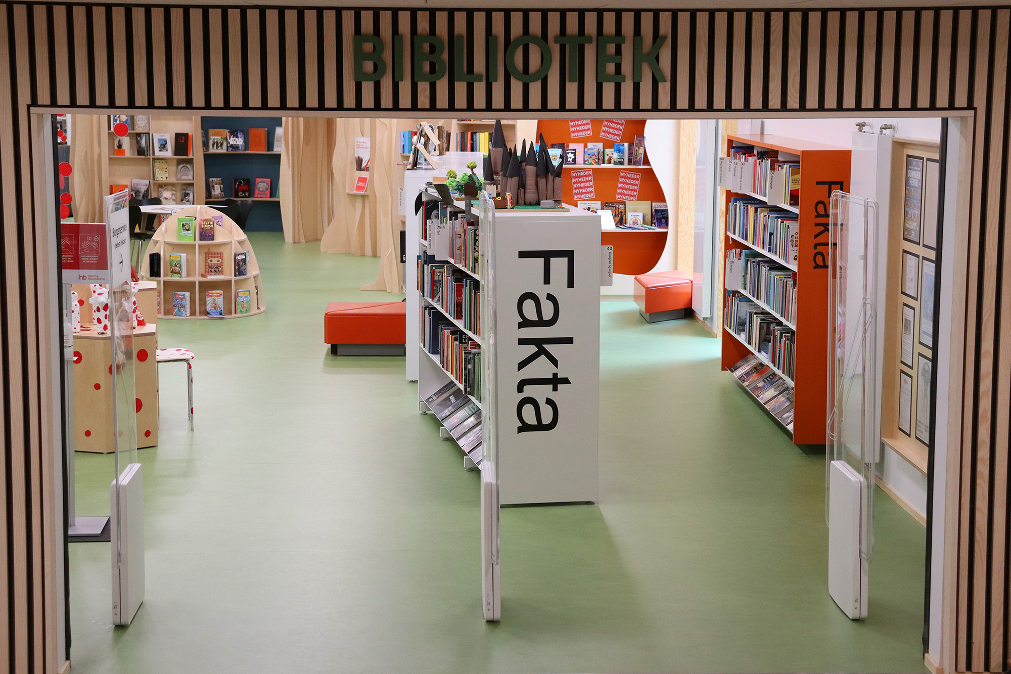 ”Biblioteket er tæt på hjerterummet for hele bygningen og bliver brugt mere, fordi det er en del af en større bygning. Det er – og skal være – børnene, der fylder meget, men der skal stadig være plads til alle. Vi arbejder meget med biblioteket som et organisk rum, der skal kunne tilbyde noget ekstra og overraskende. Det synes vi, i høj grad er lykkes,” fortæller bibliotekar Frederik Christian Nielsen.