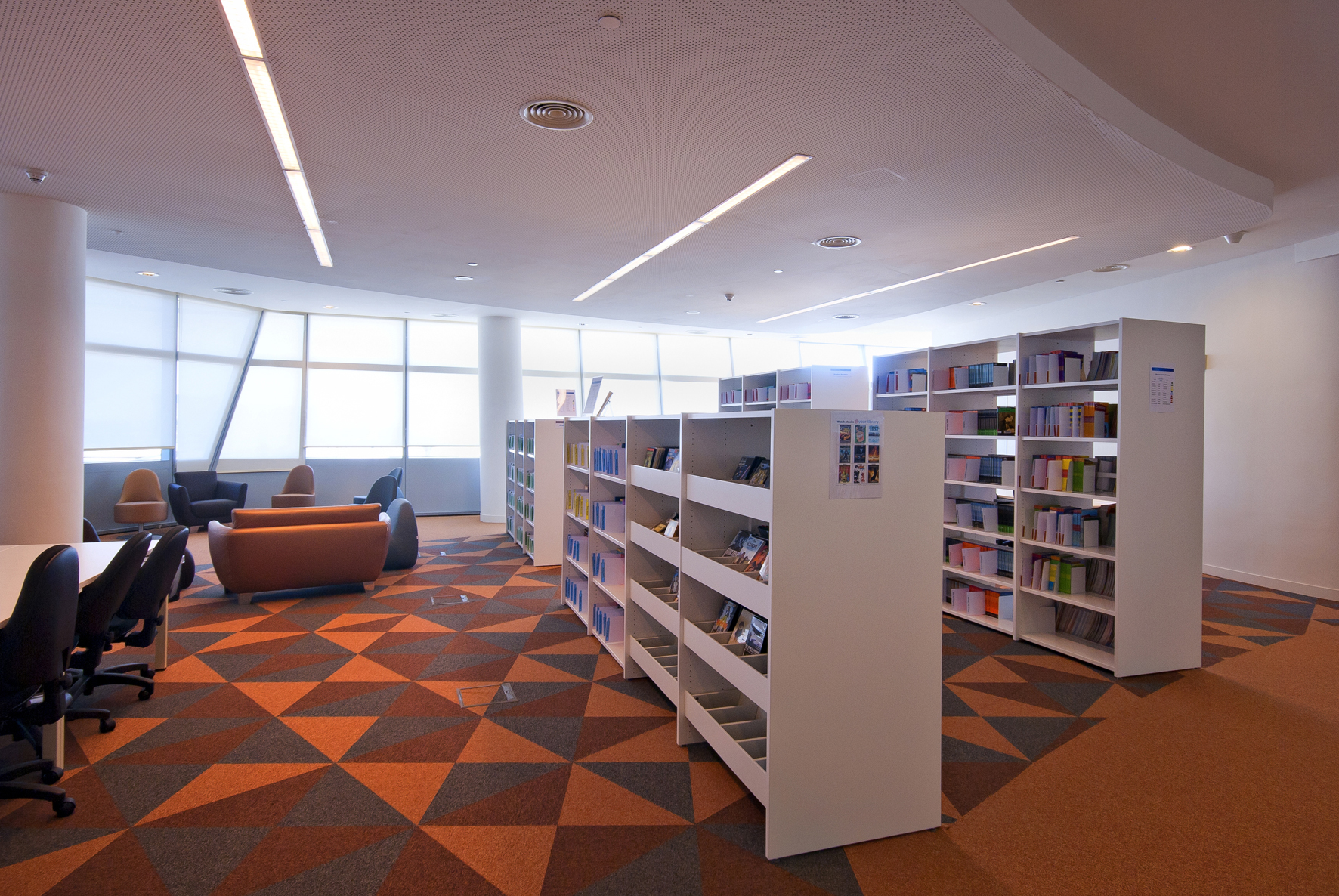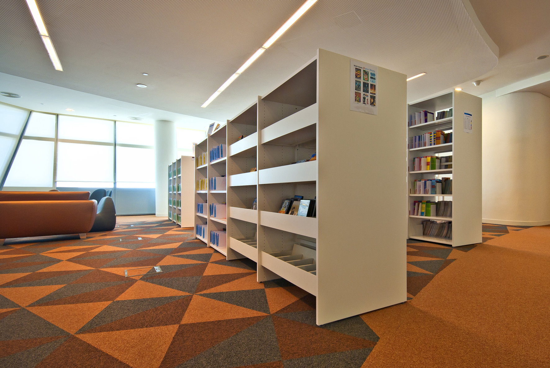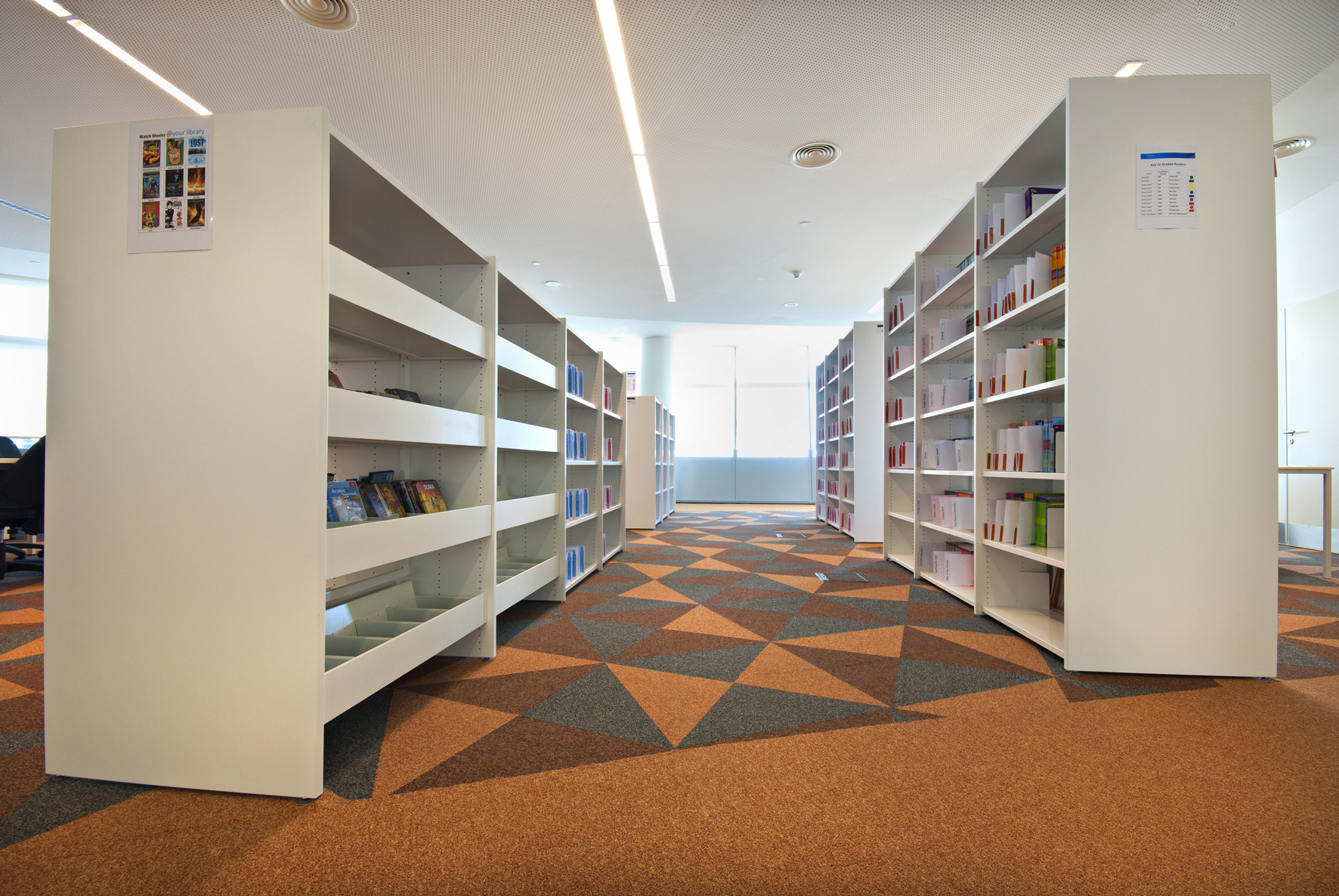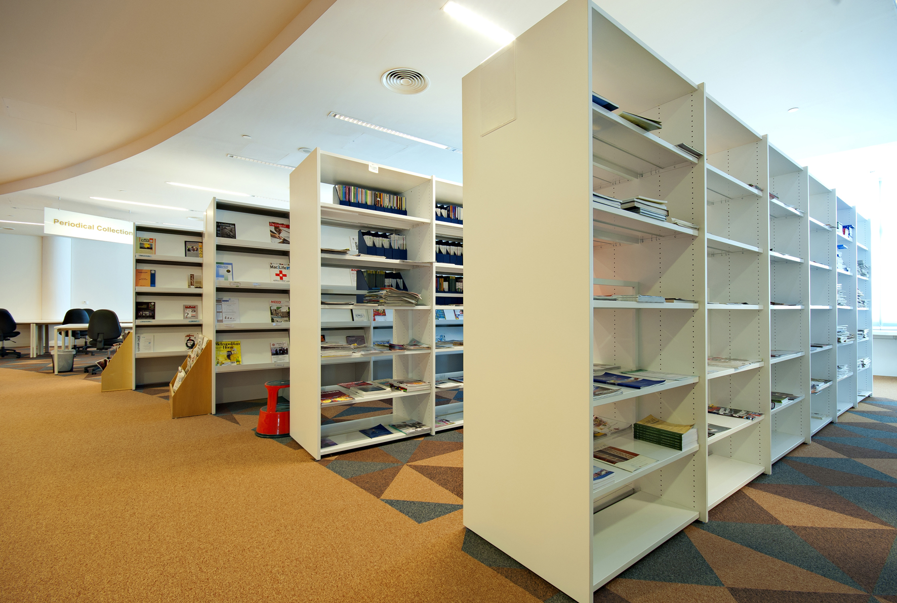 Den fire etagers biblioteksbygning er formet som et gradueret amfiteater, baseret på designet af US Library of Congress. Når du træder ind, møder du en ren og afslappende atmosfære, som er skabt med BCI’s Slimline reol system i hvid finish. En 18.000 m2 stor oase for viden og information.