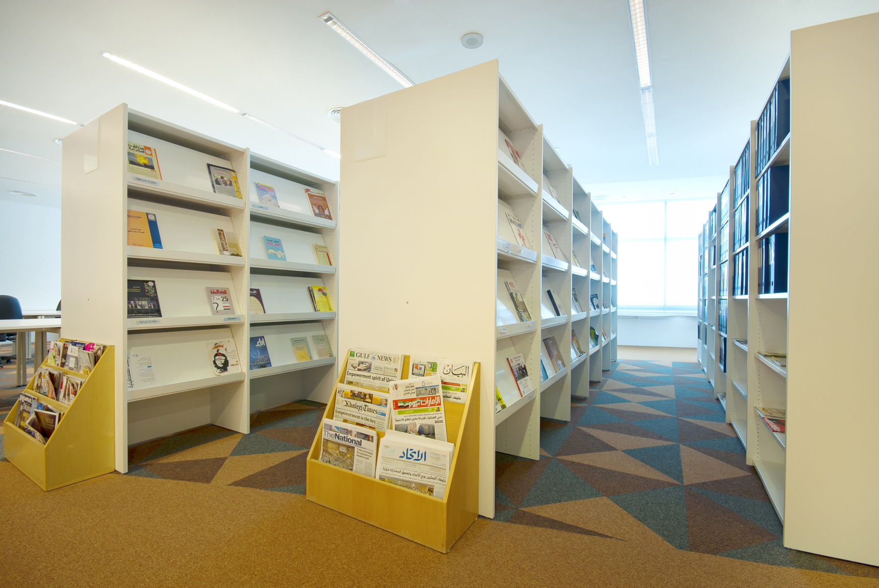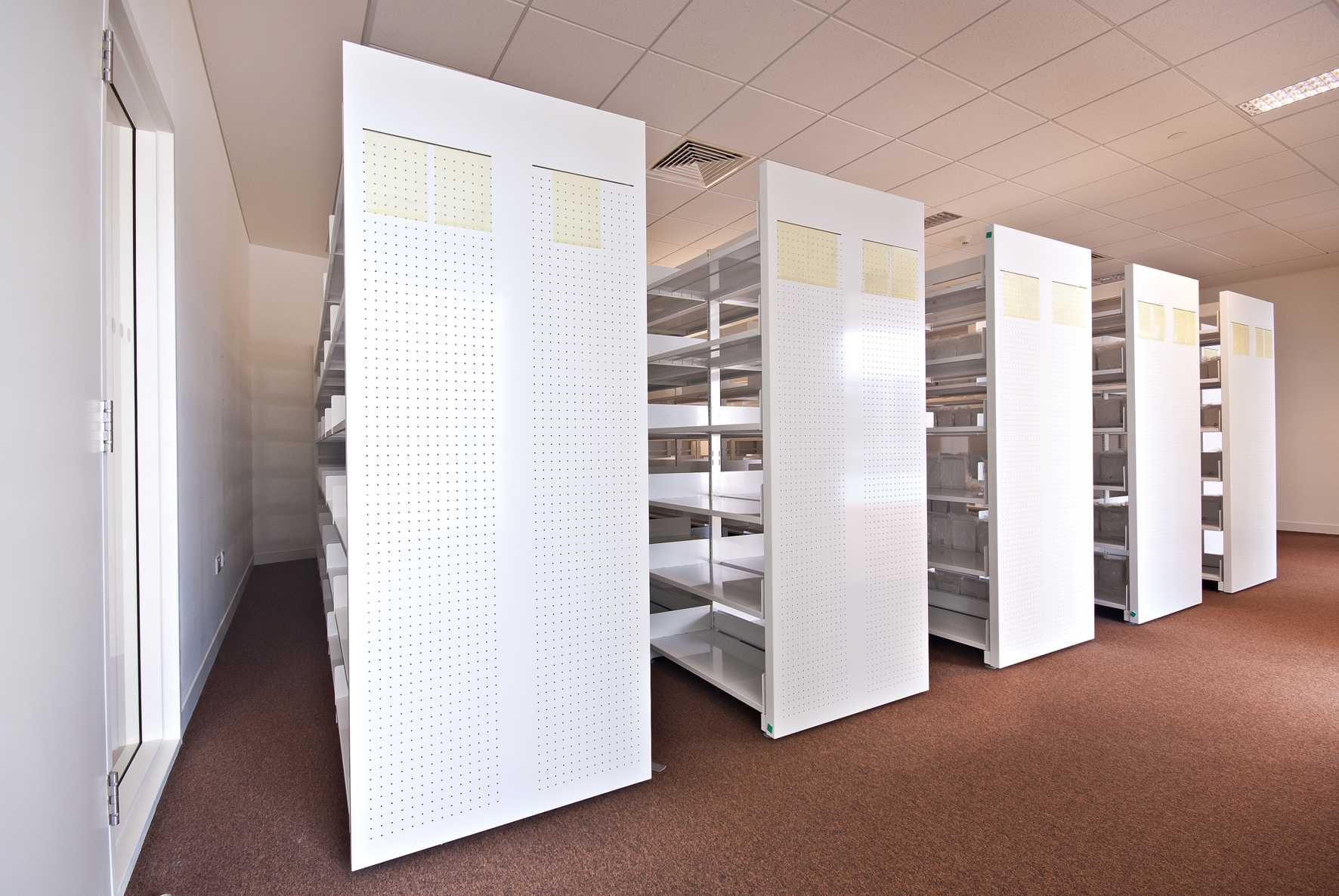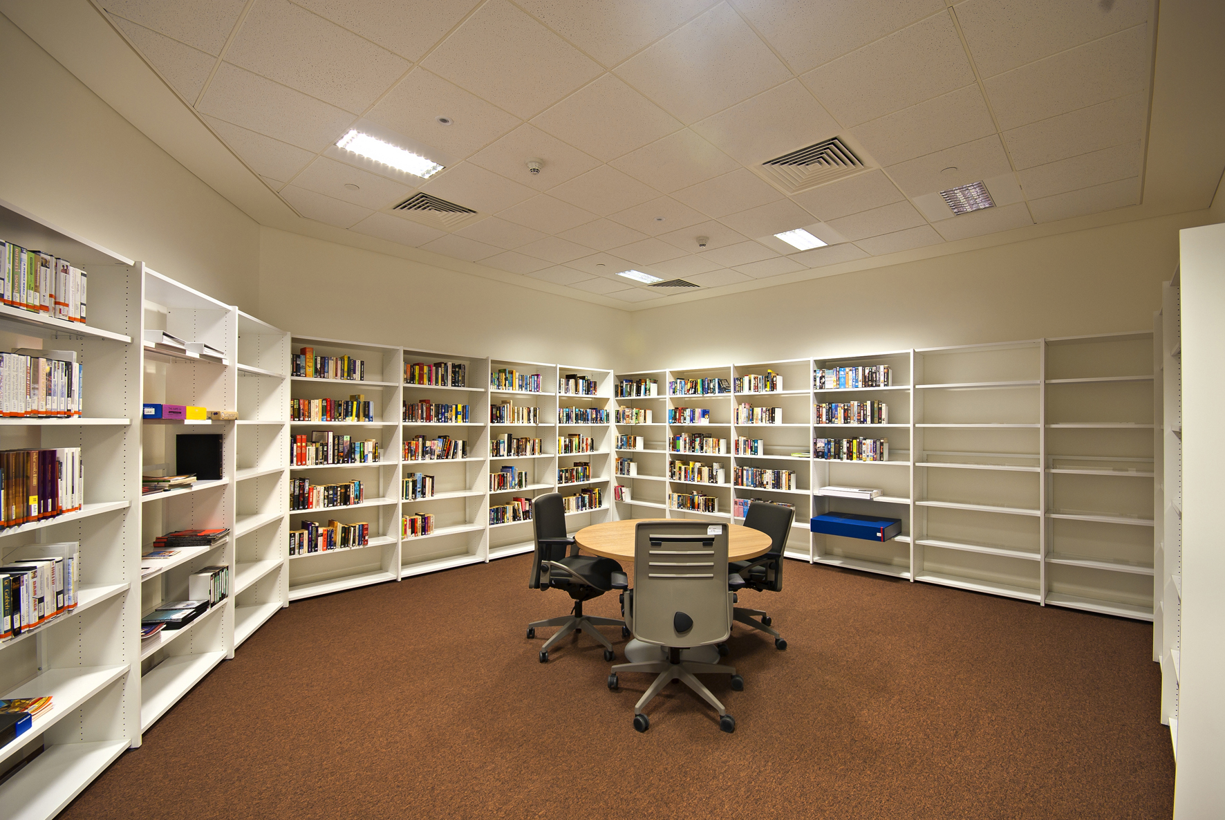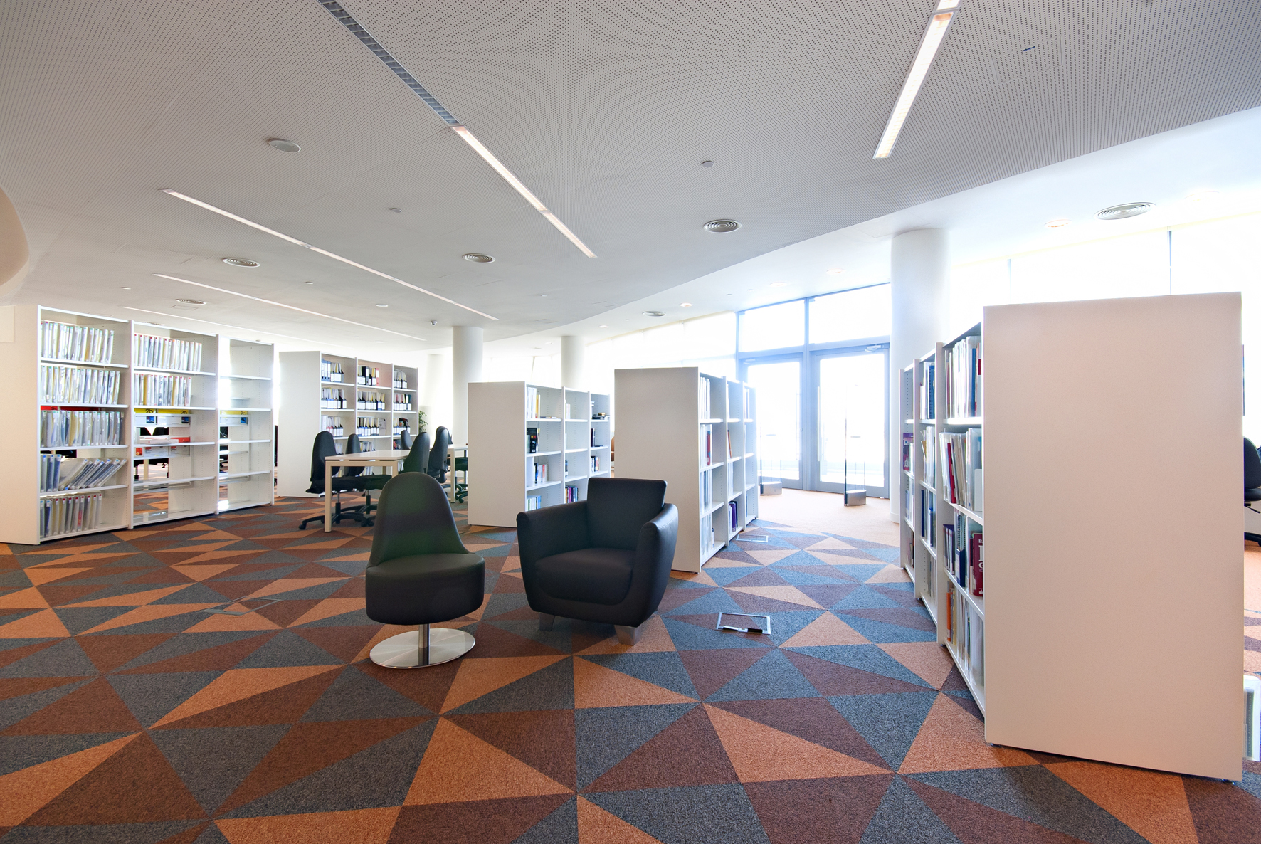 Den fire etagers biblioteksbygning er formet som et gradueret amfiteater, baseret på designet af US Library of Congress. Når du træder ind, møder du en ren og afslappende atmosfære, som er skabt med BCI’s Slimline reol system i hvid finish. En 18.000 m2 stor oase for viden og information.