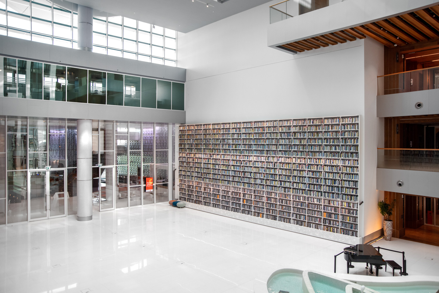 Bygningen indeholder ni forskellige biblioteker med blandt andet medier og kunst, fagbøger, internationale tidsskrifter, kort og atlas, børne- og ungdomsbøger samt en særlig samling af arkivmateriale. Derudover er der et inden- og udendørs amfiteater, et litterært museum og udstillingsrum, et konferencecenter, en to-etagers café og en gavebutik.