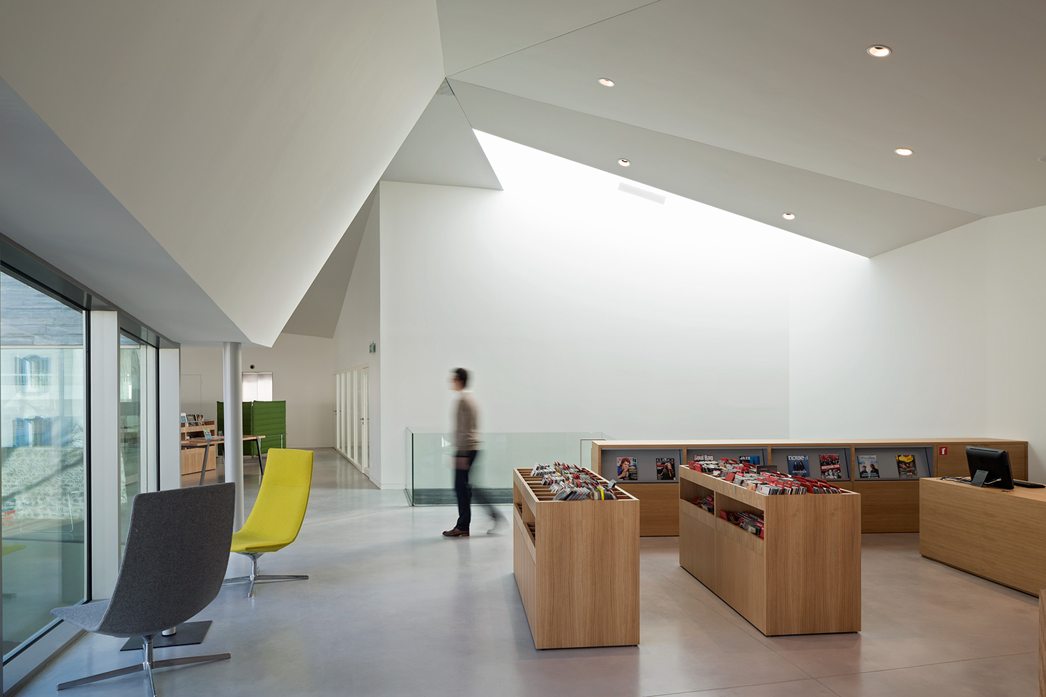 Møblerne, som er lavet specielt til dette bibliotek, reolsystemer i egetræ og hvidlakeret, er designet med fleksibilitet og tilpasning til fremtidige forandringer og udvikling, hvilket også karakteriserer vort standard produktsortiment.