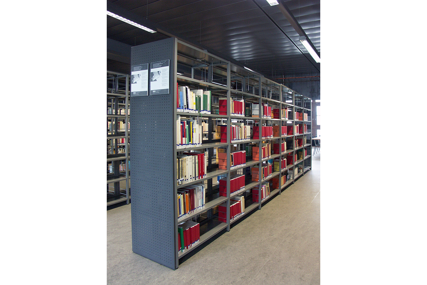 The five-storey building is located around an atrium and offers free access to a total of 250,000 media and 1,500 working spaces. The choice of the furniture was based upon special studies on function and durability of the individual parts. Our UNIFLEX shelves were chosen for their compatibility with the architectural design criteria in combination with the industrial-age architecture.